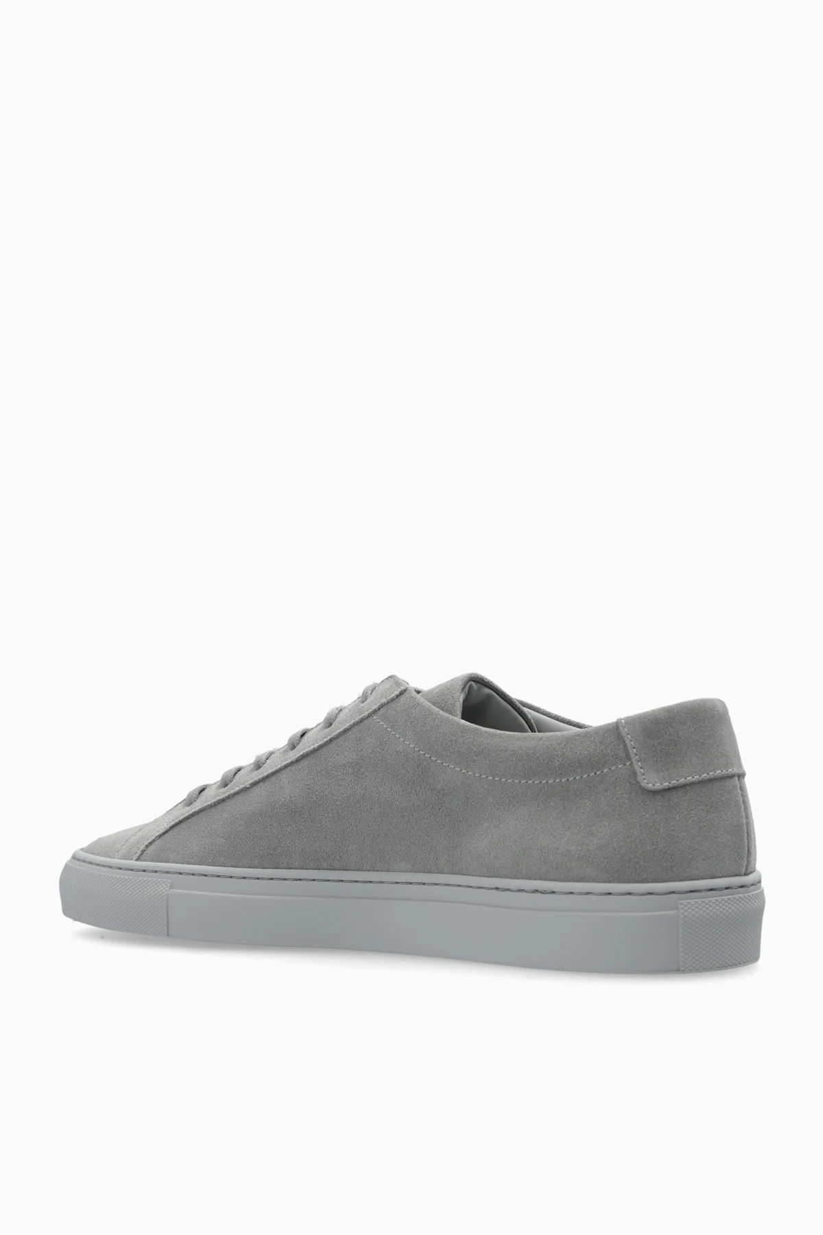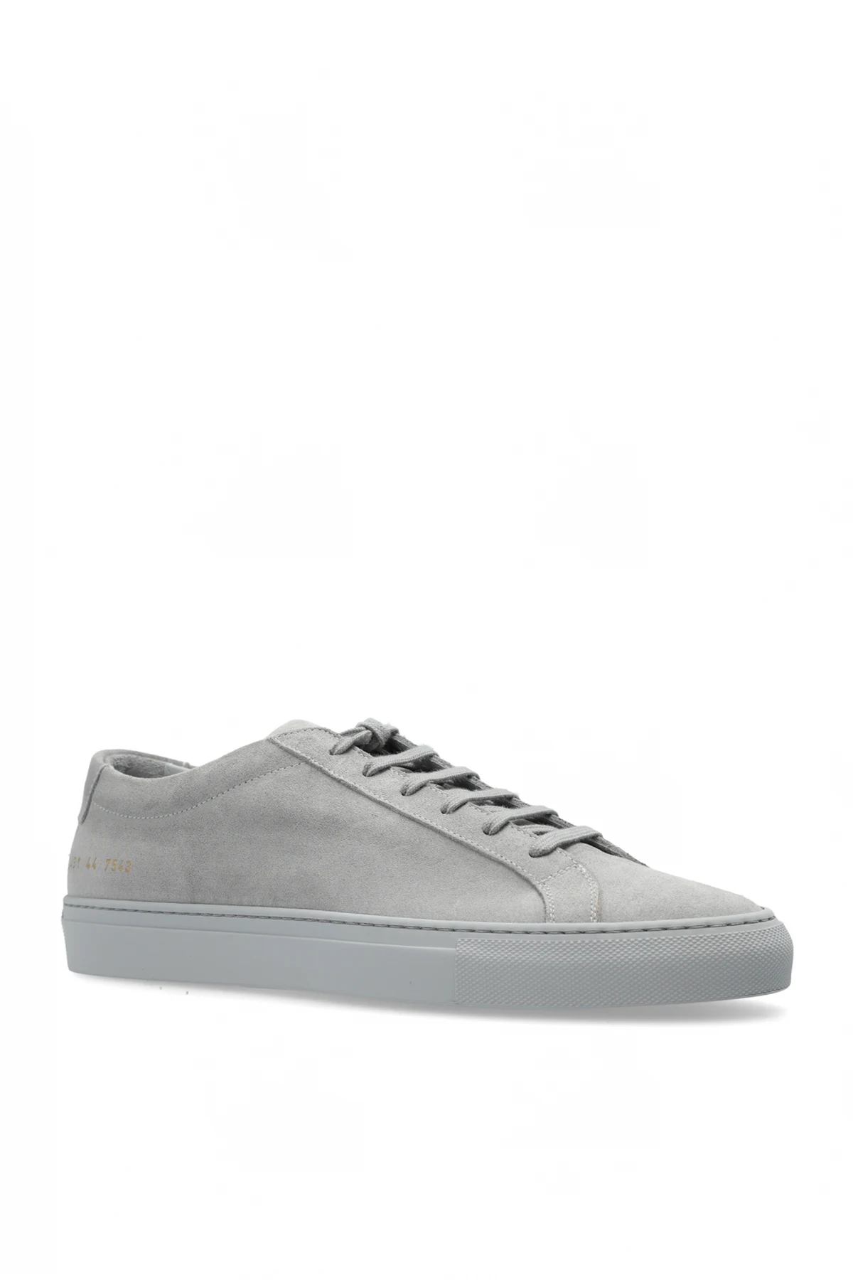 Introducing the exquisite Or.Achilles sneakers by the renowned brand Common Projects. These exclusive sports shoes are a testament to sophistication and impeccable craftsmanship. Color: The dominant gray hue bestows an elegant, versatile aesthetic. Material: Fashioned from the finest suede, these sneakers offer superior quality and durability. The suede finish enhances the luxurious appeal. Construction: Shape: Featuring a classic, low-profile silhouette, typical of low-top sneakers. Laces: Gray laces match the overall design, ensuring a cohesive look. Sole: A durable gray rubber sole provides exceptional comfort and resilience. Details: Logo: A gold print near the heel showcases the model number and size, a signature of Common Projects. Interior: The interior, also gray, features a gold imprint of the brand name \"COMMON PROJECTS\" and \"MADE IN ITALY\". Why Choose This Product? Exceptional Italian craftsmanship by Flavio Girolami and Prathan Poopat. Luxurious suede material for a premium look and feel. Timeless, versatile gray color pairs effortlessly with various outfits. Iconic gold logo detail that signifies exclusivity. Unmatched comfort and durability with a rubber sole. Experience minimalist design and unparalleled quality with the Or.Achilles sneakers, available exclusively at VITKAC.