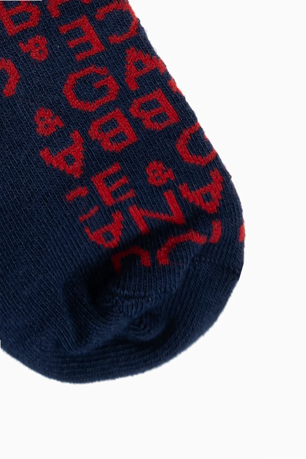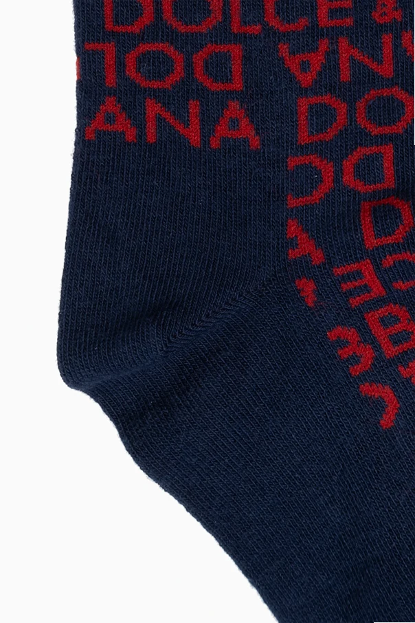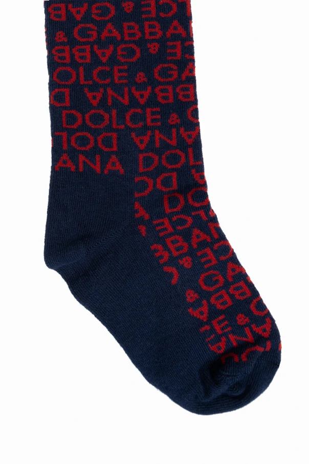 Crafted in a sophisticated navy blue hue, these tights are adorned with bold red "DOLCE & GABBANA" lettering, creating a dynamic and stylish pattern that covers the entire garment. The elastic blend of polyamide, cotton, and elastane ensures a comfortable and flexible fit, perfect for active children.