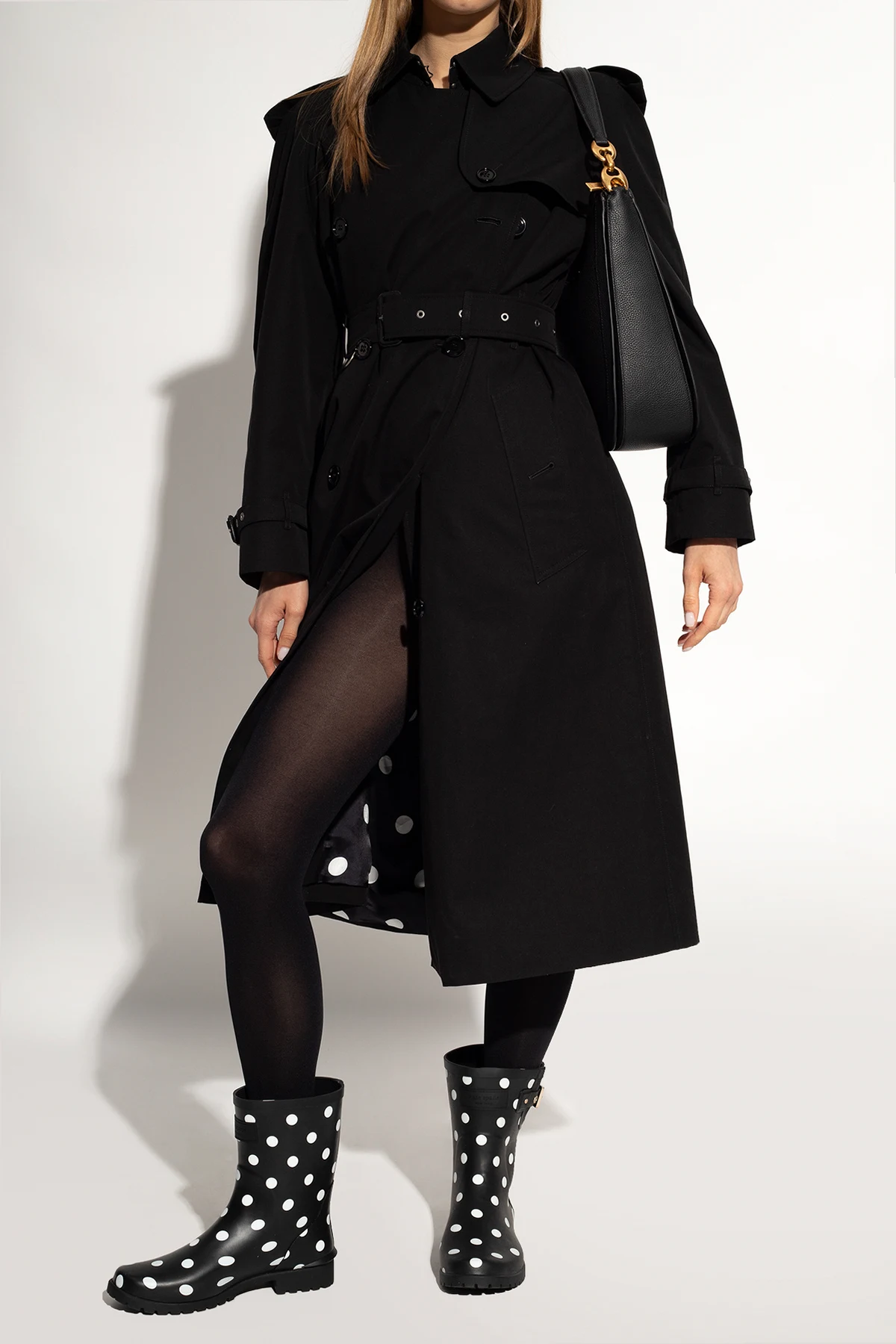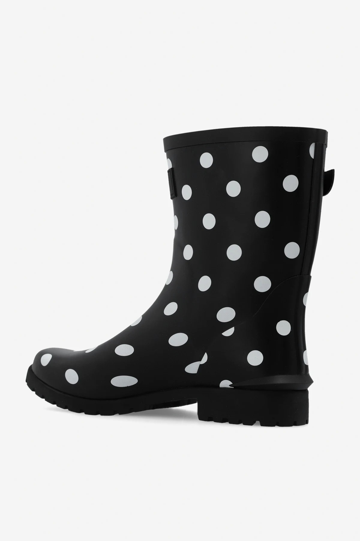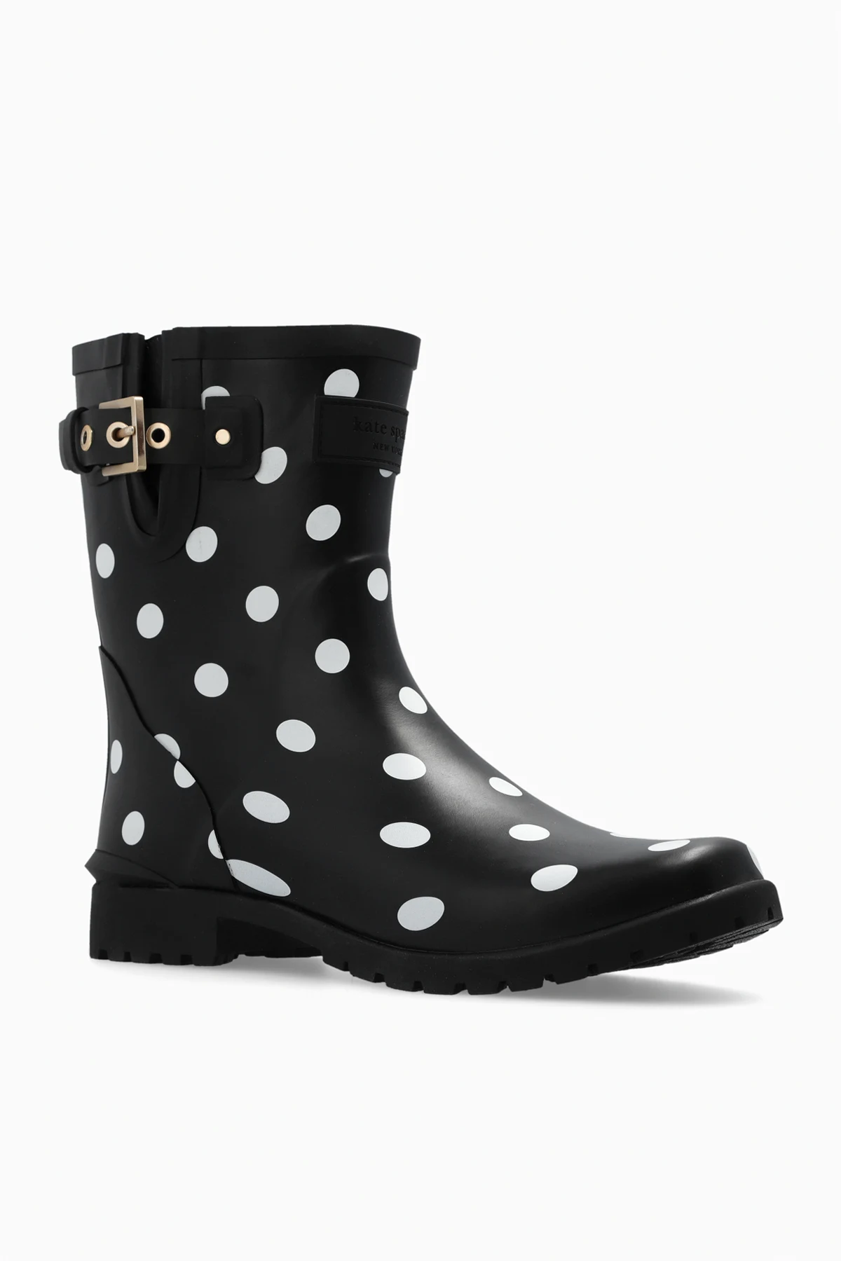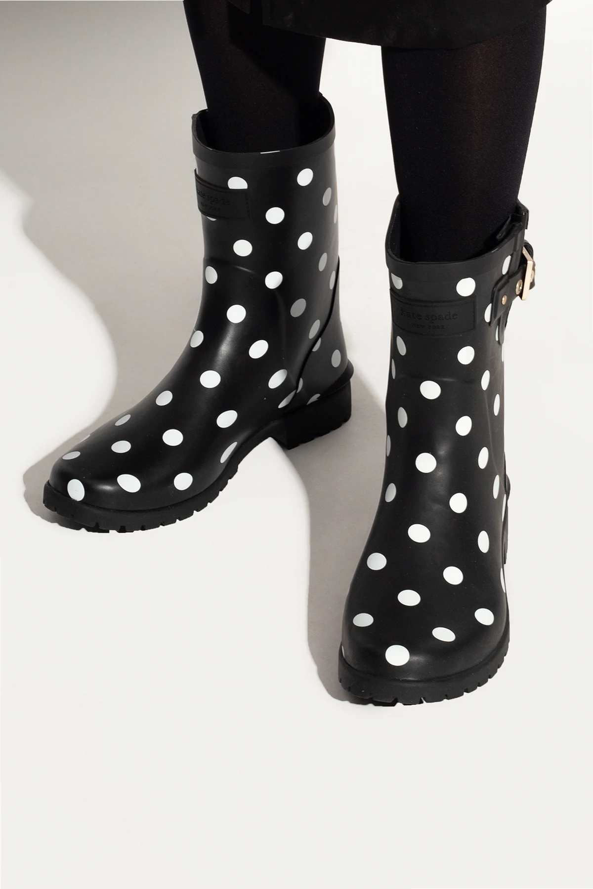 Black ‘Carina’ rain boots from Kate Spade. Fastened with an adjustable buckle strap, this pair features a white polka dot pattern and black rubber sole.