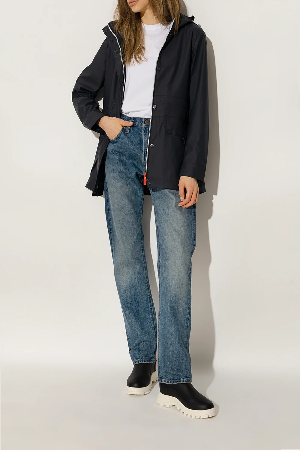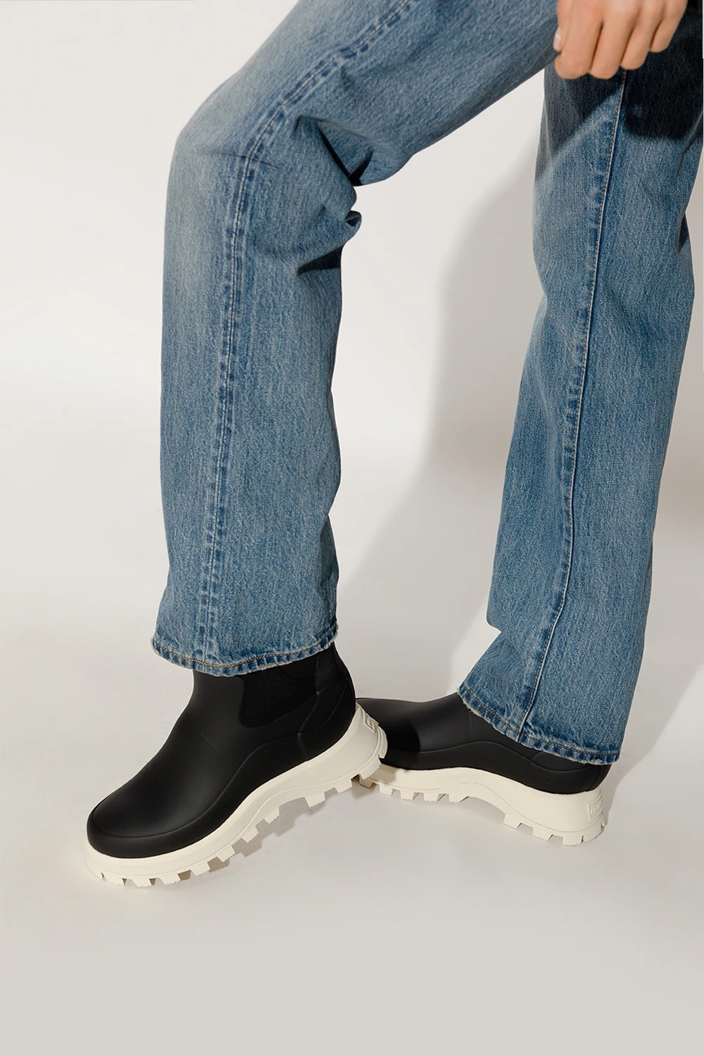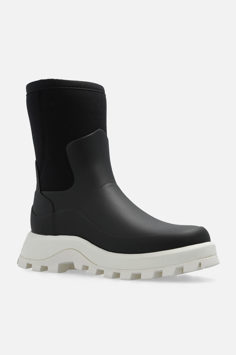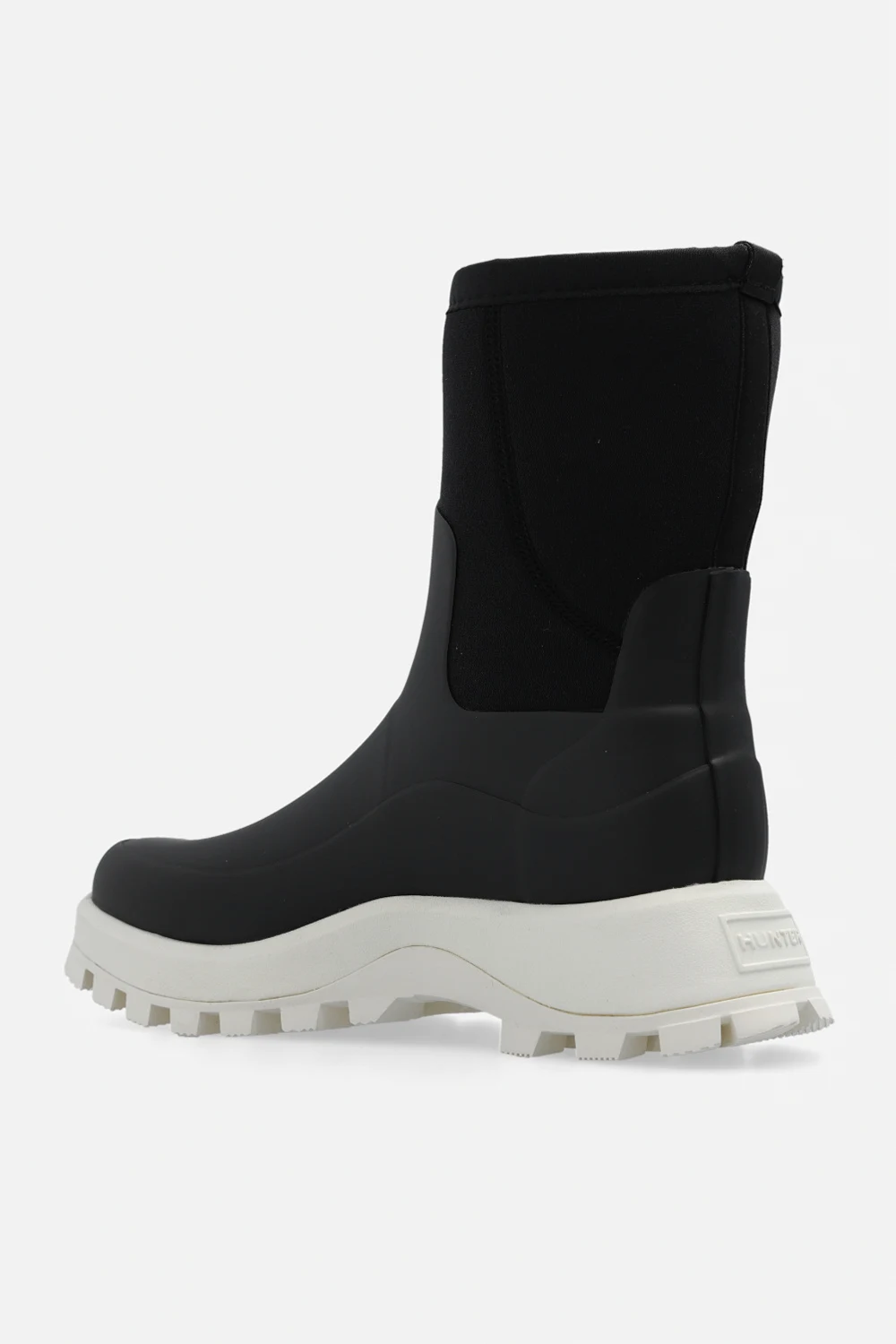 Black ‘City Explorer’ vegan rain boots from Hunter. This pair has a natural rubber and insulating neoprene upper, raised logo at the back and cream rubber sole.