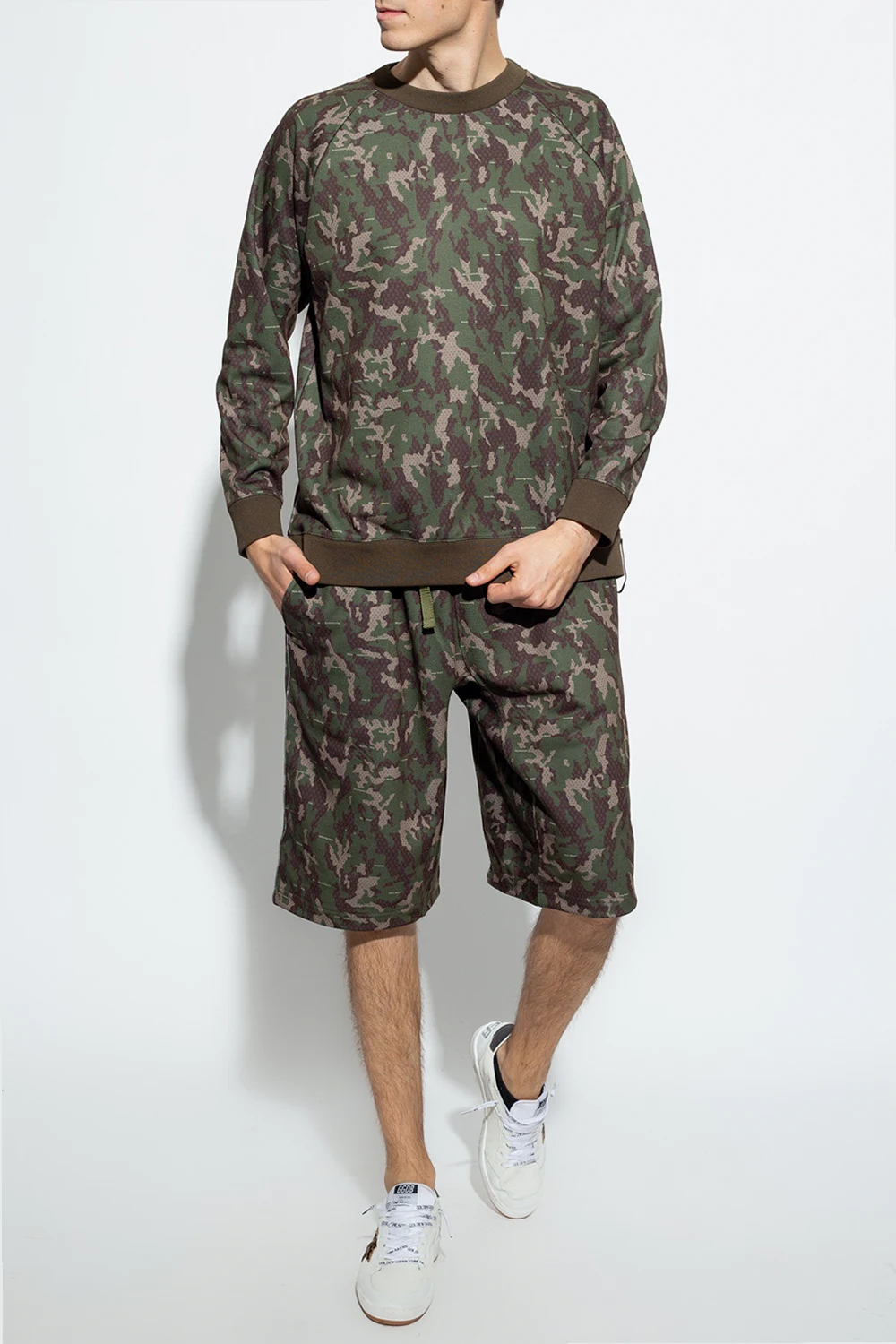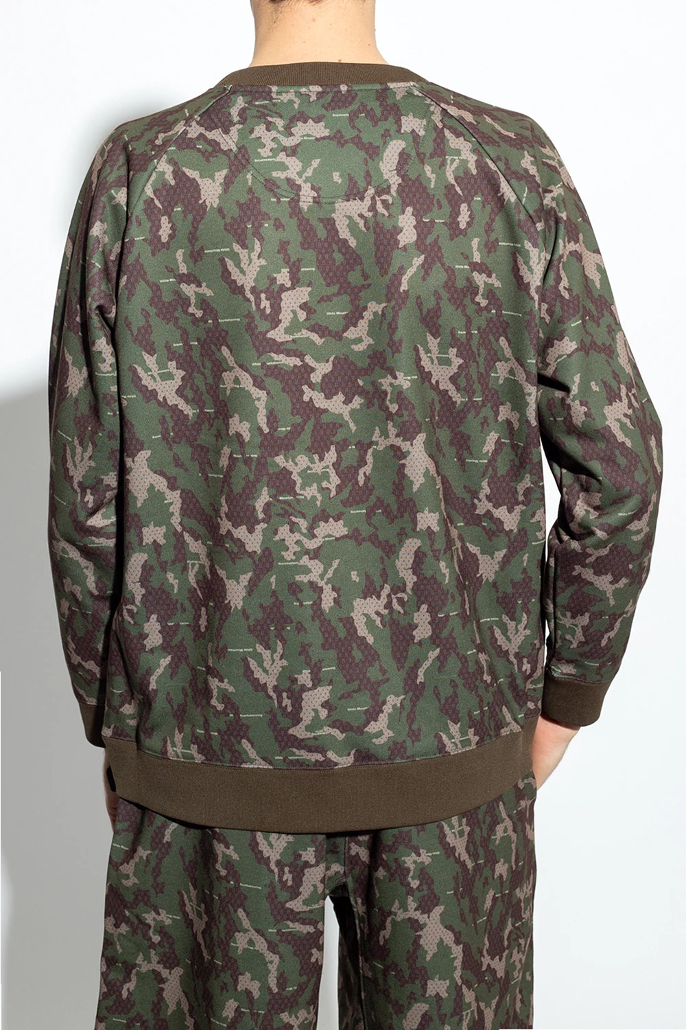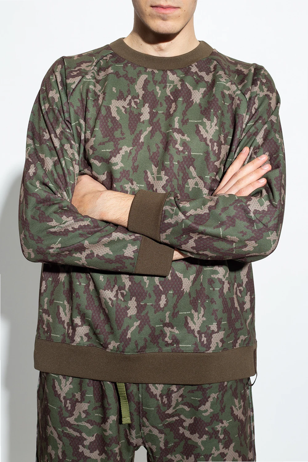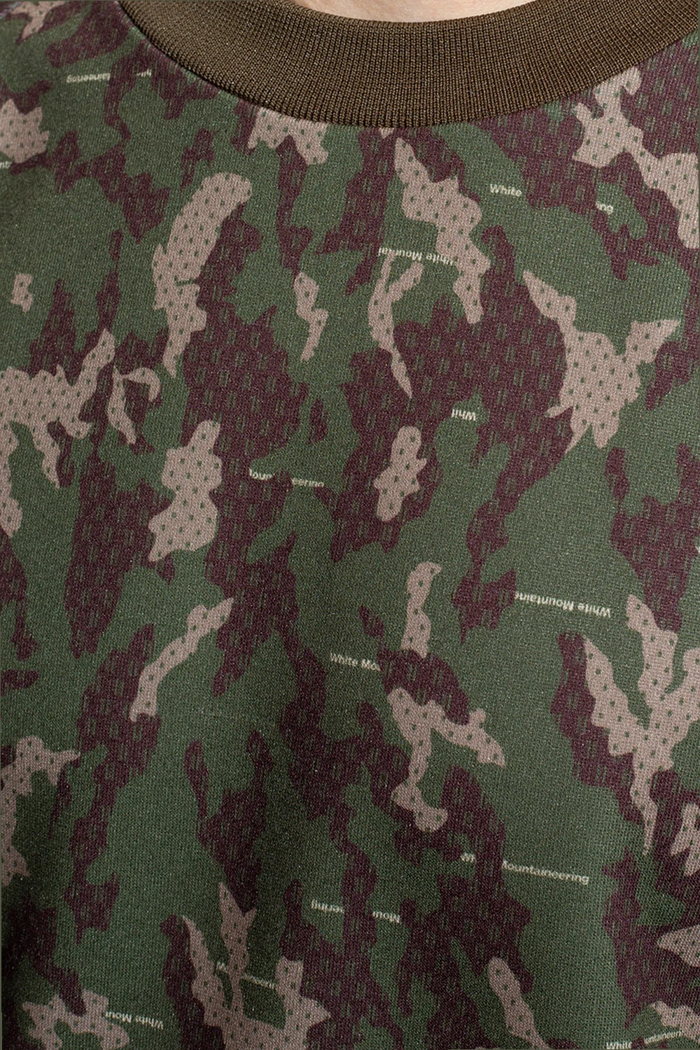 Green, brown and beige crewneck sweatshirt from White Mountaineering. This garment is enriched by a camo pattern and ribbed trims at the neck, hem and cuffs.