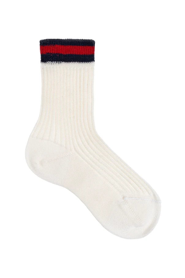 Introducing the Cotton Socks from the esteemed Gucci Kids collection — a sublime fusion of comfort and style. These pristine white socks, crafted from the finest cotton, offer unparalleled breathability and softness, ensuring the utmost comfort for your child. The classic design is elevated by the vibrant red and navy stripes on the ribbed cuff, imparting an elegant touch.