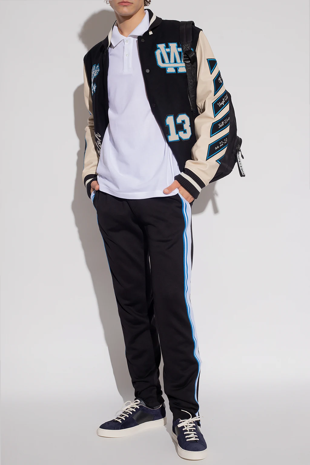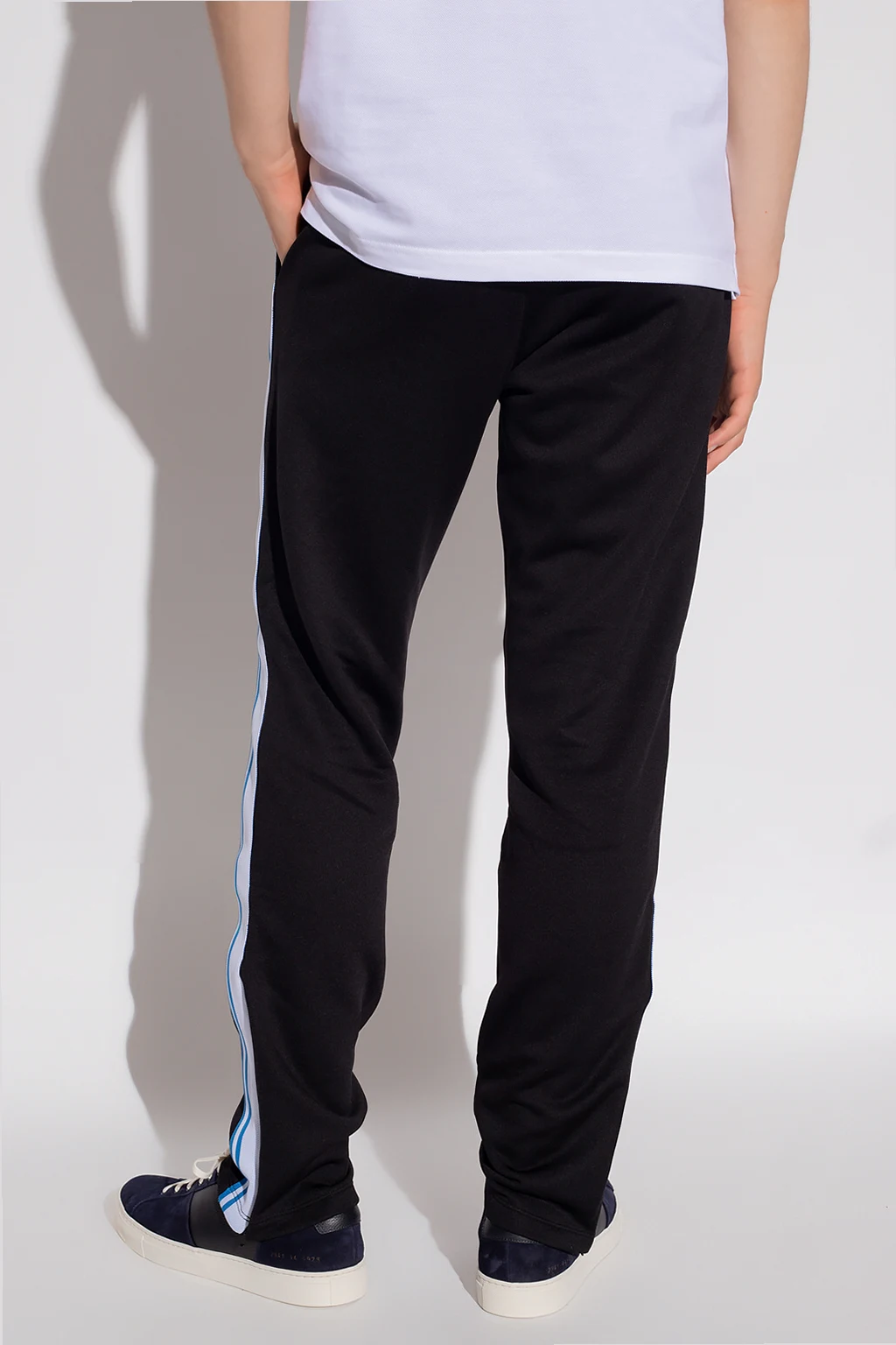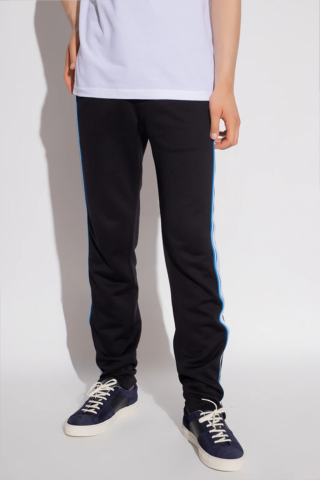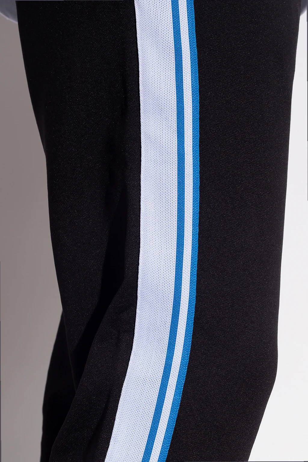 Black trousers from Iceberg. Embellished with white and blue side panels and an embroidered logo, this pair features a drawstring waistband, four slip pockets and straight legs with zip cuffs.