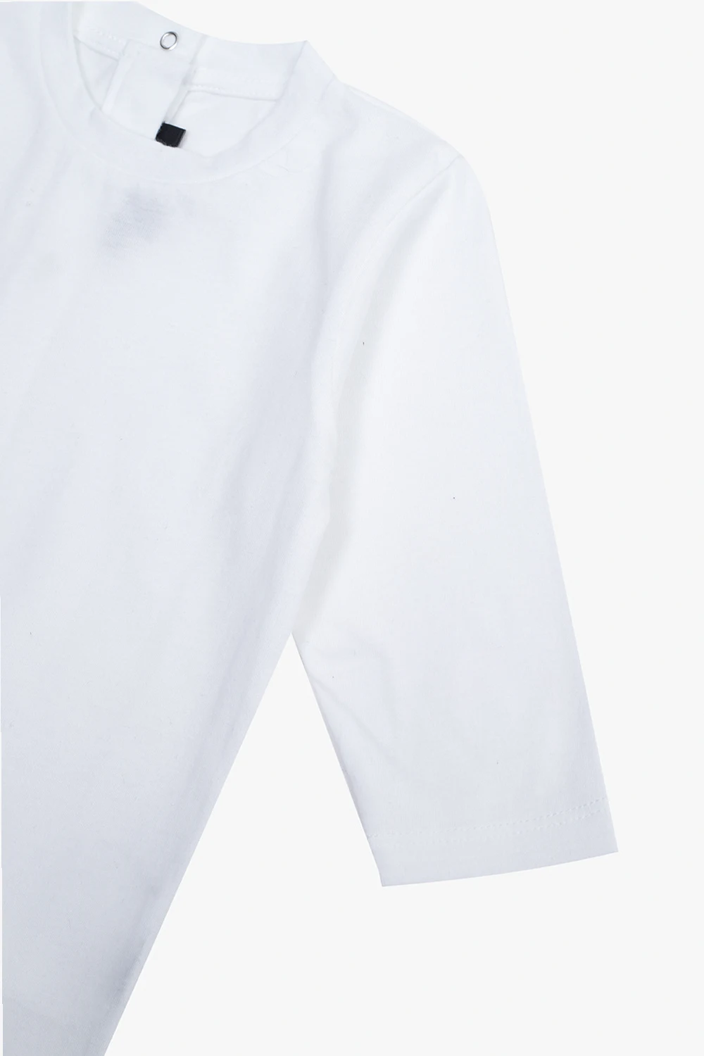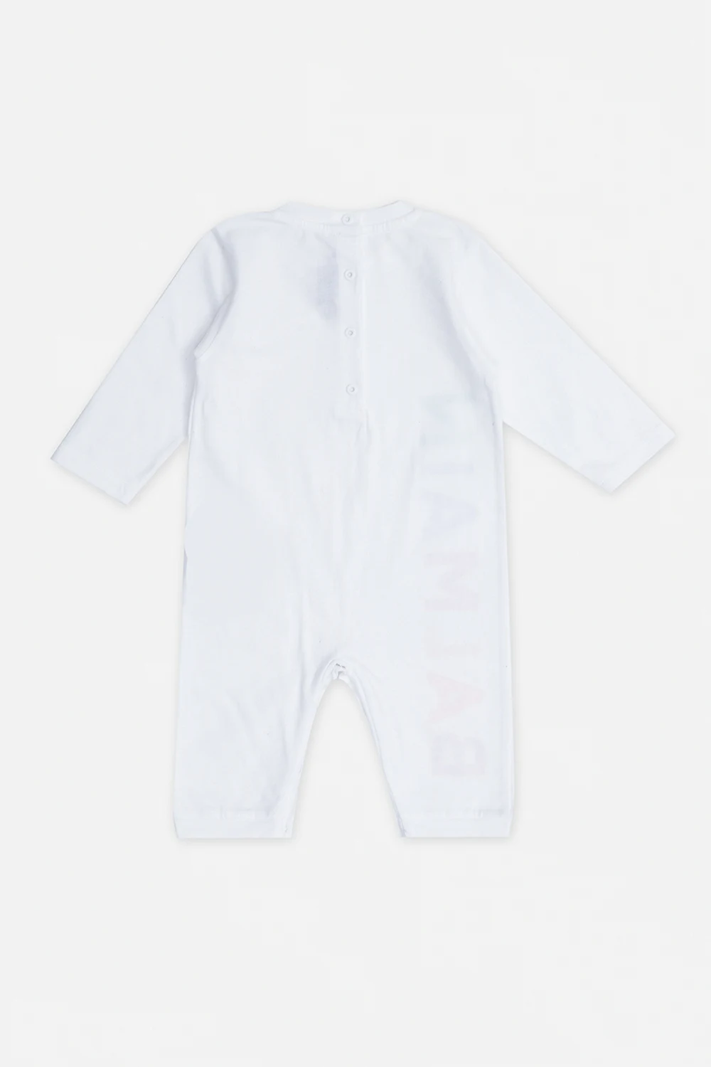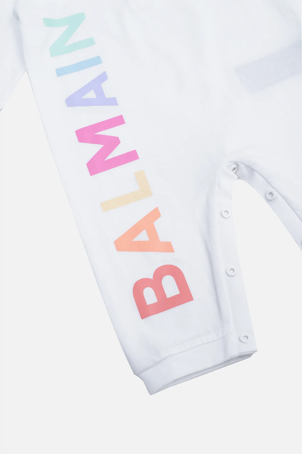 White jumpsuit from Balmain. Made of cotton, this long sleeve design fastens with snap buttons and is decorated with a multicolored logo motif.