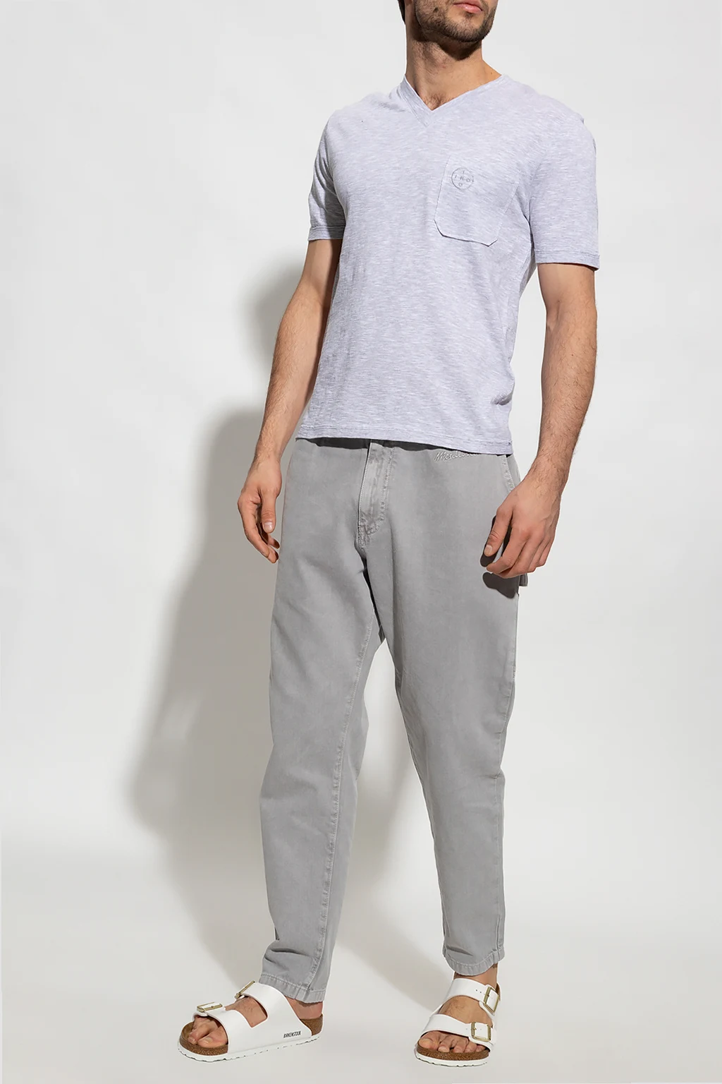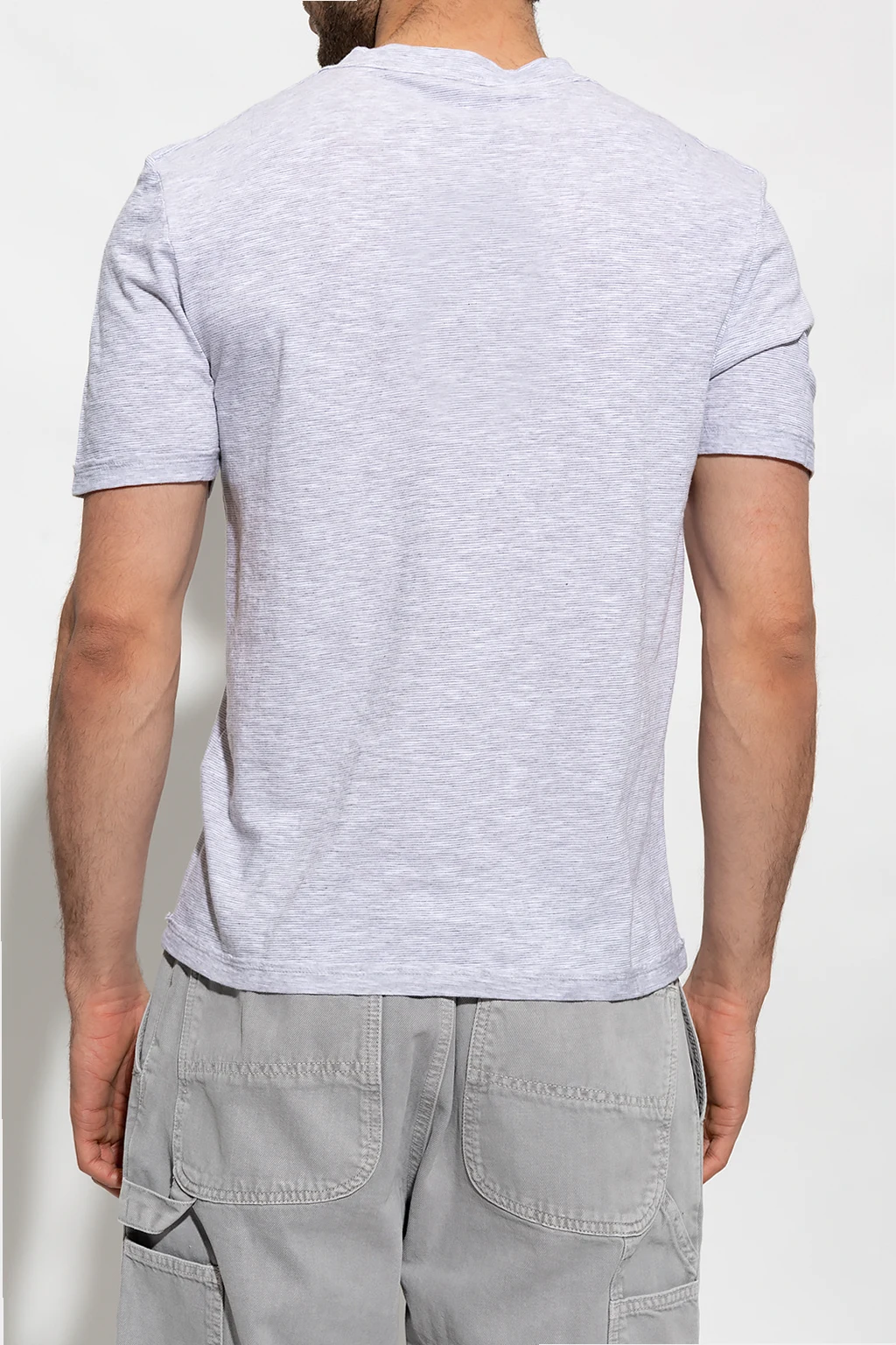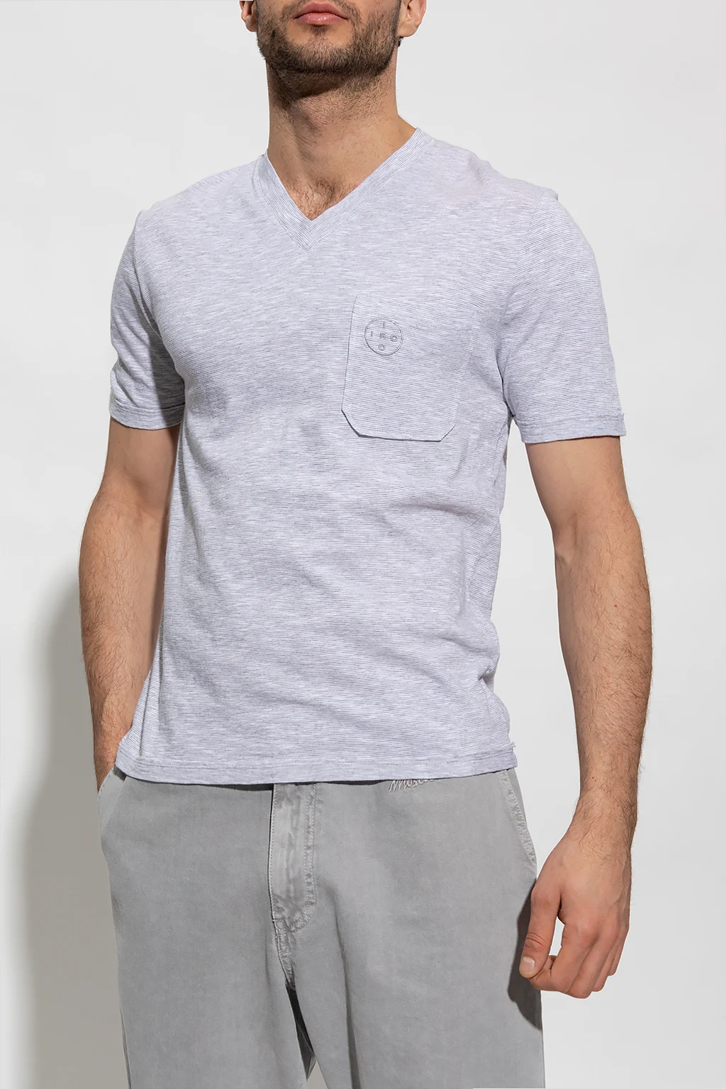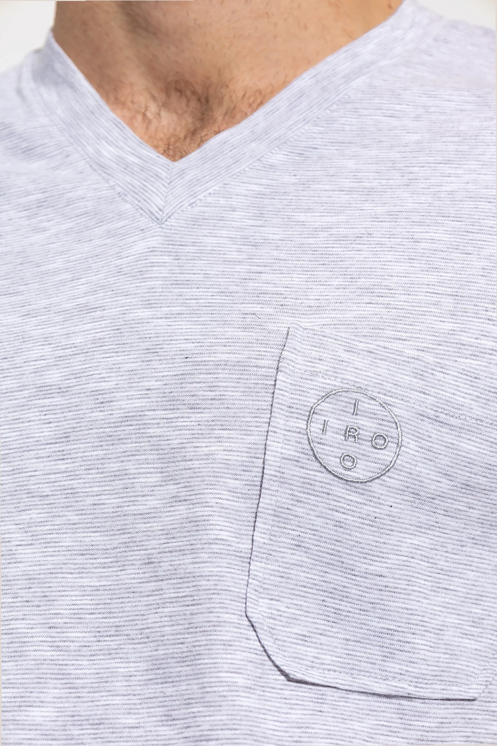White and light grey ‘Velio’ V-neck T-shirt from Iro. Crafted from ribbed cotton, this short sleeve design features a navy logo embroidery and front pocket.