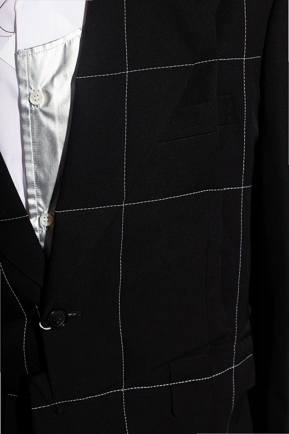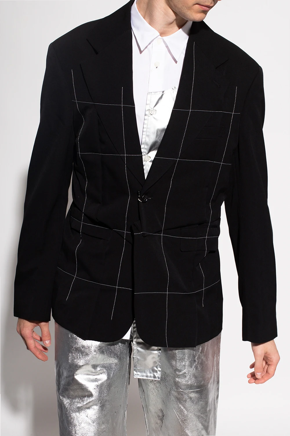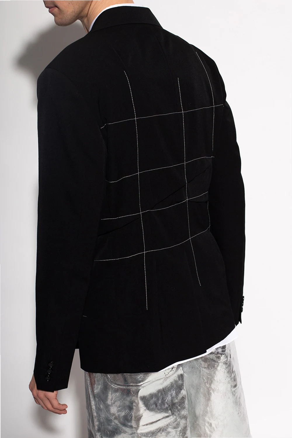 Black blazer from Comme des Garçons Homme Plus. Made of wool, this style fastens via buttons and features notch lapels, contrasting white stitching details and a single vent on the back.