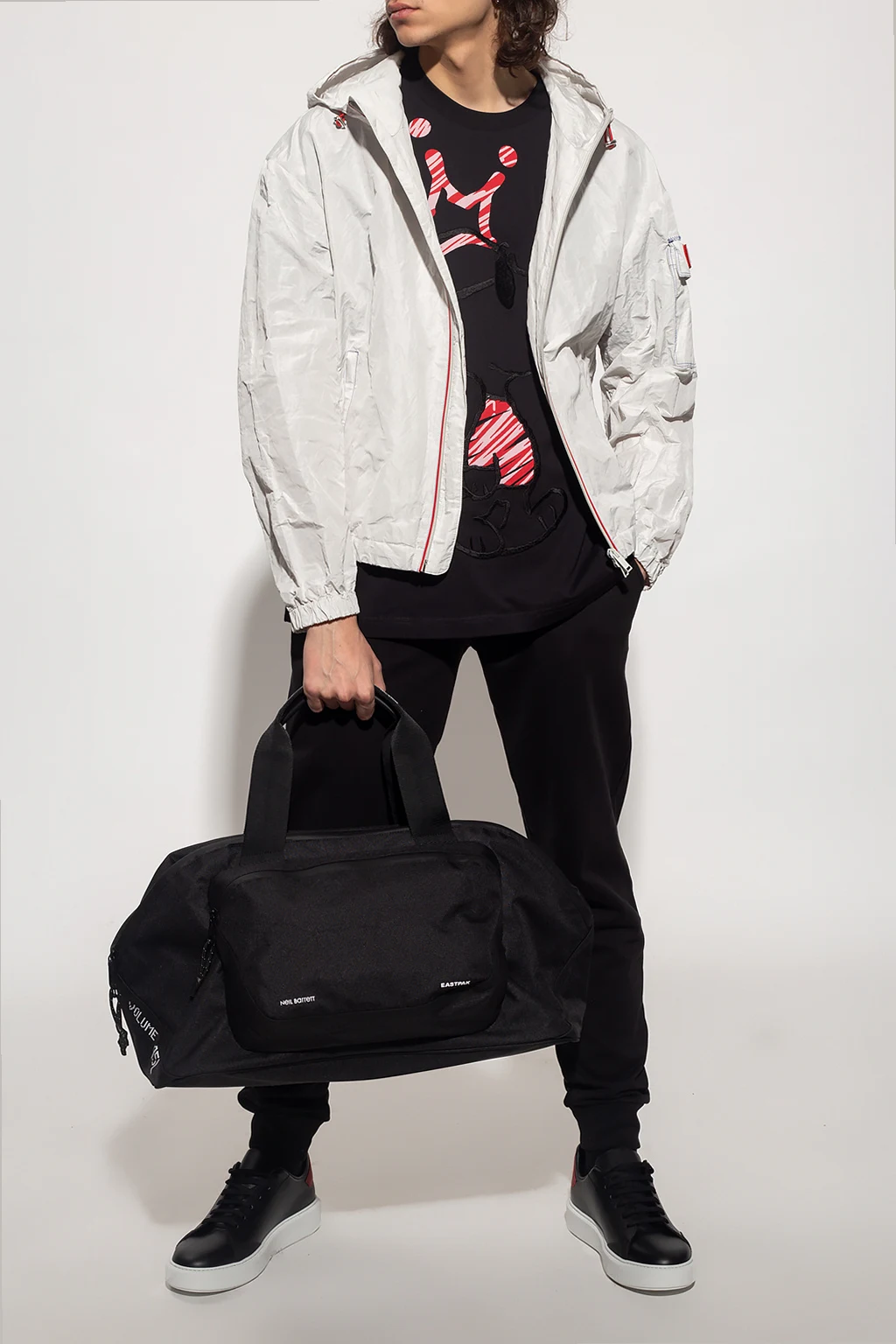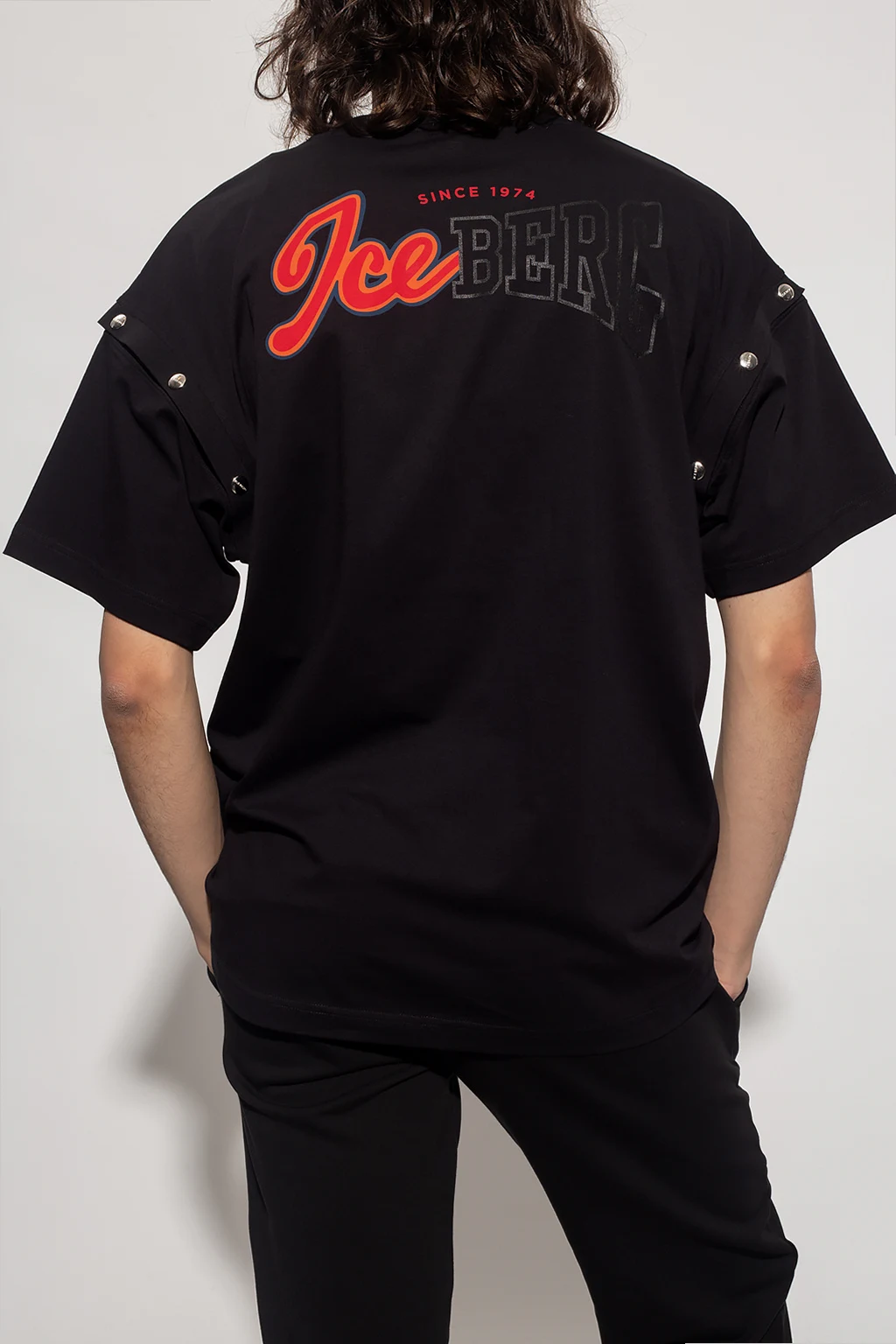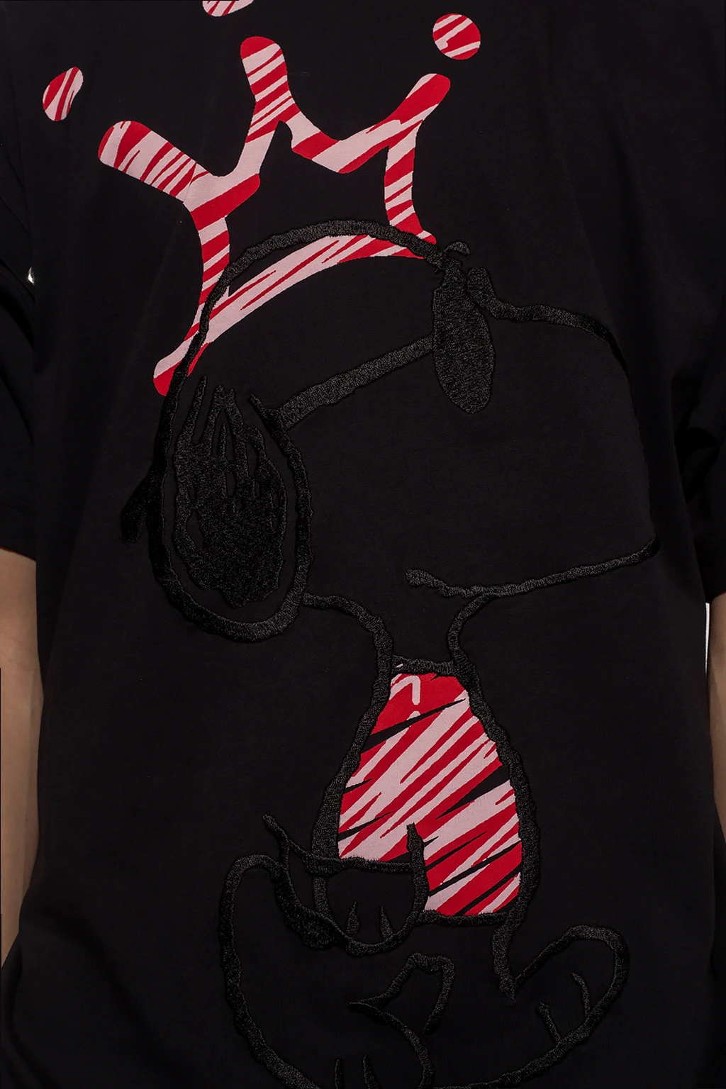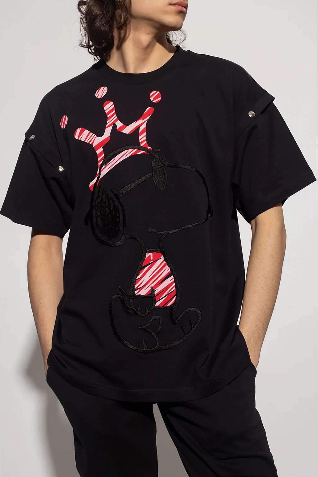 Black crewneck T-shirt from Iceberg. Made of cotton, this style features detachable sleeves, a pink, red and black graphic print with a Snoopy motif on the front and a colourful logo print at the back.