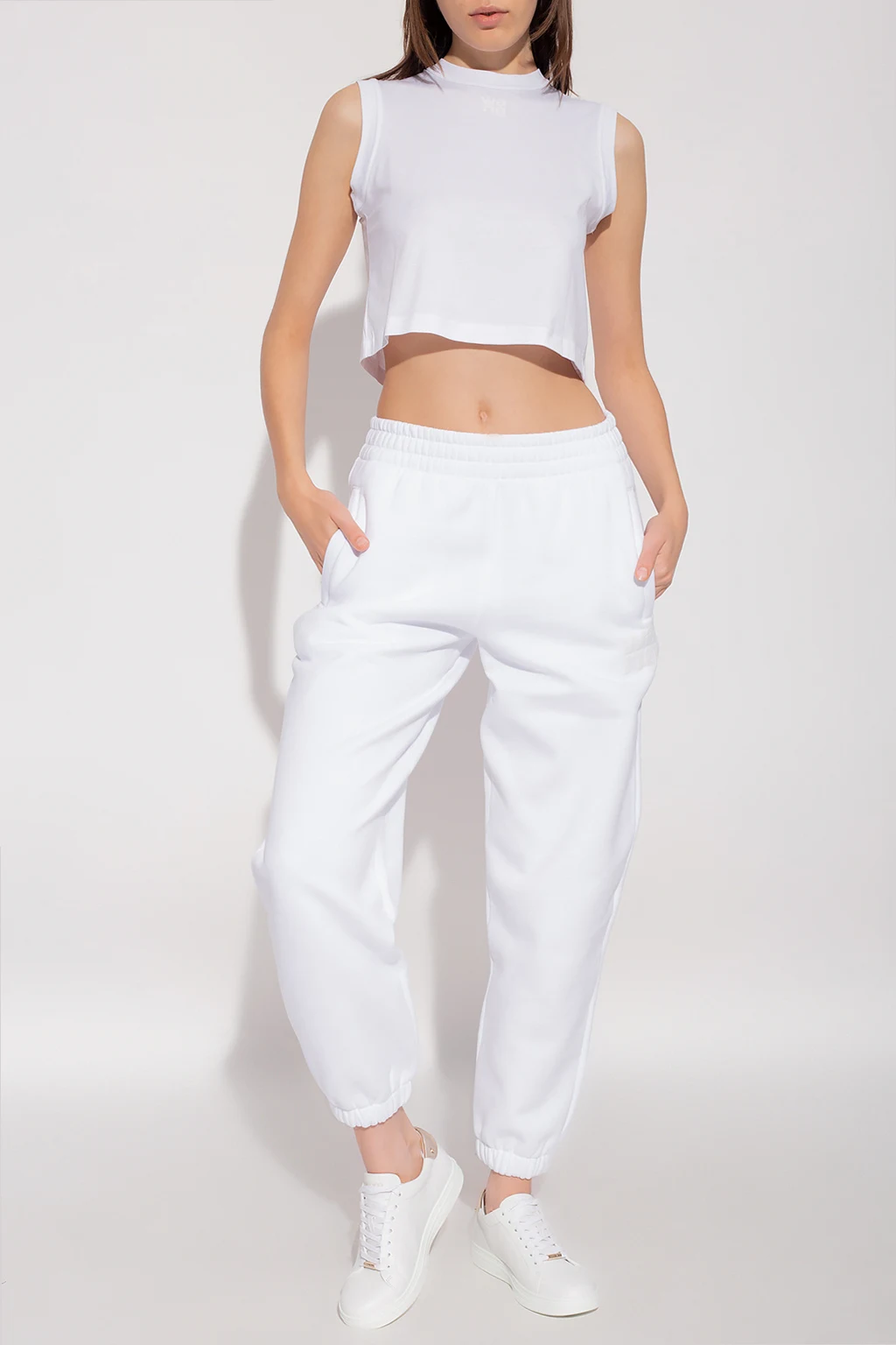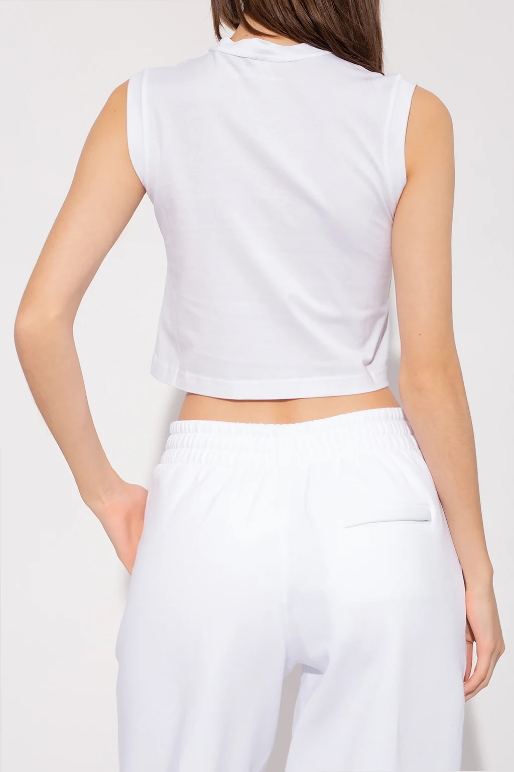 White tank top from T by Alexander Wang. Made of cotton with a cropped silhouette, this style features a round neck and white logo detailing on the front.