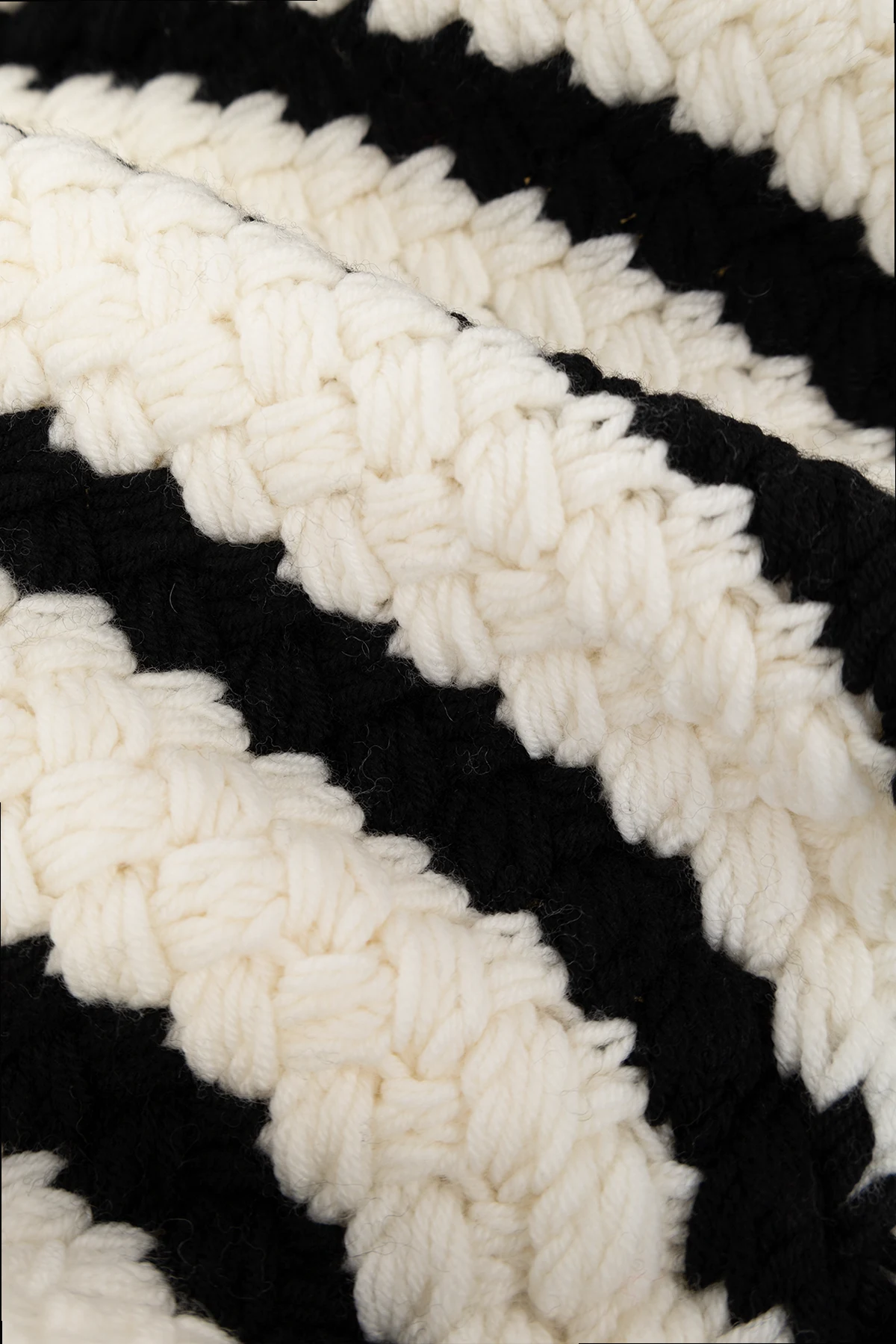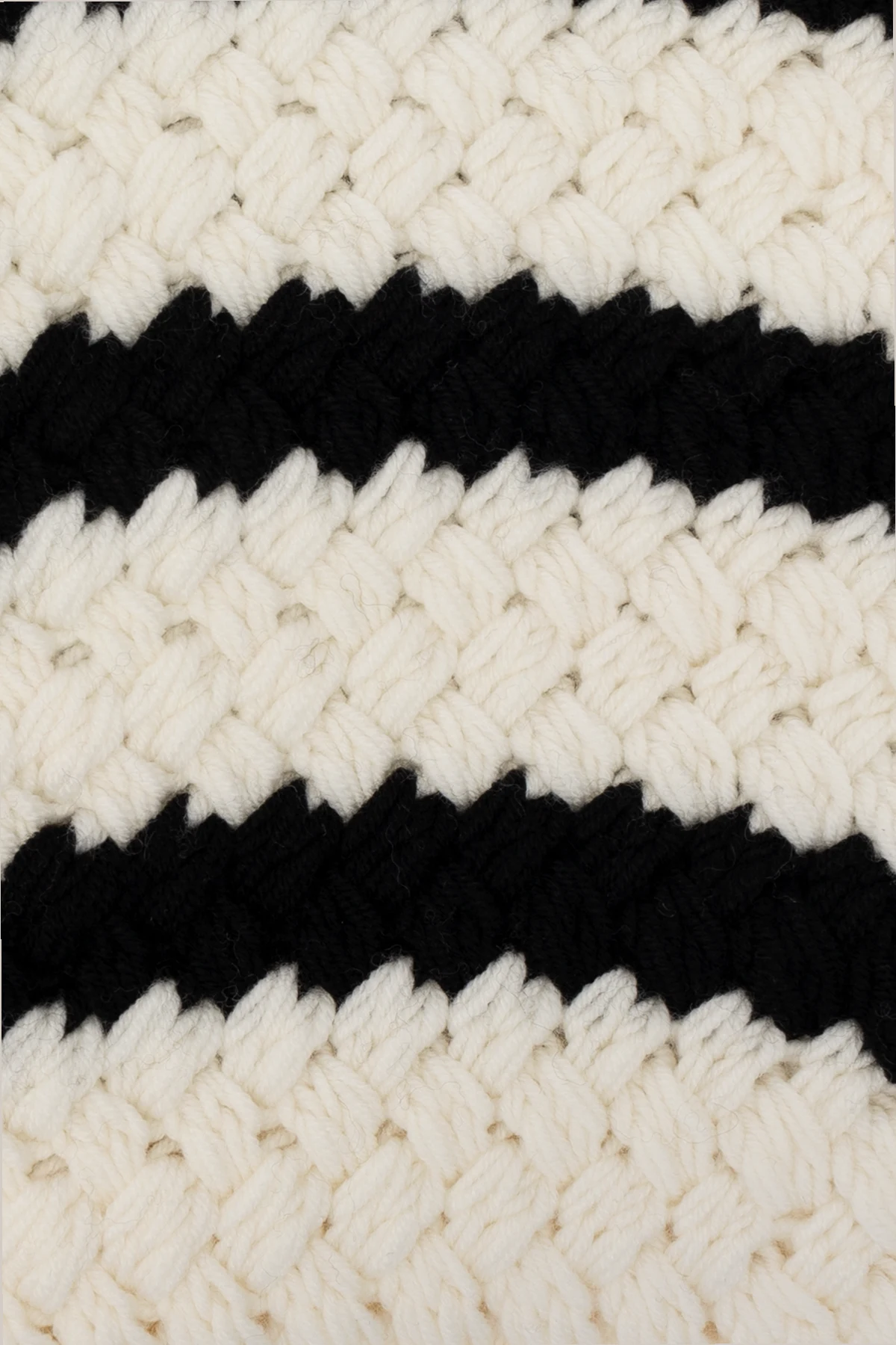 Cream and black scarf from Alanui. Made of virgin wool with a decorative knit, this design features fringe edges.
