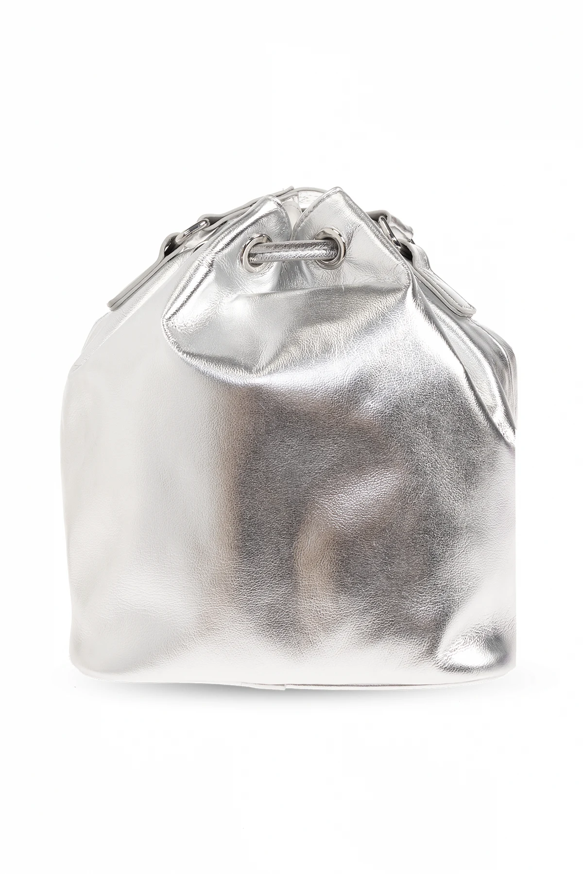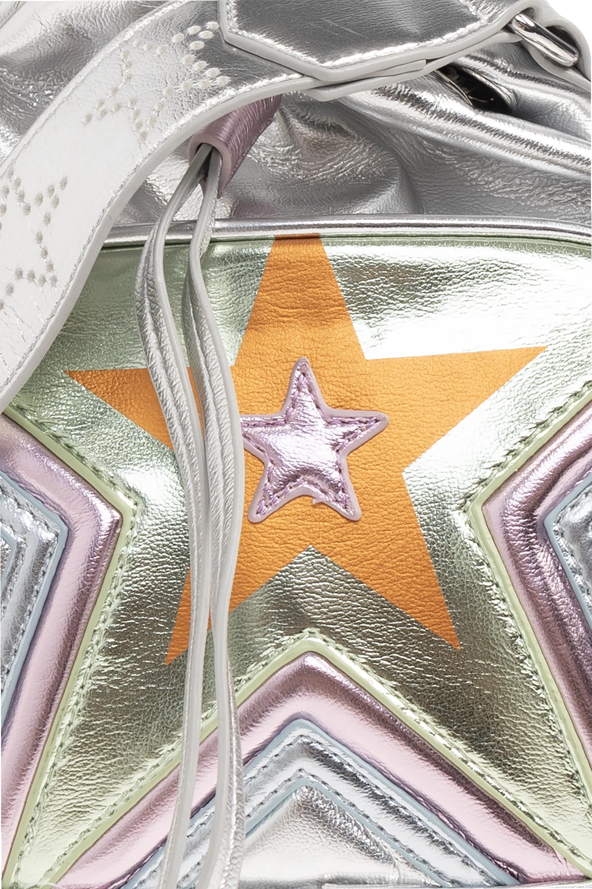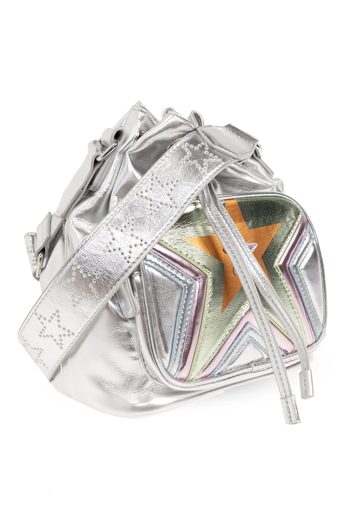 Silver-tone shoulder bag from Stella McCartney Kids. Crafted from faux leather with a metallic finish, this design features drawstrings, a front pocket with a zip fastening, multicolored star motif, one internal compartment a well a detachable and adjustable shoulder strap with a perforated logo.
