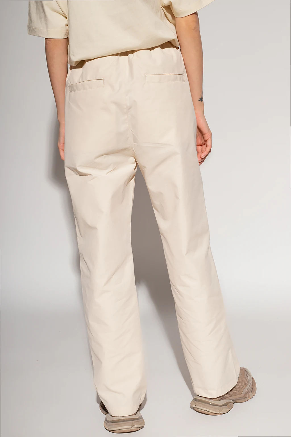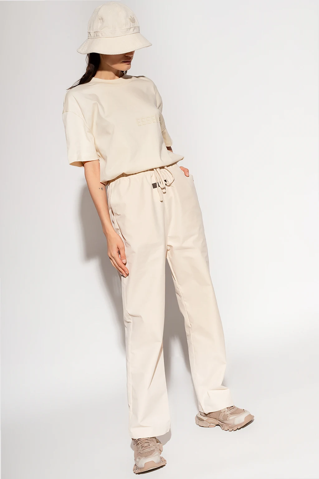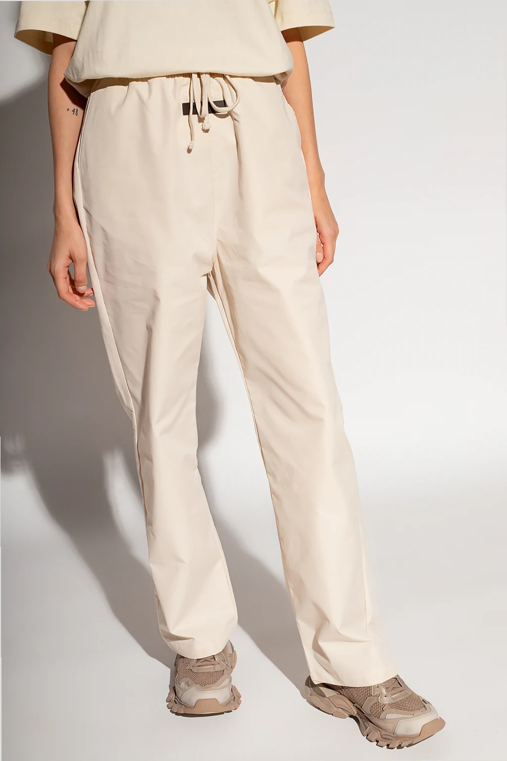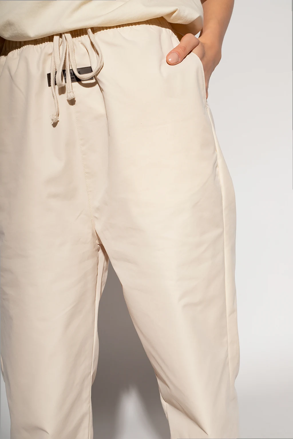 Cream trousers from Fear Of God Essentials. This design features an elastic drawstring waistband, the brand’s signature rubber logo patch in black, four slip pockets and straight legs.