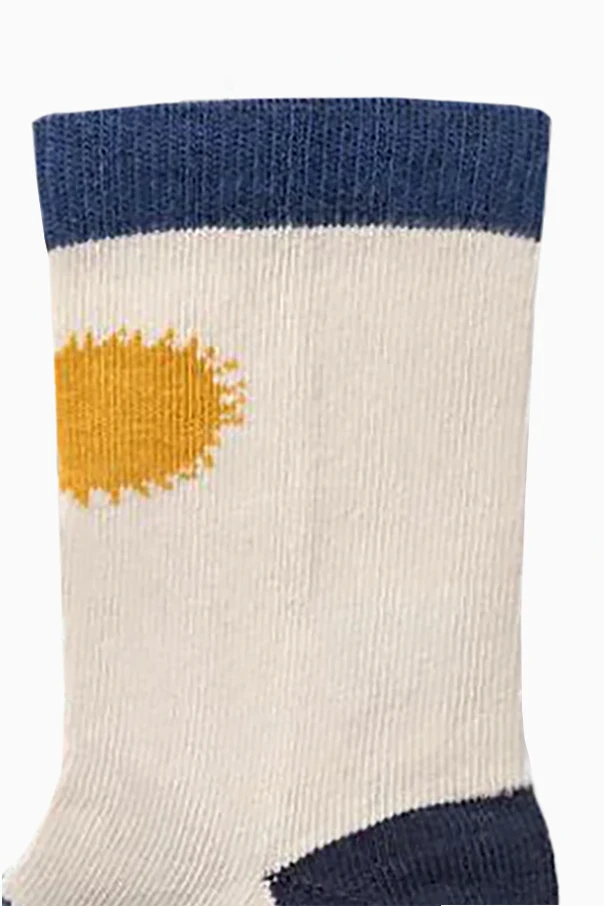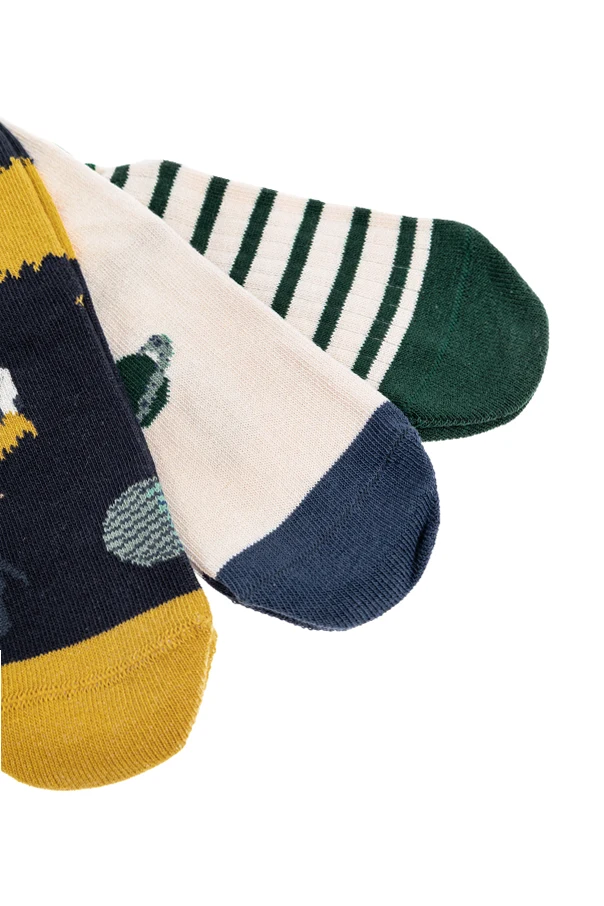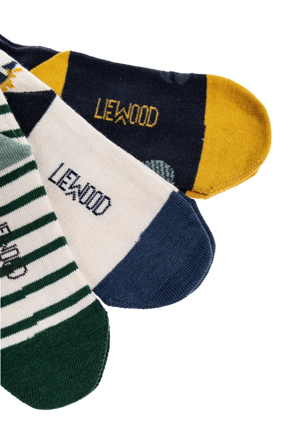 Discover refined comfort with this exclusive three-pack of children's socks by renowned designer Liewood. Each pair showcases a distinctive pattern —from playful, multicolored spots on a deep navy backdrop, to vibrant green and white stripes accented with a charming graphic and discreet logo, to a light style enhanced by blue trim and a cheerful yellow highlight.