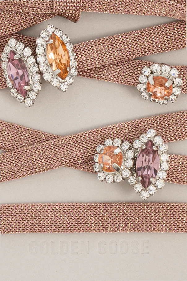 Experience a striking fusion of sophistication and modern flair with these Golden Goose Crystal-Embellished Shoelaces . Designed with a classic, flat profile, these laces are meticulously crafted from a densely woven textile that boasts a subtle, metallic sheen—delicately enhancing their exclusivity. The dominant pink hue radiates with a refined luster, making them the ultimate accent for both athletic and lifestyle footwear. Three exquisite brooches adorn the laces, each featuring vibrant, oval and teardrop-shaped glass crystals in shades of violet, lavender, and amber—surrounded by shimmering, petite stones for a mesmerizing finish. Finished with the iconic, contrasting "GOLDEN GOOSE" signature at one tip, these shoelaces are a hallmark of thoughtful design and artisanal excellence. Why choose this product? Exclusive handcrafted embellishments for a distinguished look High-quality materials: glass, brass, and premium textile Versatile elegance designed to transform any footwear Authentic signature branding for a touch of iconic prestige