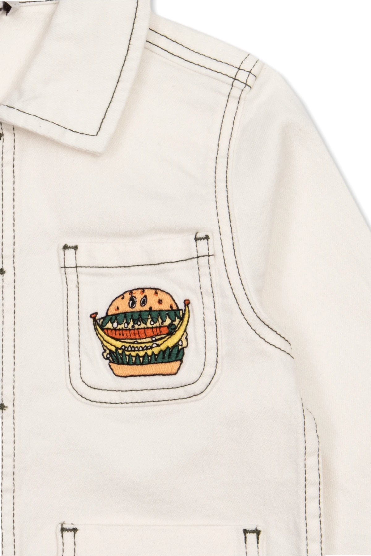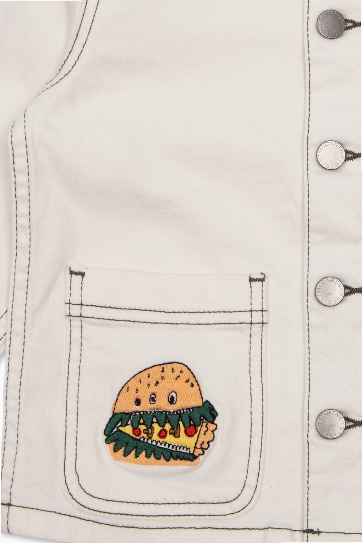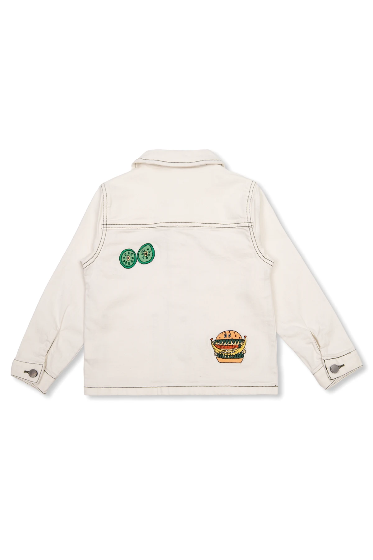 White jacket from Stella McCartney Kids. Crafted from organic cotton, this garment features buttons, contrasting stitches in dark green, multicolored embroidered burger pattern, collar, three slip pockets and long sleeves with buttoned cuffs.