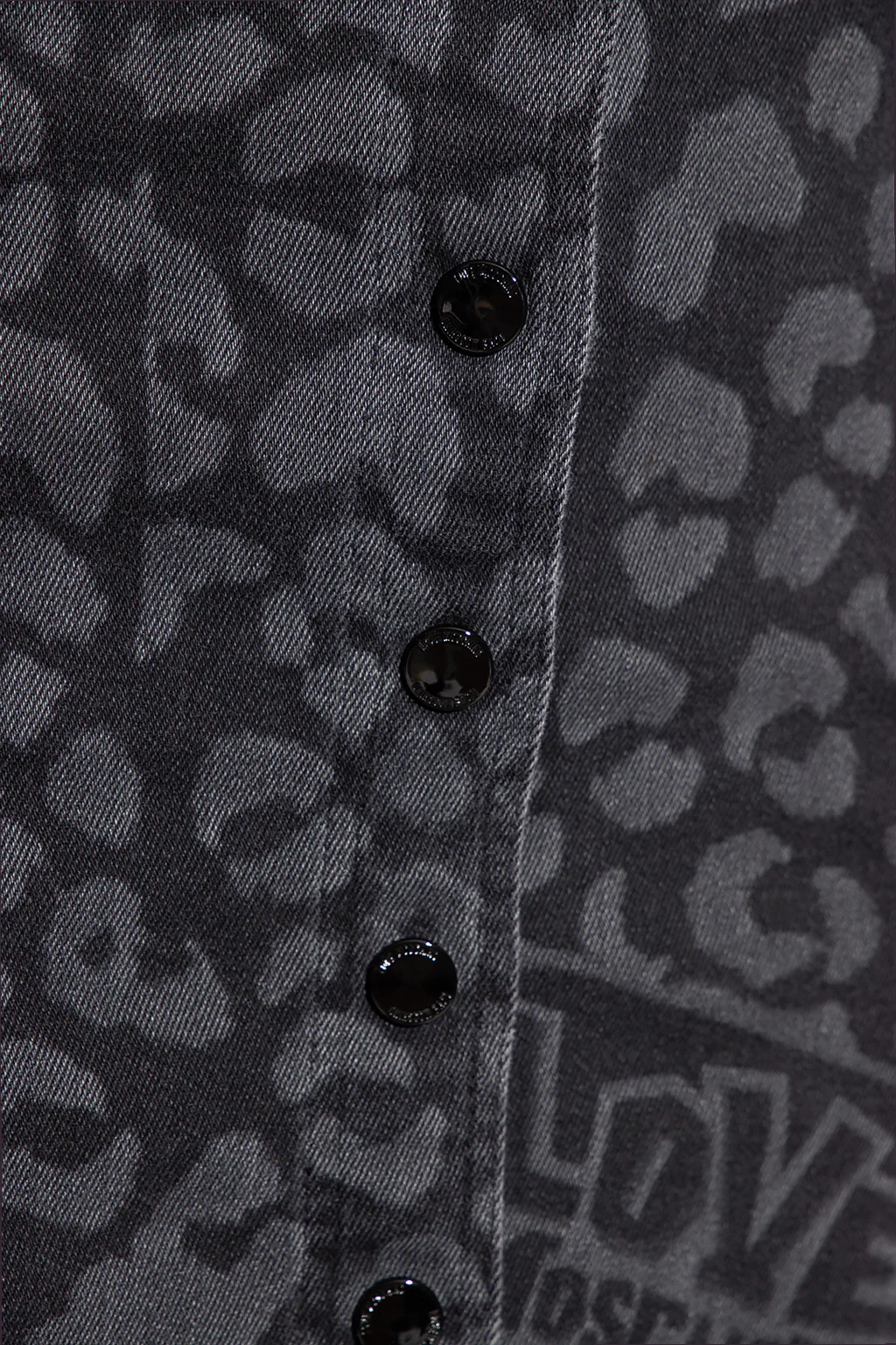 Black and grey denim skirt from Love Moschino. Embellished with a leopard pattern accompanied by the brand\'s logo, this style features snap fastenings and four slip pockets.