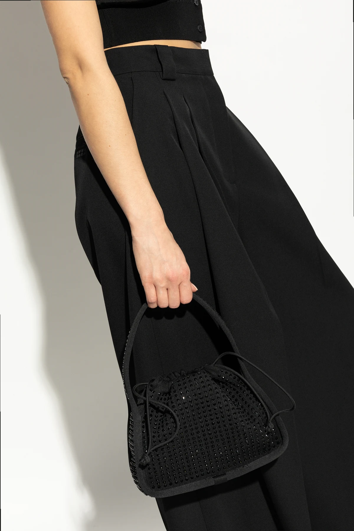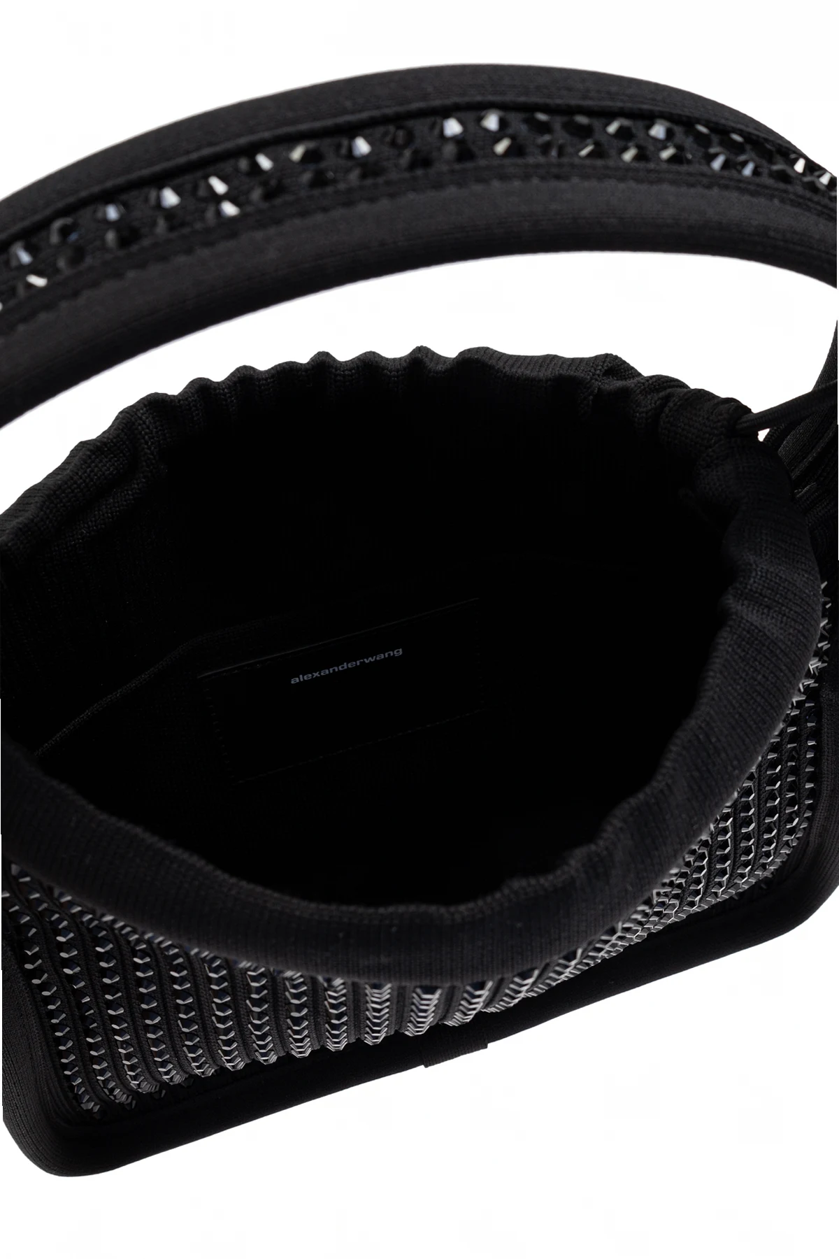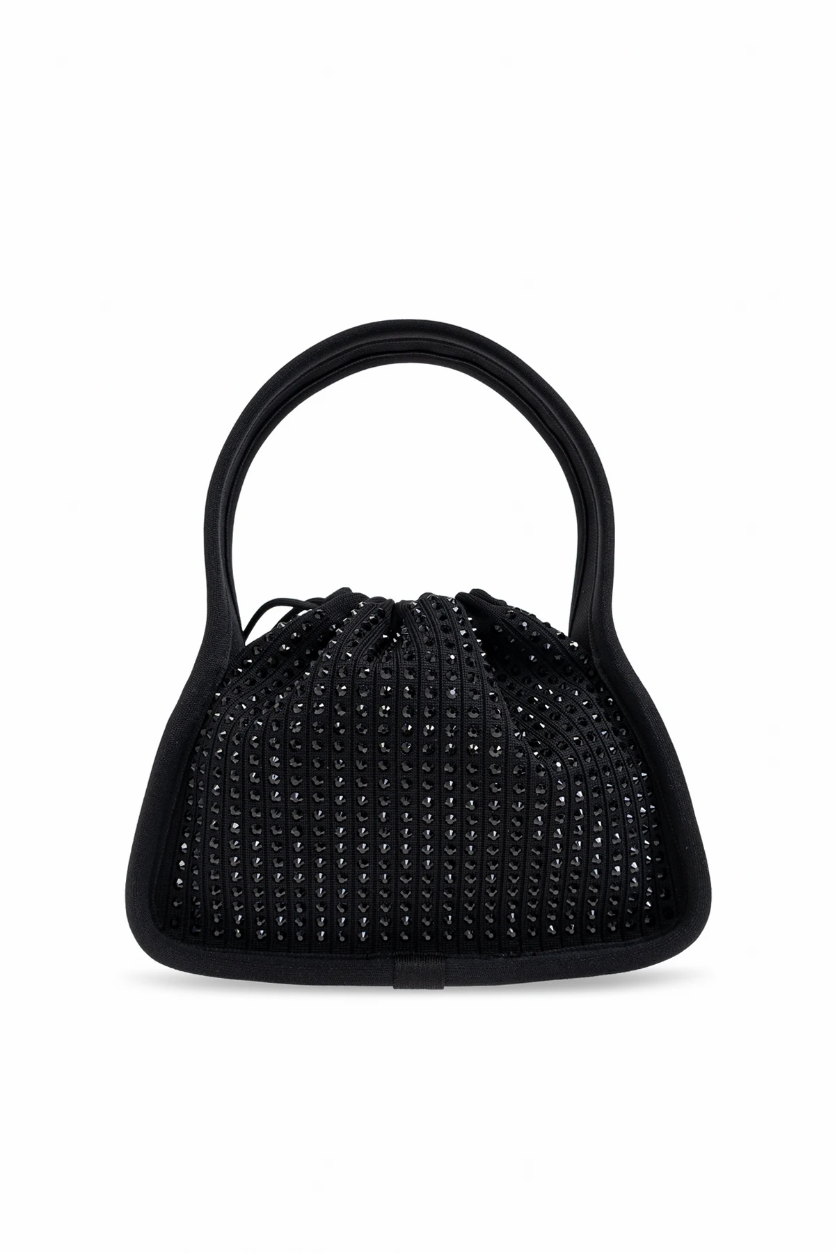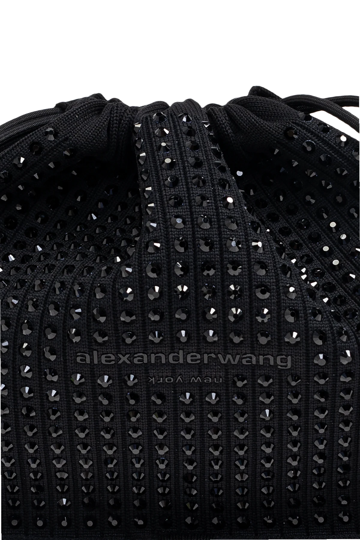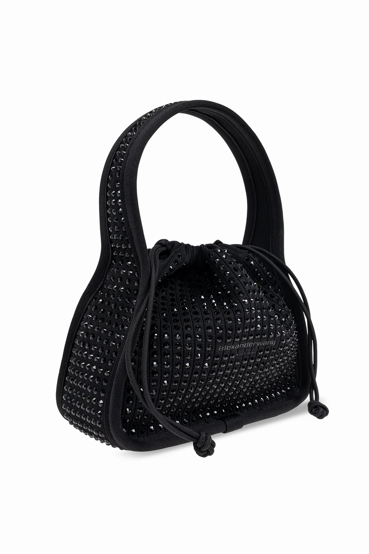 Introducing the exquisite Ryan Small handbag by the illustrious designer Alexander Wang. This elegant black handbag epitomizes sophistication, featuring a rounded silhouette with a gracefully gathered closure that imparts an alluring volume. Its sturdy, well-contoured handles ensure comfortable hand carry, making it an ideal companion for evening outings or special occasions. The exterior is adorned with shimmering crystals that create a dazzling effect, while the material, composed of polyester and nylon, promises durability and impeccable finish. A subtle designer logo, alexanderwang, embellishes the front, underscoring its exclusivity. Inside, the handbag offers a spacious compartment and a slip pocket, catering to your essentials with style. Why Choose This Product? Timeless elegance with a modern twist High-quality materials with a resilient finish Spacious interior for versatile use Exclusive design by renowned Alexander Wang