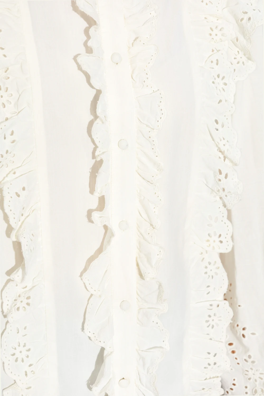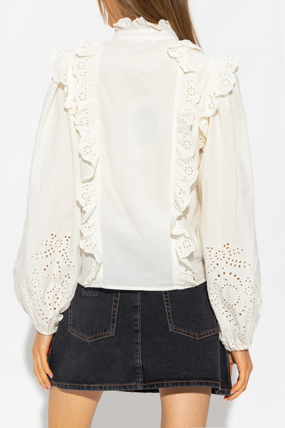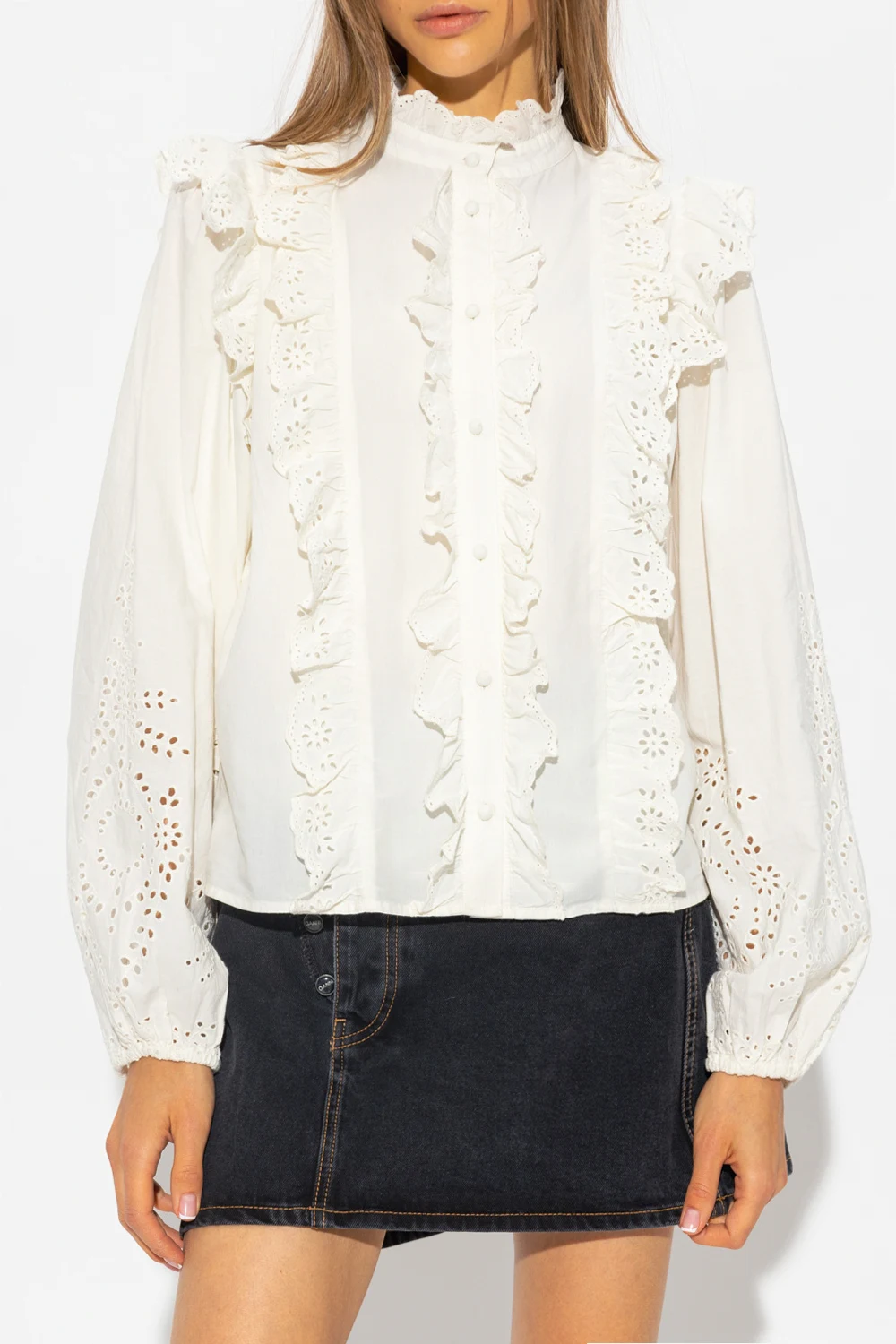 Cream ‘Alma’ shirt from Notes Du Nord. Crafted from cotton with a relaxed fit, this style showcases broderie anglaise detailing, multiple ruffles, front button fastenings, a mock neck, blouson sleeves and elasticized trims.