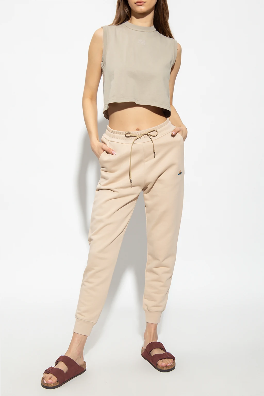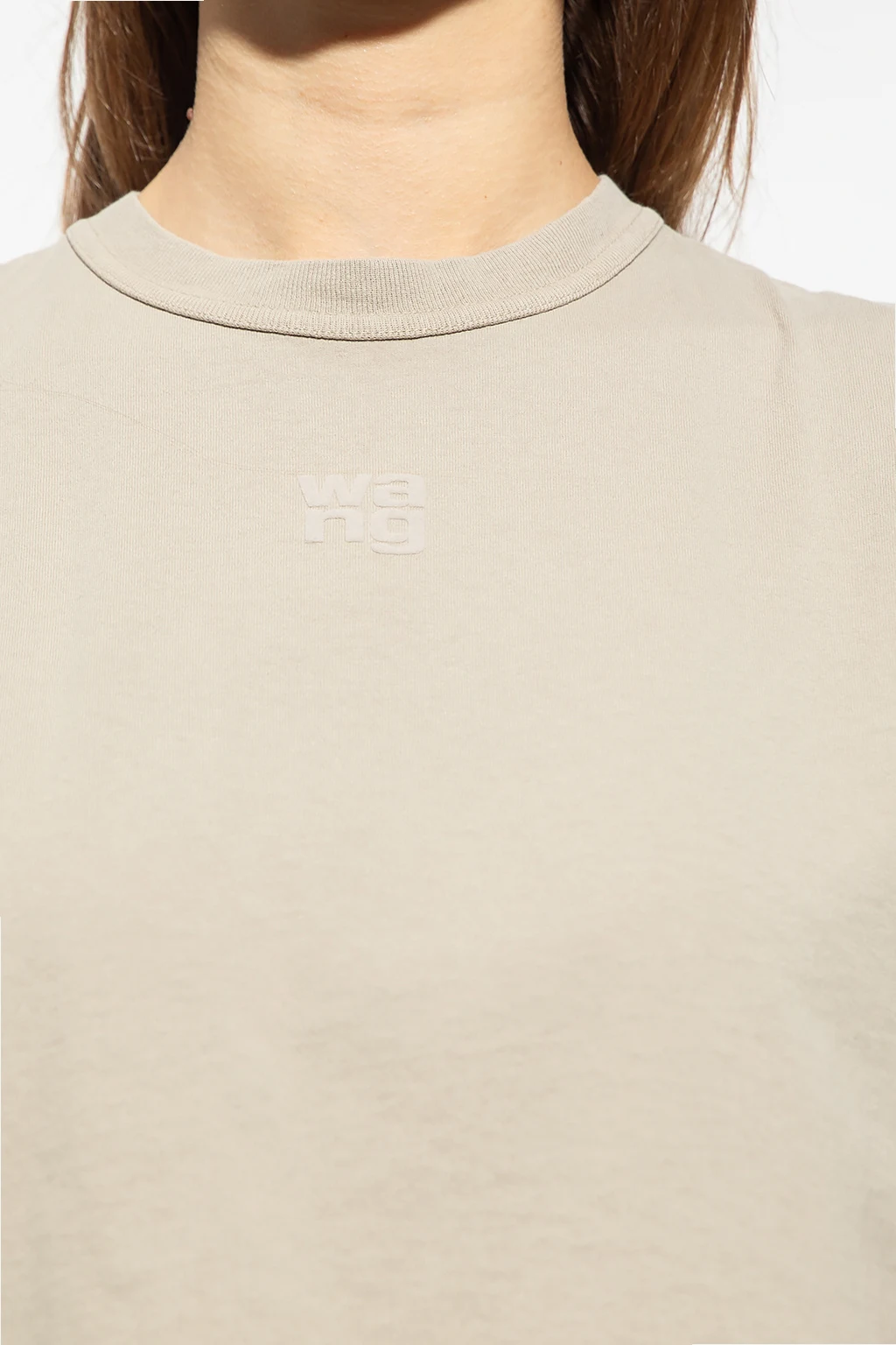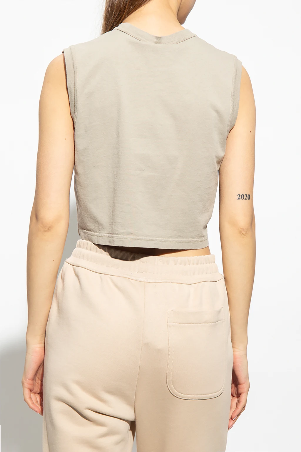 Beige sleeveless T-shirt from T by Alexander Wang. Made of cotton, this garment features a ribbed crew neck and printed logo pattern in beige.