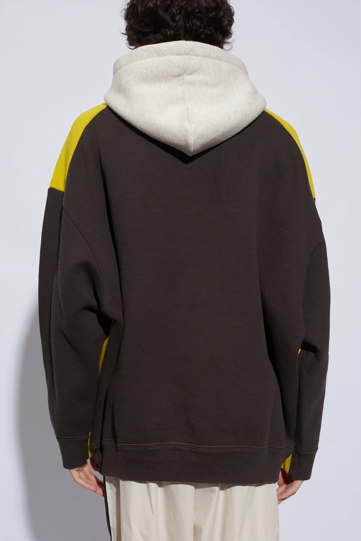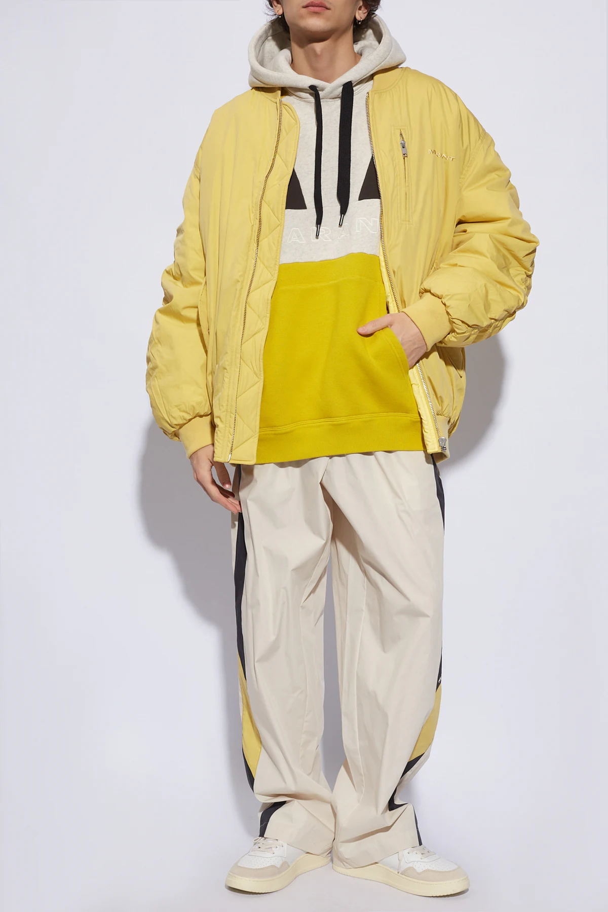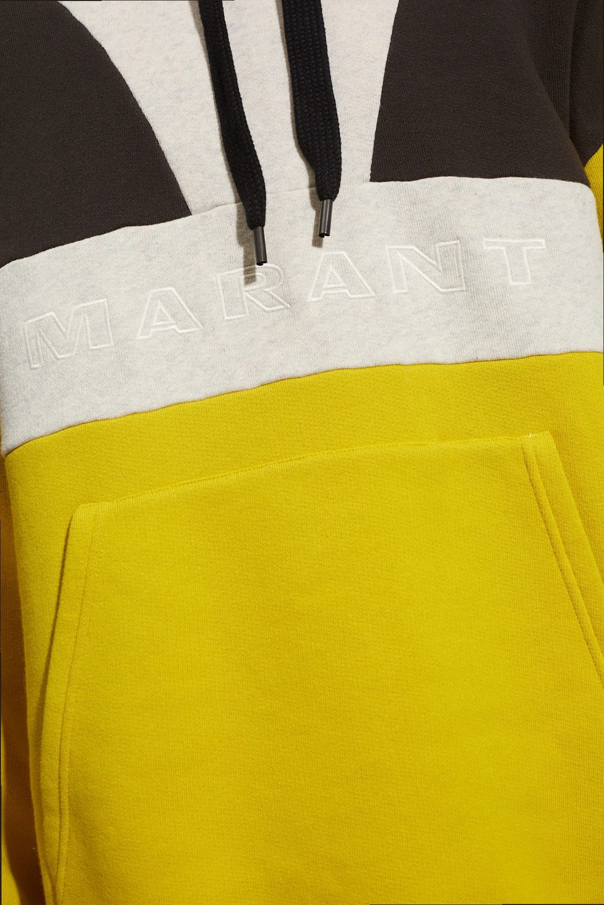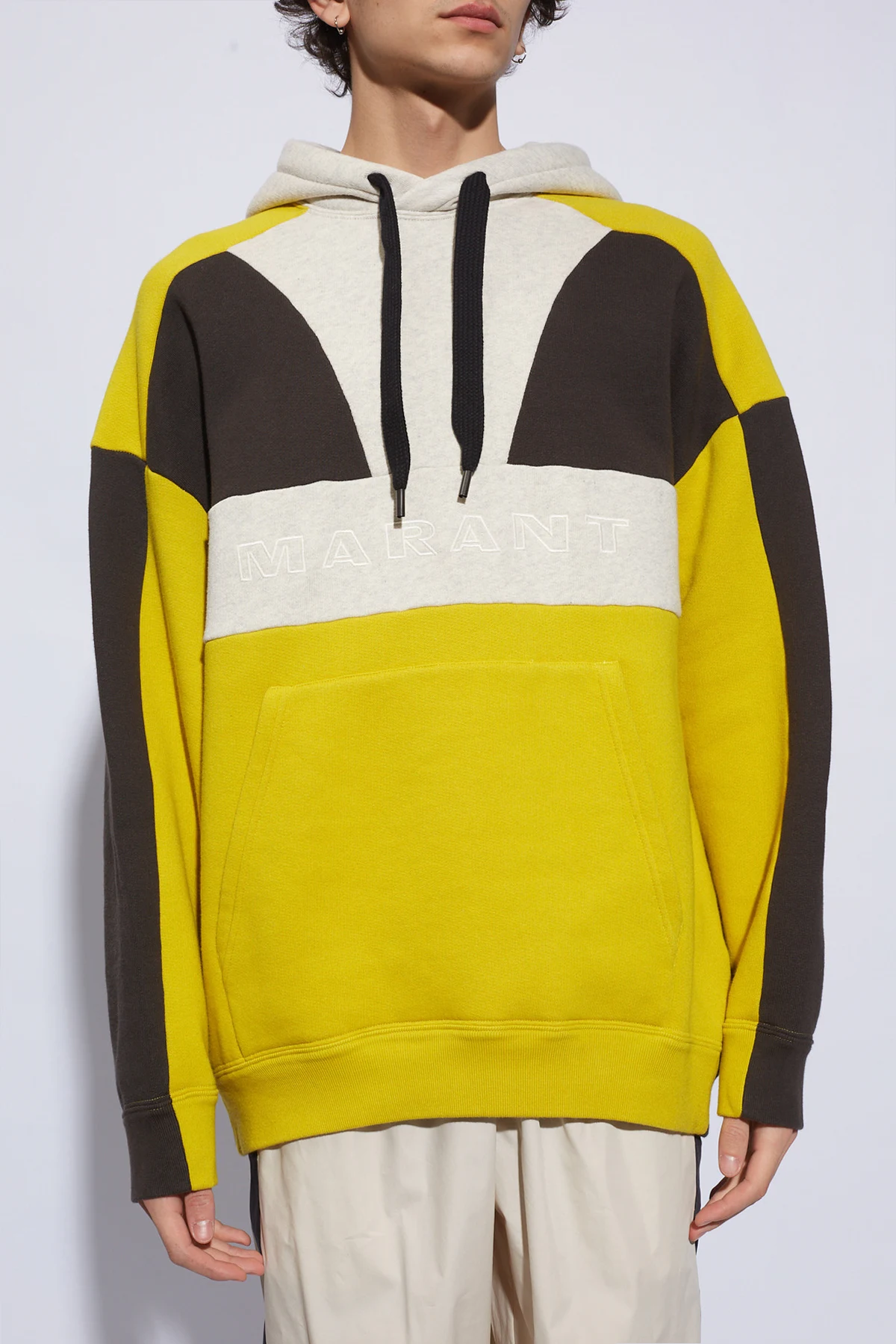 Grey, yellow and black ‘Wasil’ sweatshirt with a drawstring hood from MARANT. Made of a cotton blend, this style showcases an embroidered logo accompanied by a kangaroo pocket on the front, long sleeves and ribbed trims on the bottom hem and cuffs.