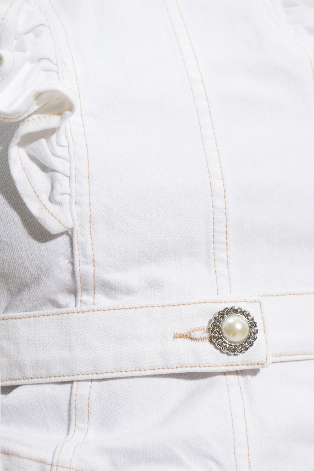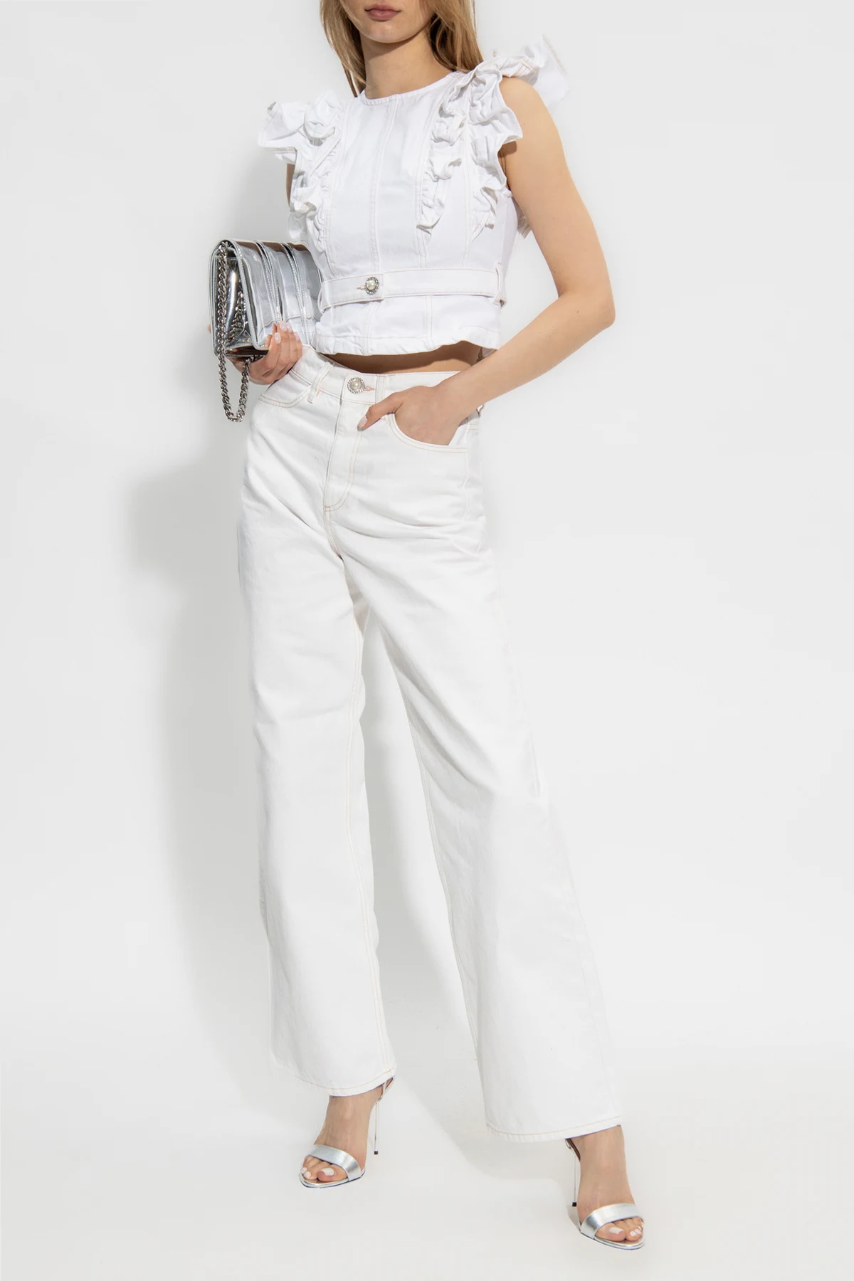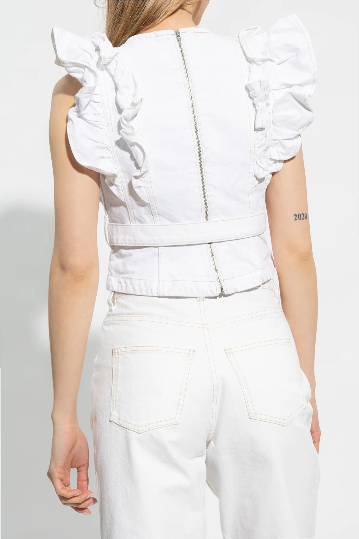 White denim top from Custommade. Made of cotton, this garment features a zip fastening at the back, fringes and decorative button at the waist.