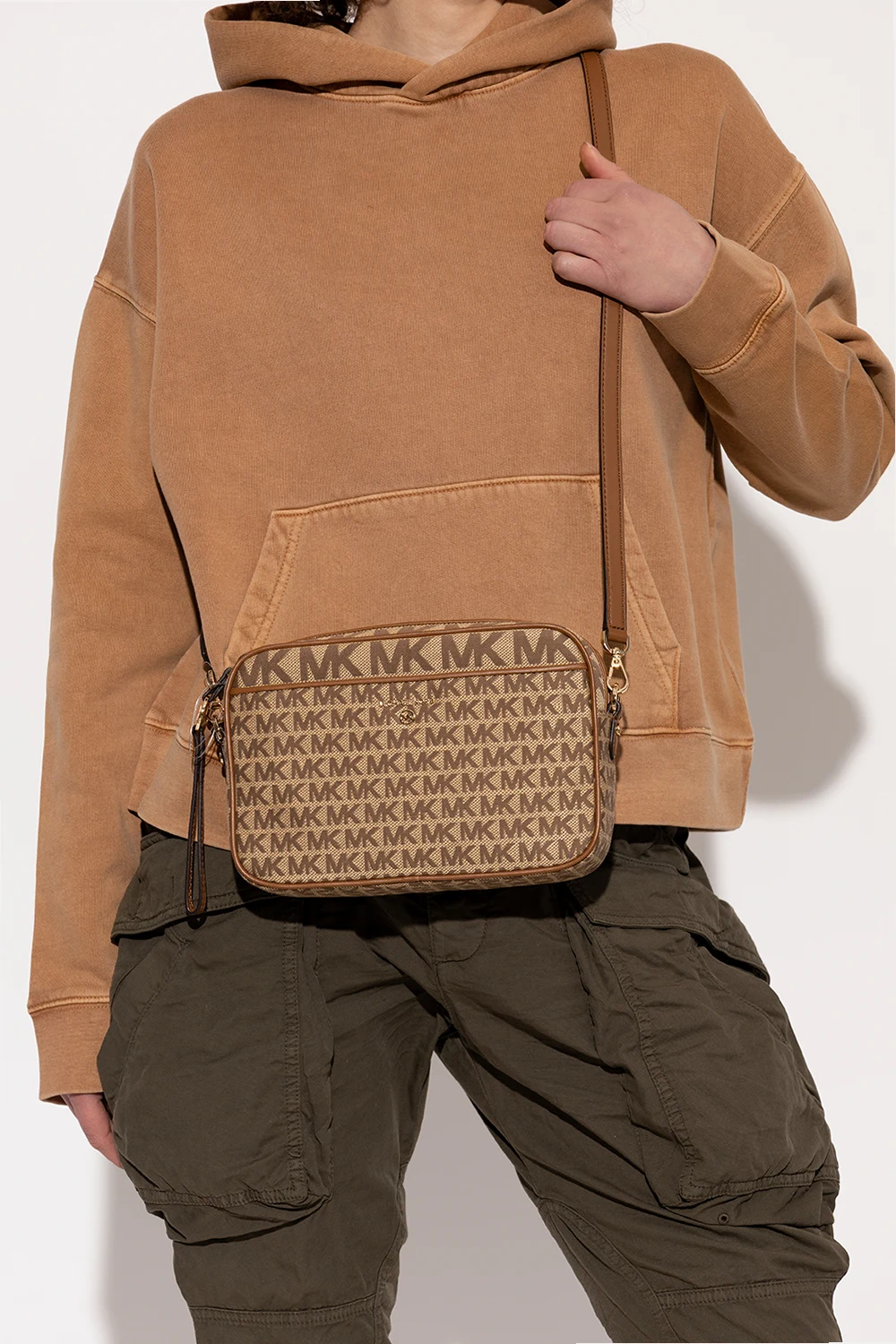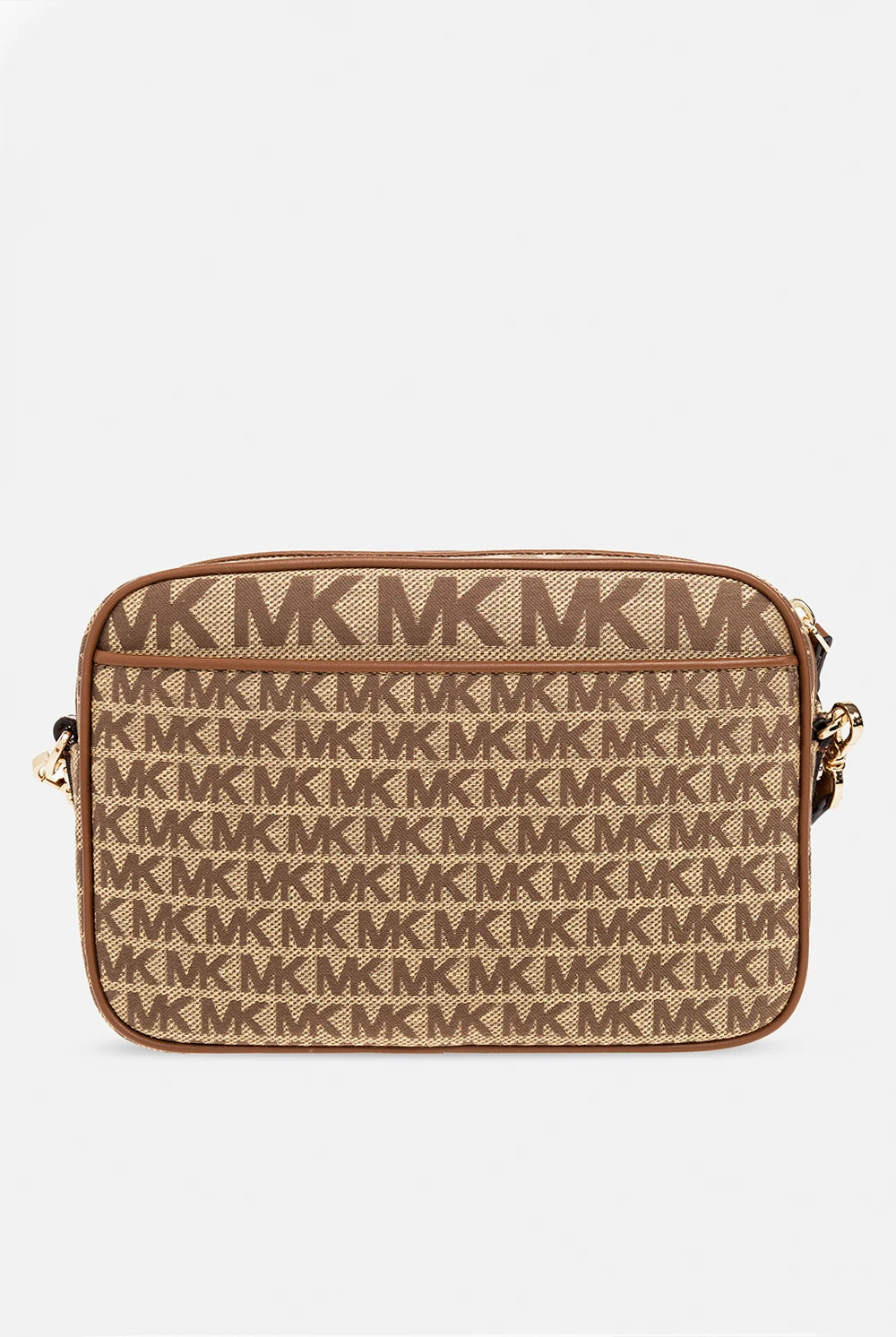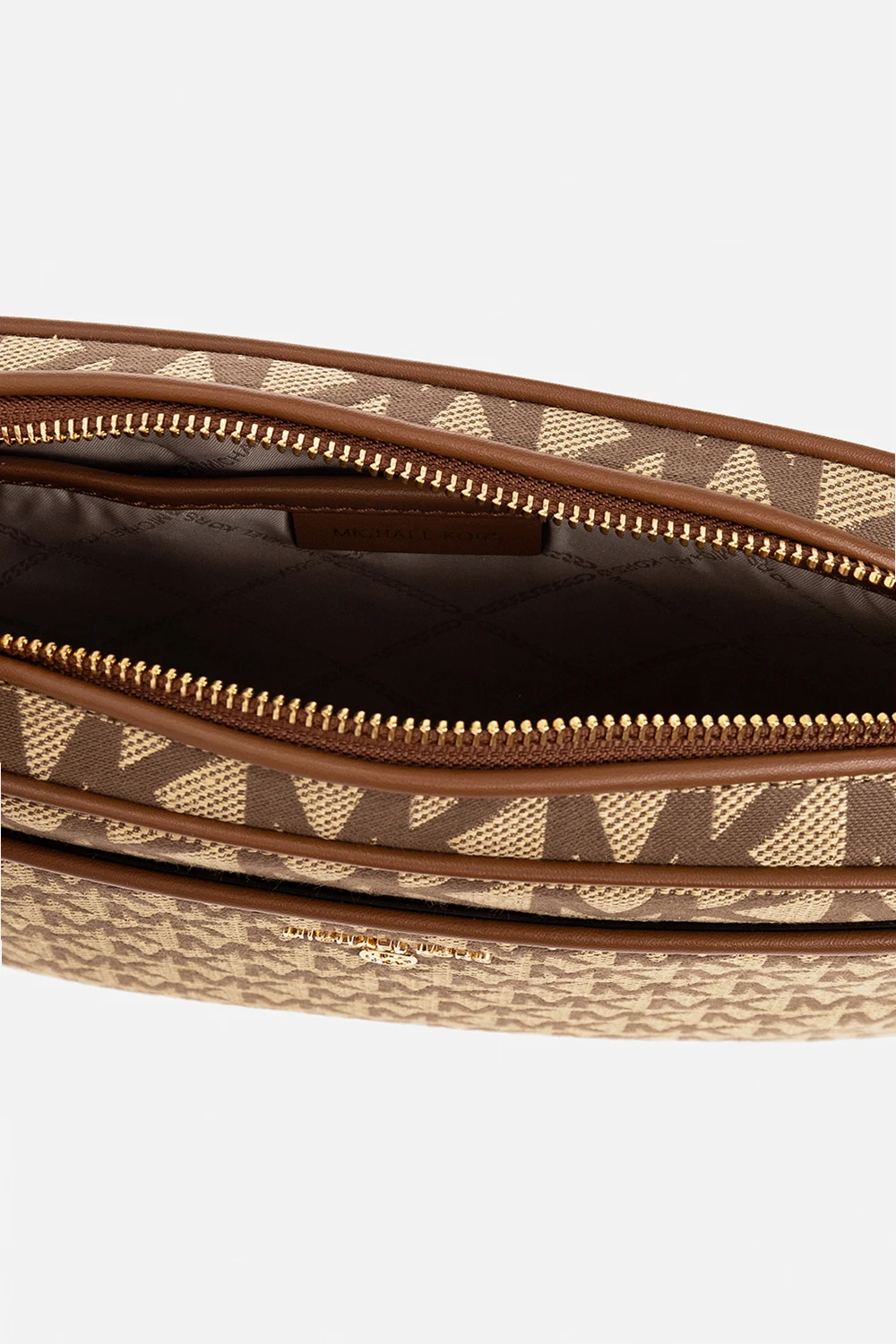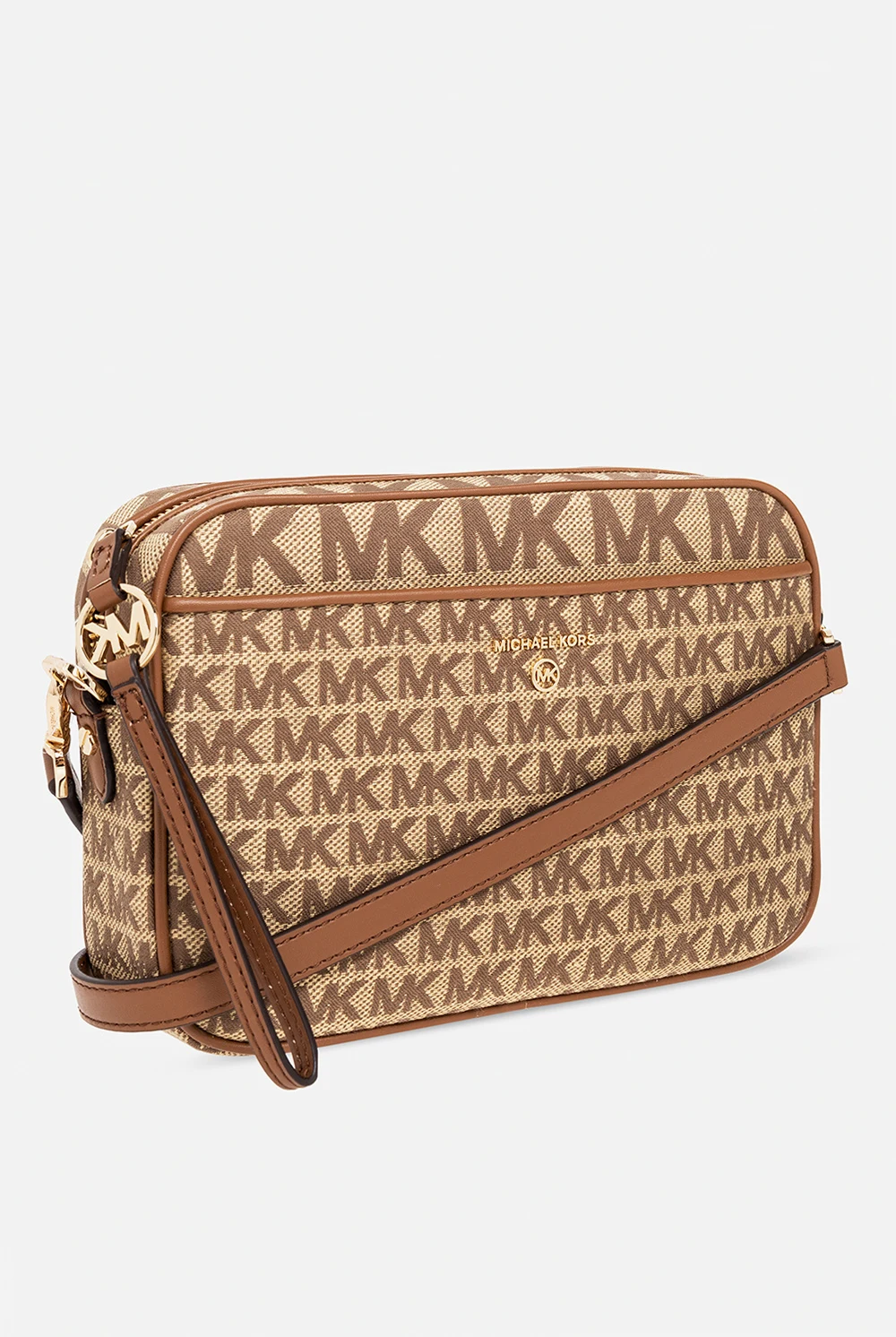 Beige and brown \'Jet Set Charm’ shoulder bag from Michael Michael Kors. Made from monogrammed canvas and trimmed with faux leather, this design secures with a zipper and features a slip pocket accompanied by a logo plaque on the front, a back slip pocket, a long and adjustable strap, gold-tone metal hardware and one internal compartment with one slip pocket and six card slots.