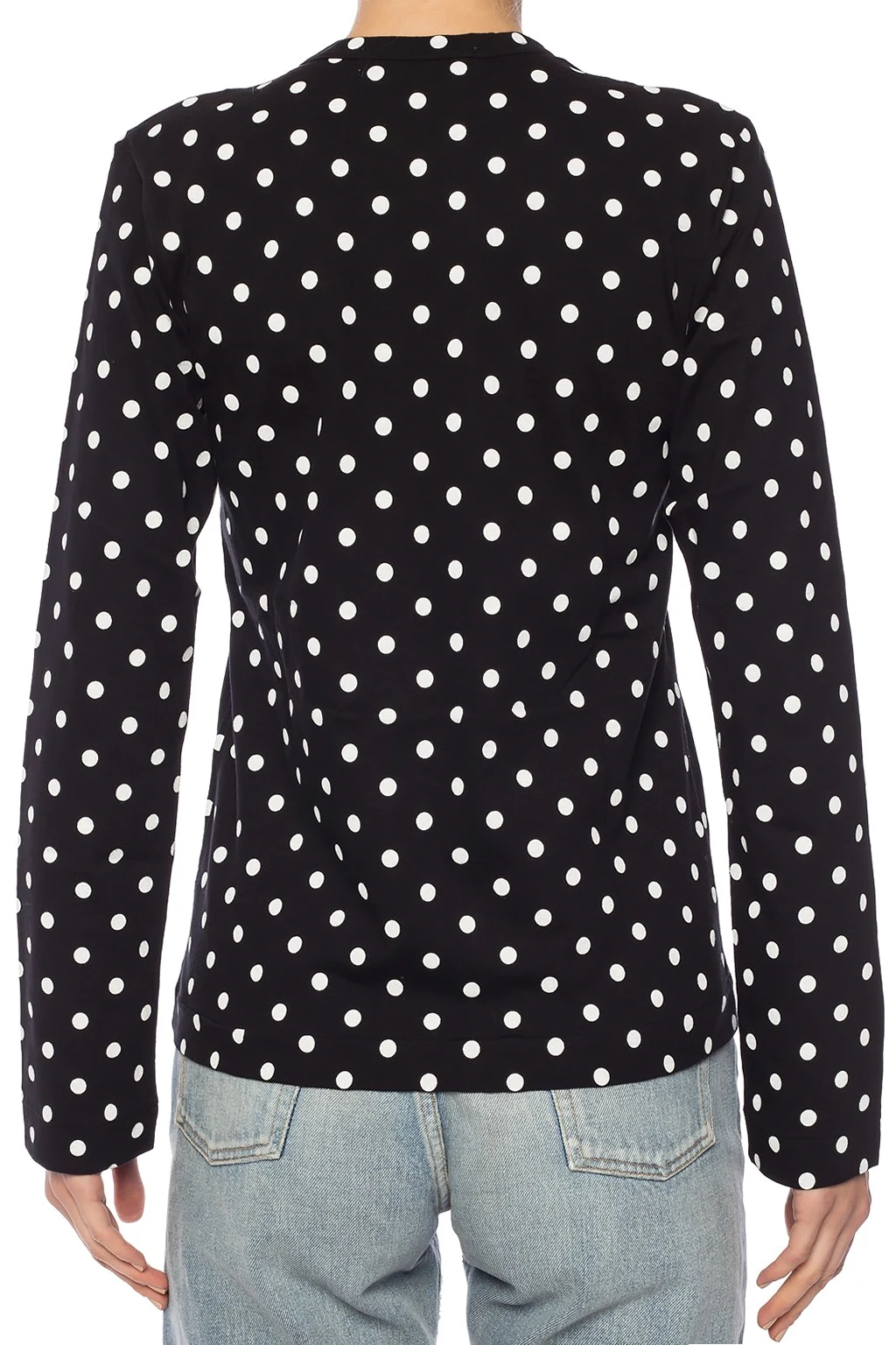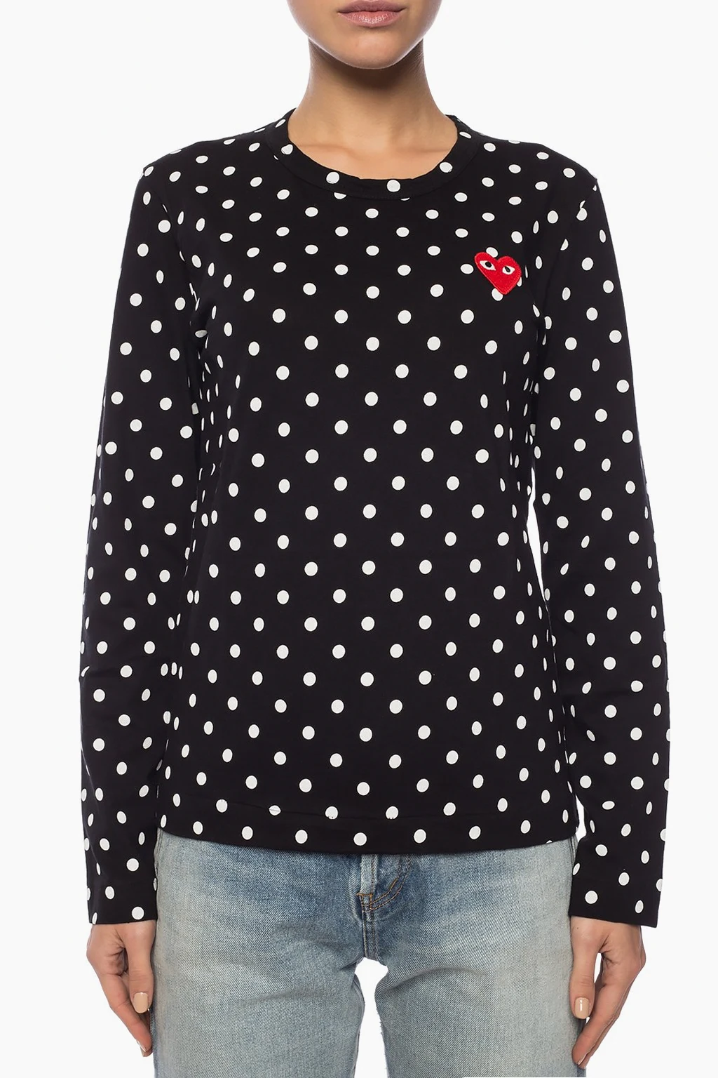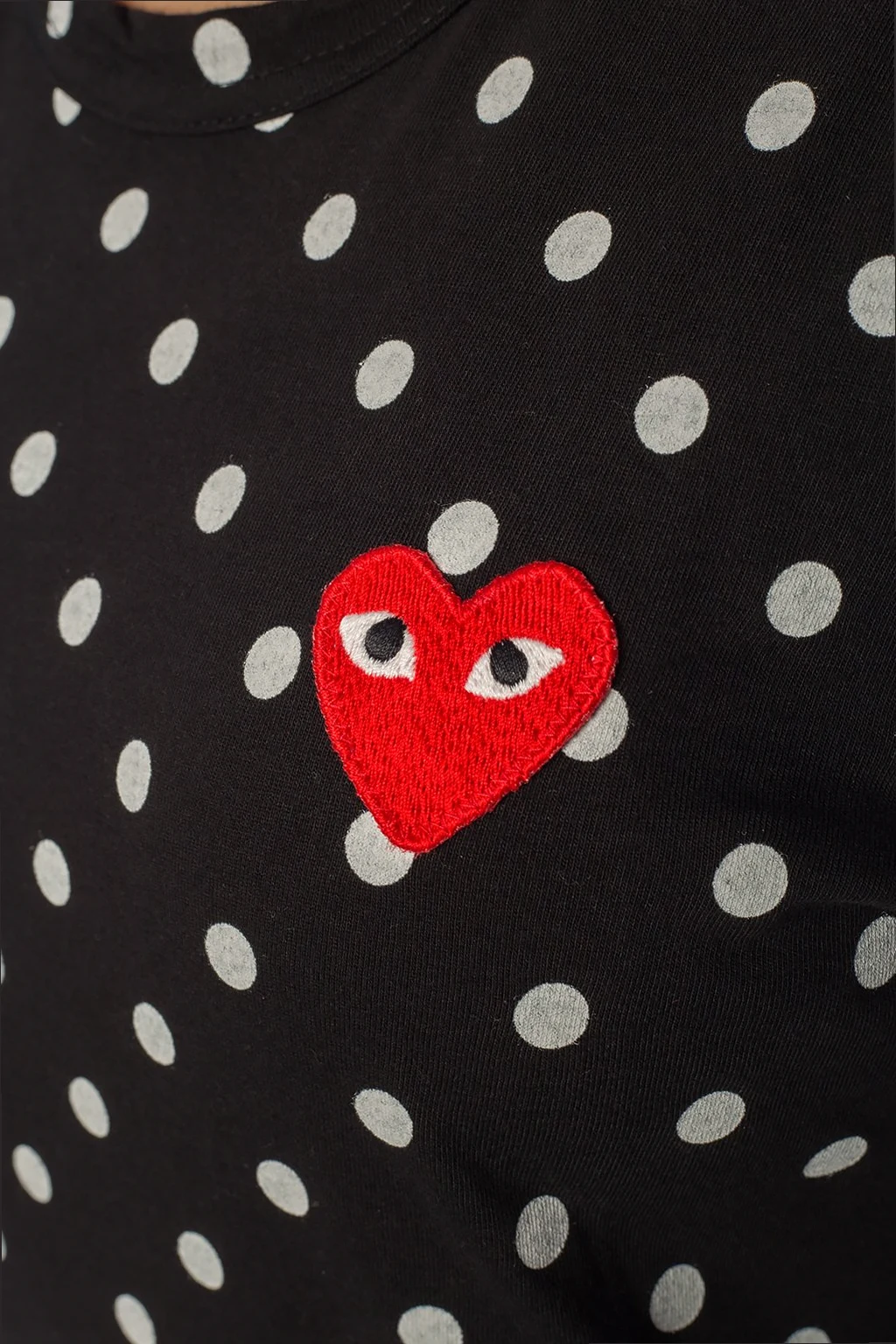 Black T-shirt from Comme Des Garçons Play. Made of cotton. Decorated with a printed polka dot pattern and a heart motif patch in red, white and black. Round neck. Long sleeves.