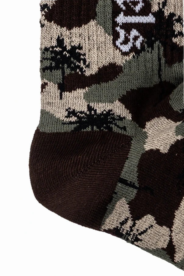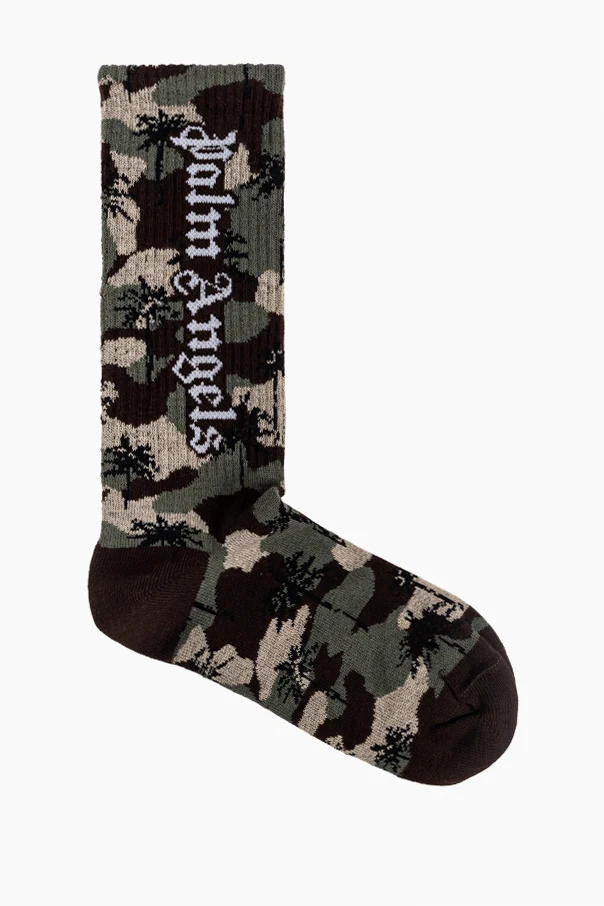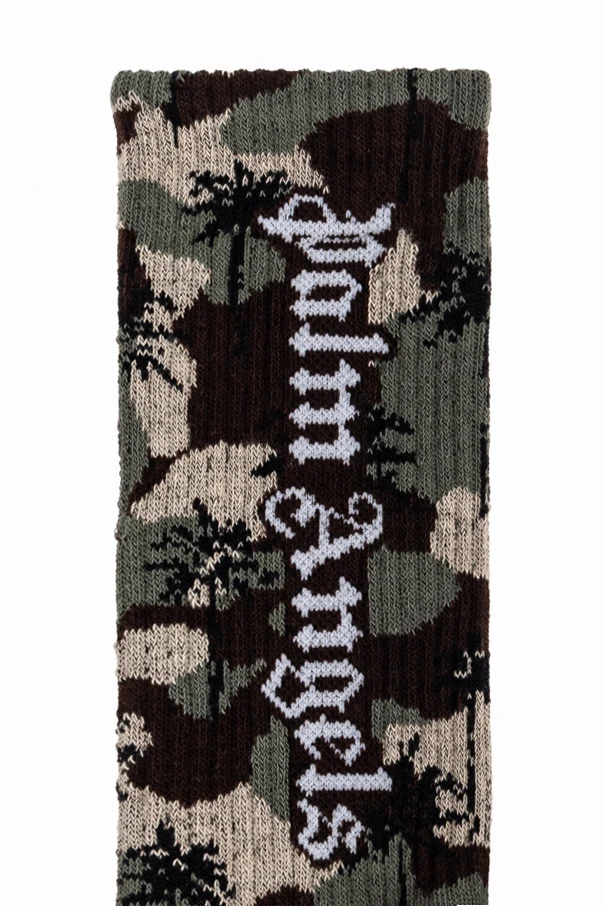 Distinguished by a vibrant camouflage motif in green, beige, brown, and black hues, these socks are punctuated with striking black palm silhouettes for a unique, urban edge. A signature, vertical white “Palm Angels” inscription in the brand’s bold Gothic font creates a refined focal point on the calf, underscoring the collectible character of this design.