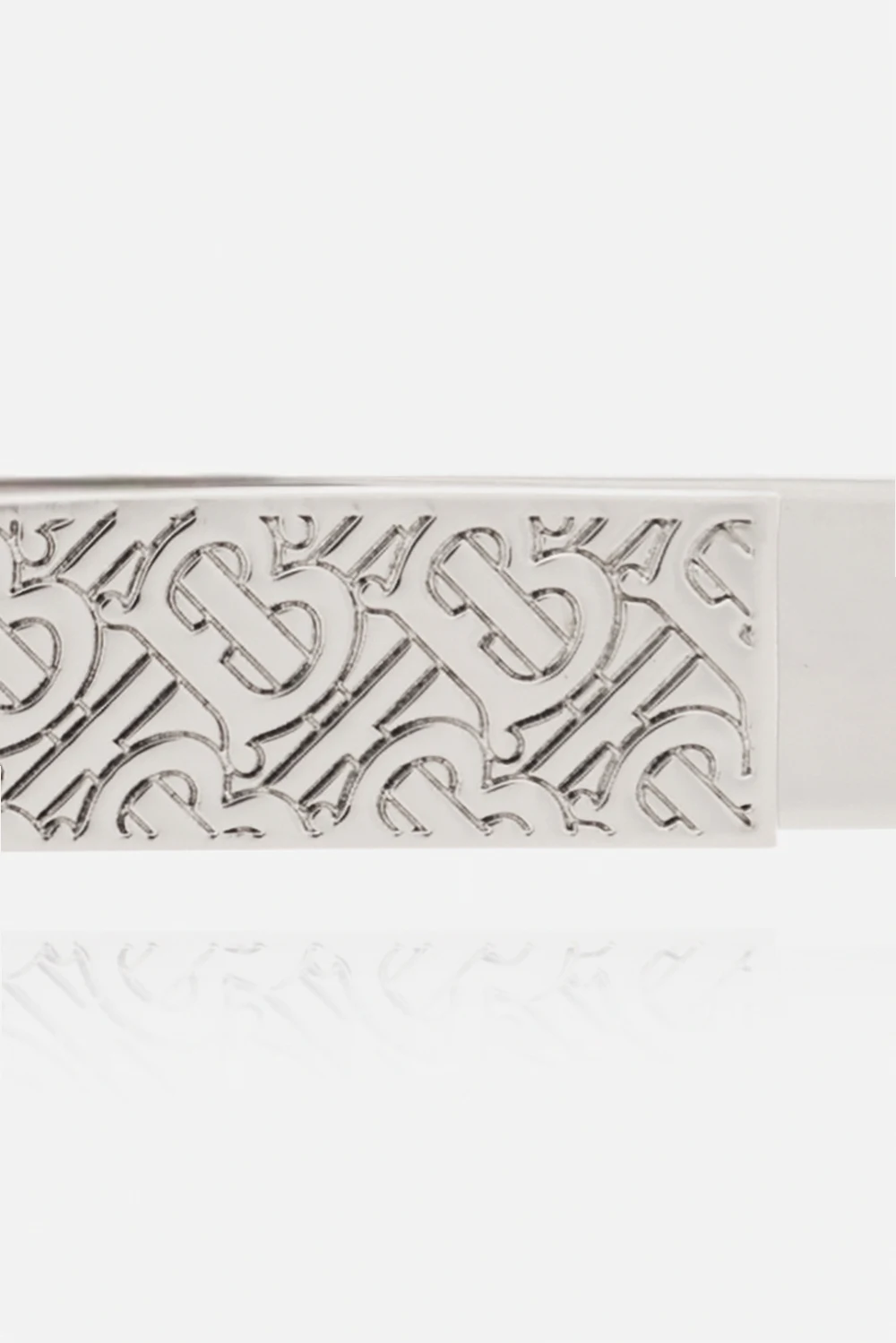 Silver-tone tie pin from Burberry. Made of brass, this item showcases an embossed monogram.