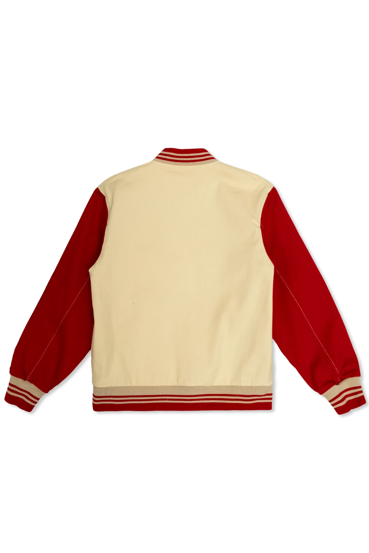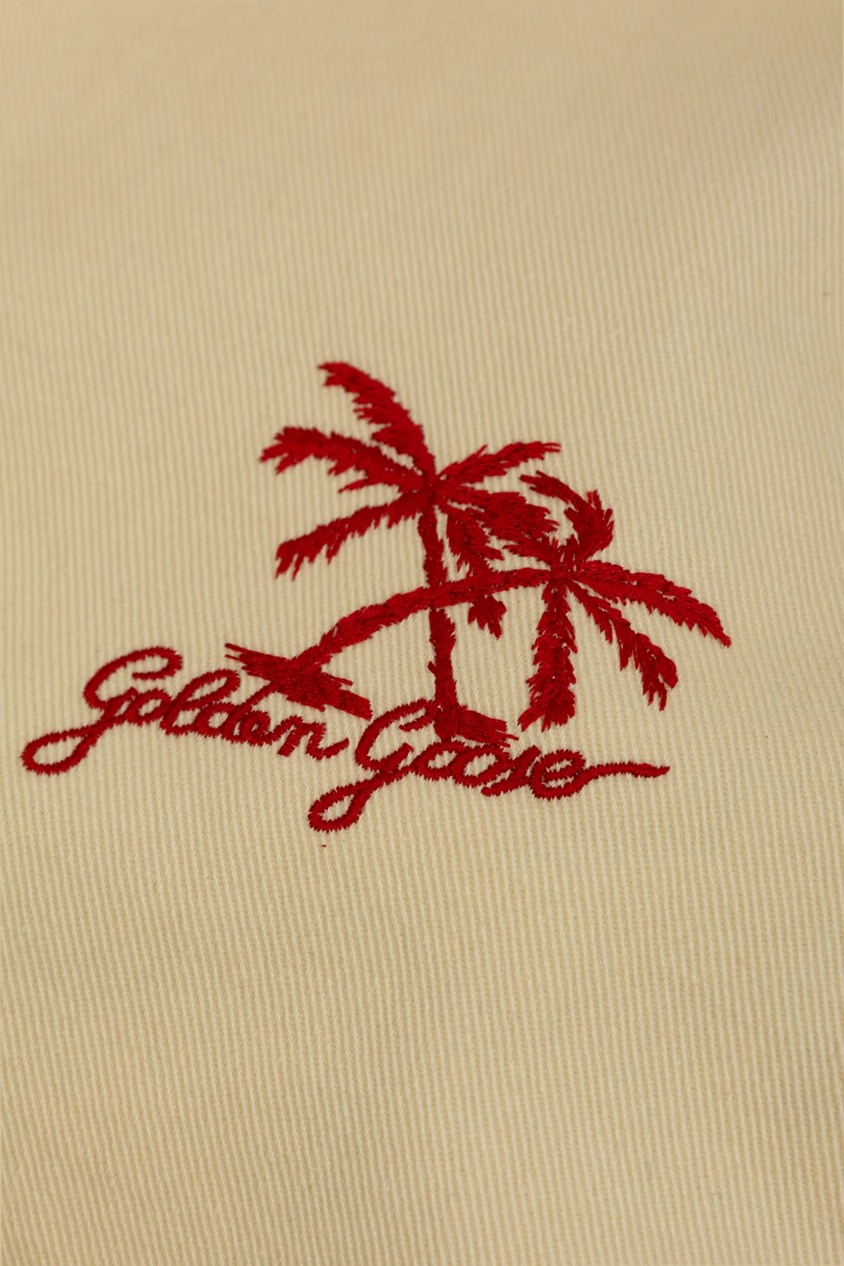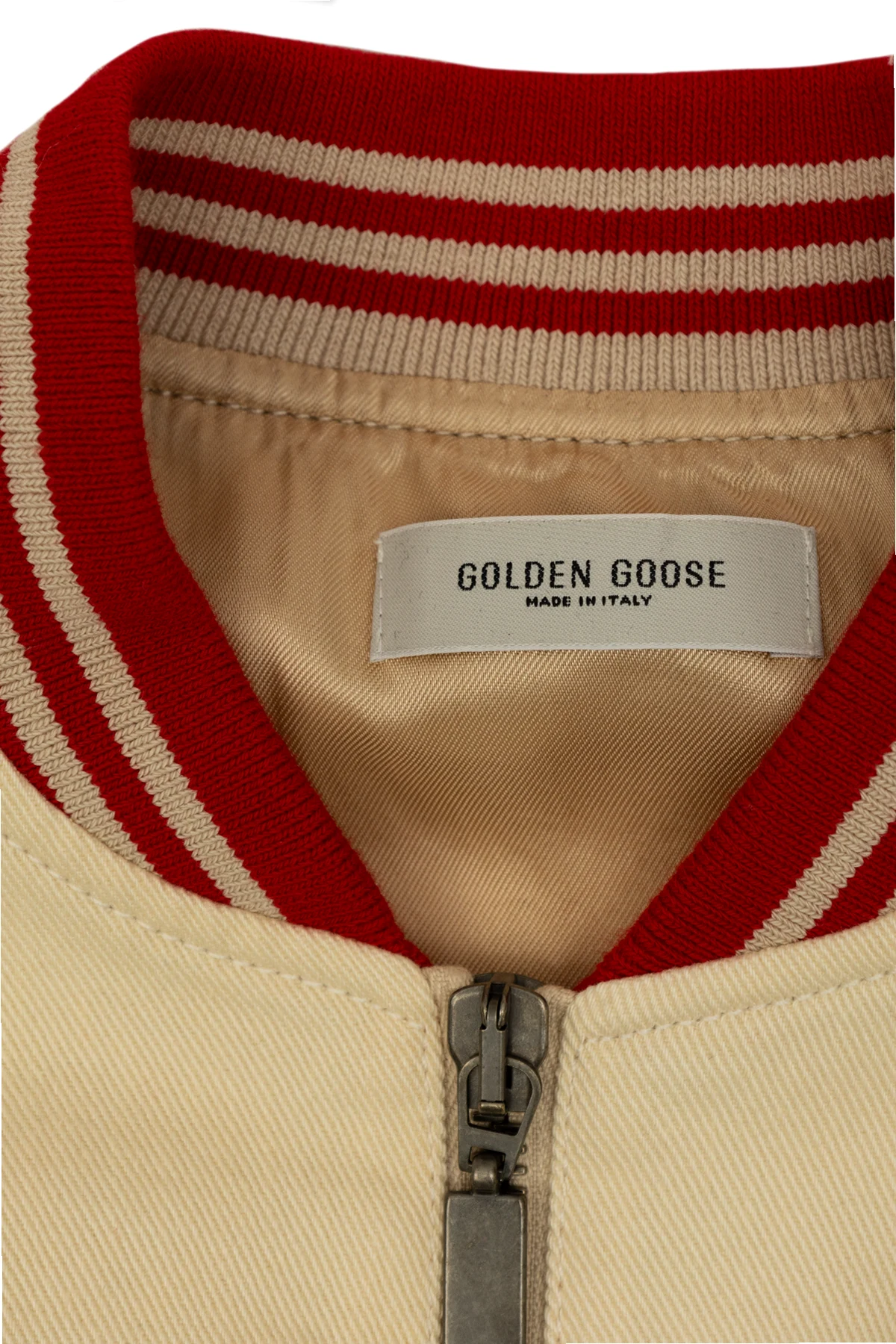Introducing the Golden Goose Kids Logo Jacket, a distinguished piece from the exclusive collection of the esteemed Italian brand, Golden Goose. This bewitching jacket, designed for boys aged 4-14, embodies a harmonious blend of refined elegance and playful vibrancy. The jacket\'s predominant beige hue is beautifully complemented by red sleeves, while the striped cuffs, hem, and collar exude a classic charm. Crafted from premium materials, this garment ensures both durability and comfort. Adorned with a striking red palm embroidery and the iconic \"Golden Goose\" inscription on the chest, this jacket captures the brand\'s unique artistry. A convenient zipper closure and two front pockets with red piping enhance its functionality and style. The exquisite \"GOLDEN GOOSE MADE IN ITALY\" label at the collar signifies its provenance, assuring you of its exceptional quality. Why Choose This Product? Exquisite design with a harmonious color palette. High-quality construction for lasting wear. Distinctive brand details that elevate its uniqueness. Perfect for young fashion aficionados.