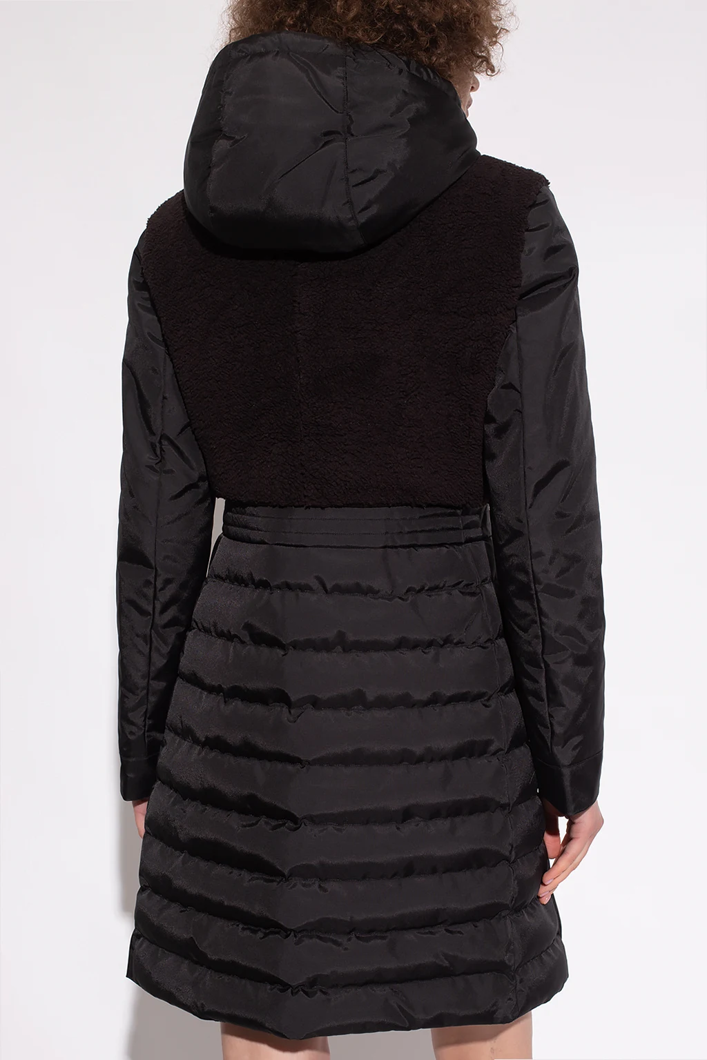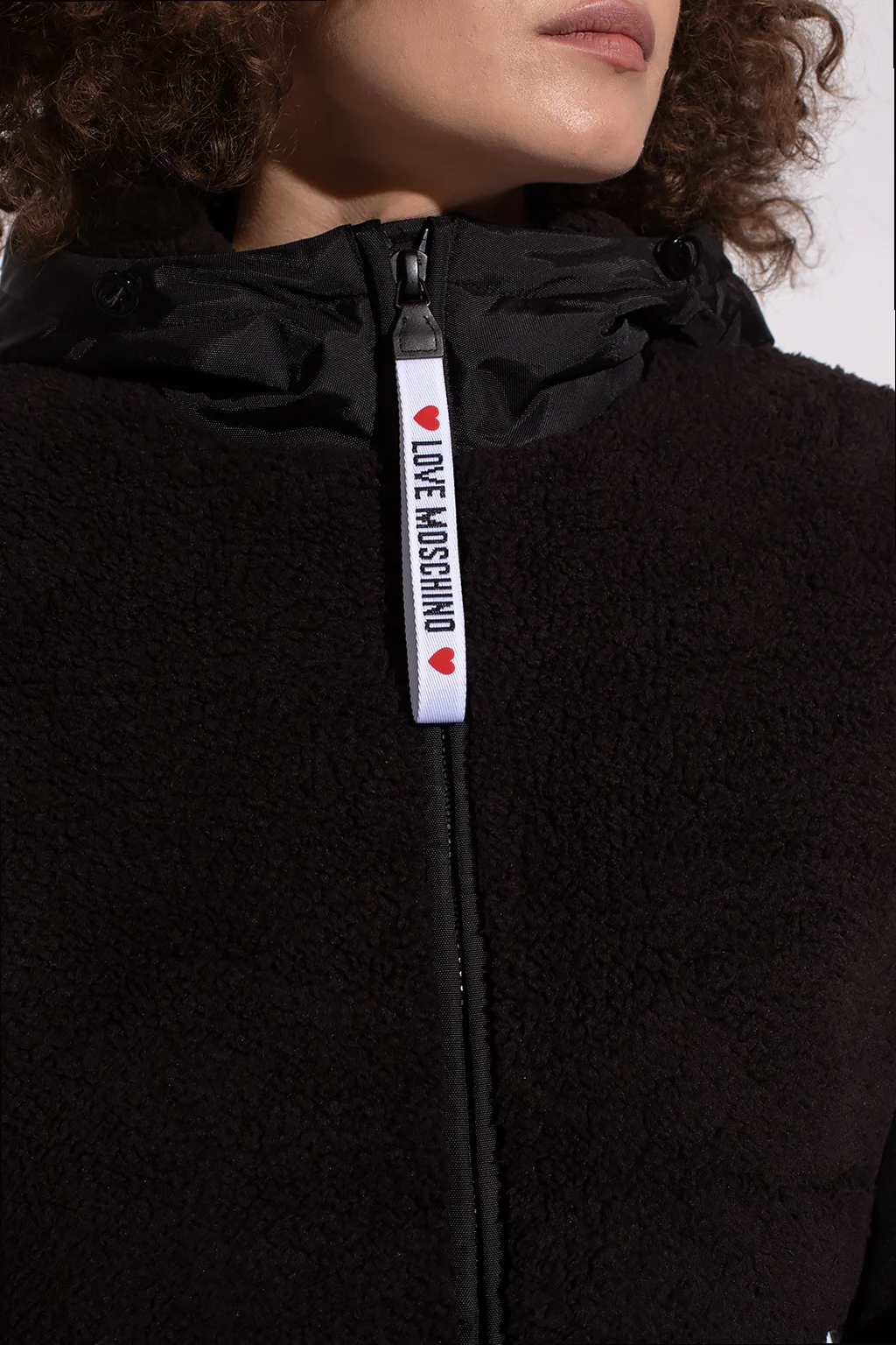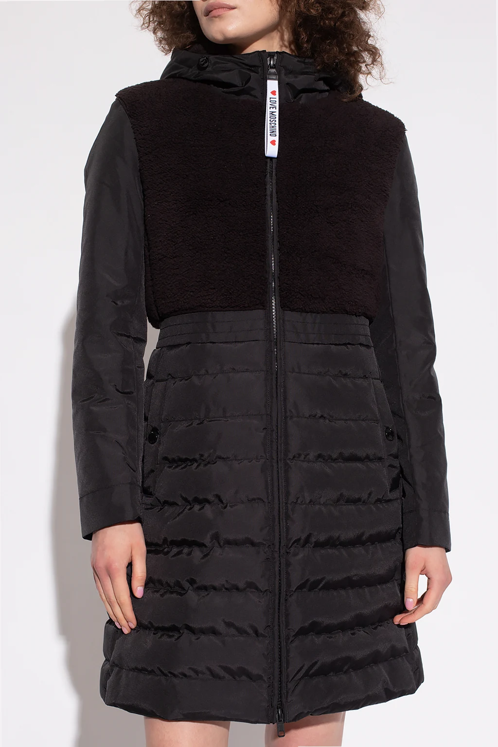 Black coat from Love Moschino. Fastened with a two-way zip, this garment features a white, black and red logo pattern, two snap-fastened pockets, drawstring hood and long sleeves.