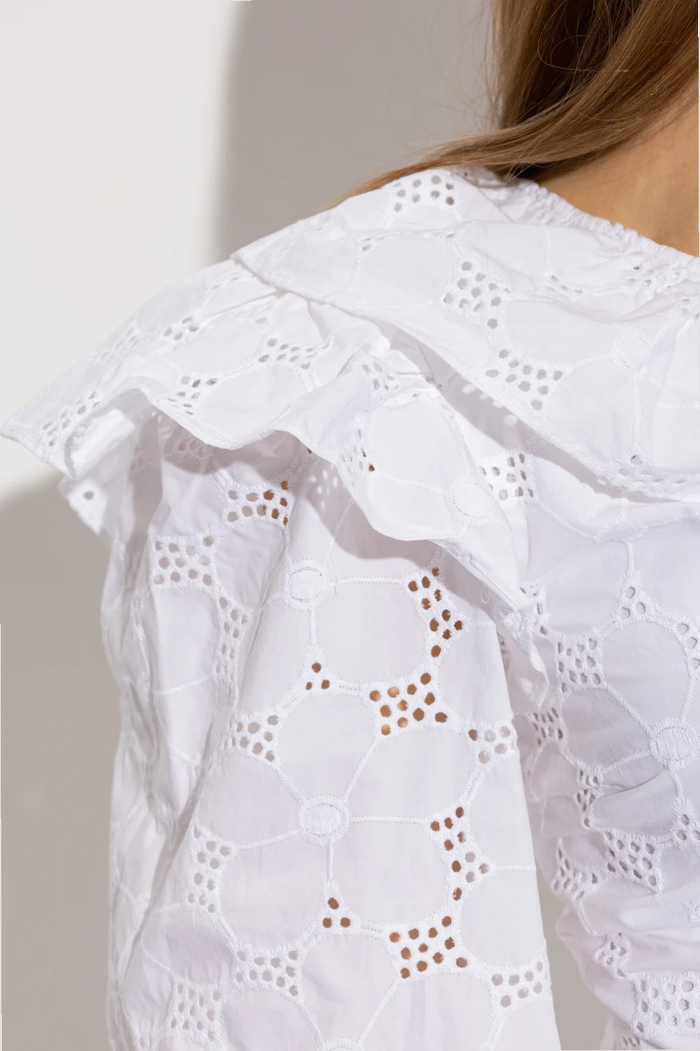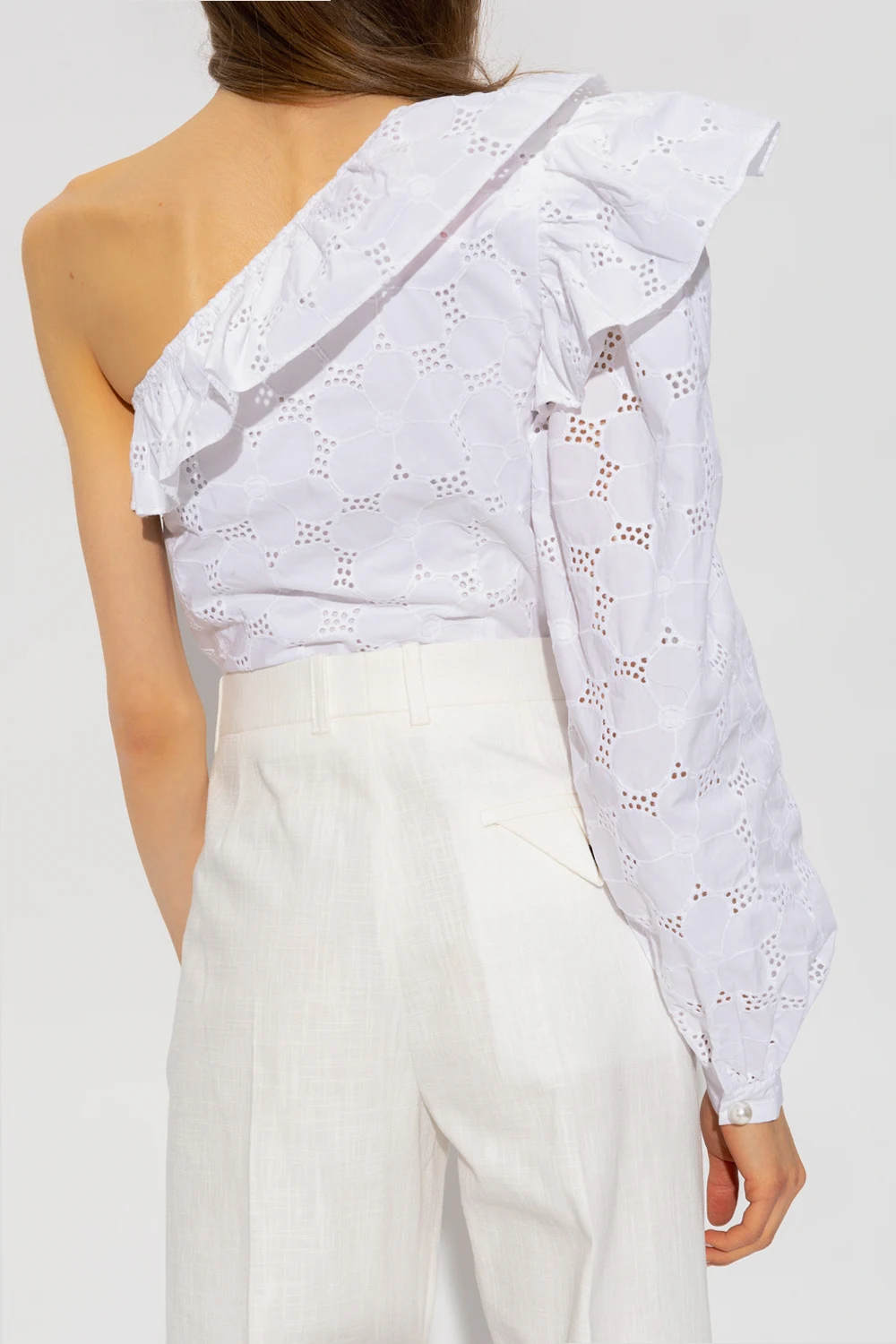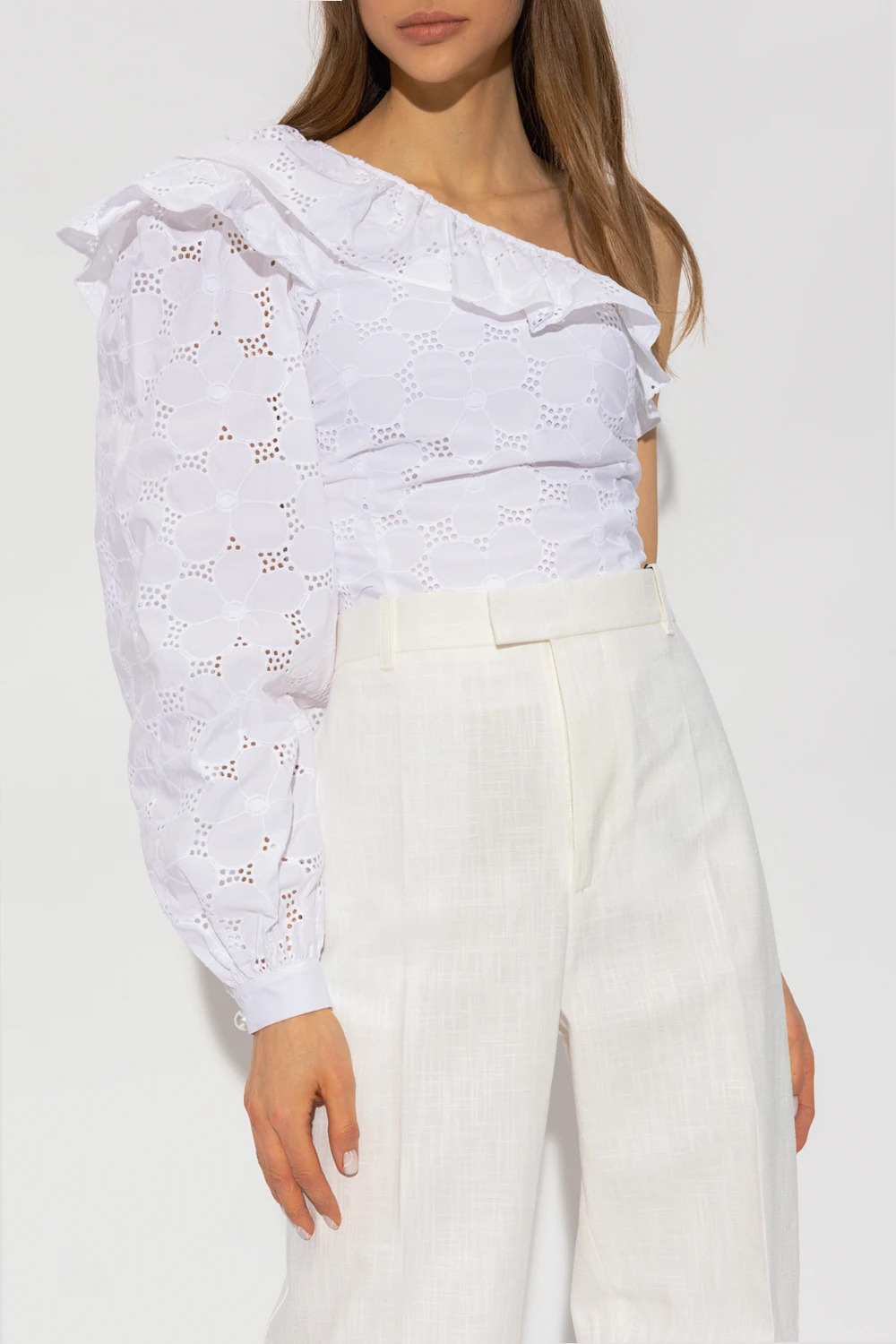 White ‘Saddy’ top from Custommade. Made of cotton with cutwork detailing, this style fastens with a back zipper and features a denuded shoulder, decorative ruffles and one long sleeve with a button cuff.