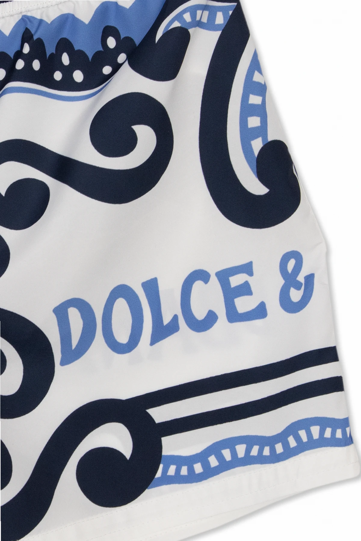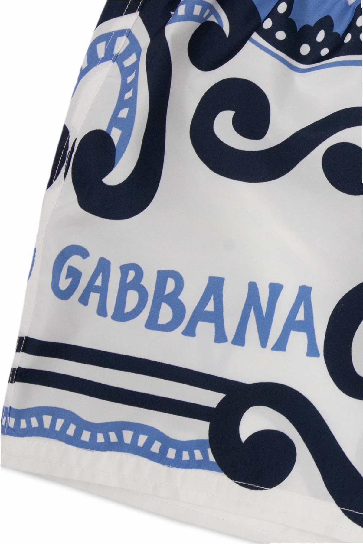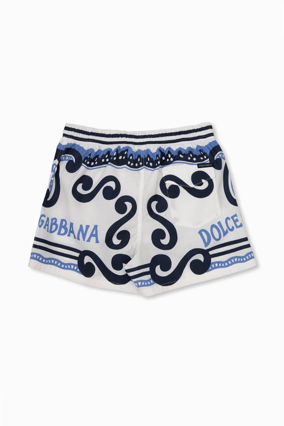 White swimming shorts from Dolce & Gabbana Kids. Embellished with a blue ‘Marina’ pattern and logo, this pair features a drawstring waistband and one flapped pocket on the back.