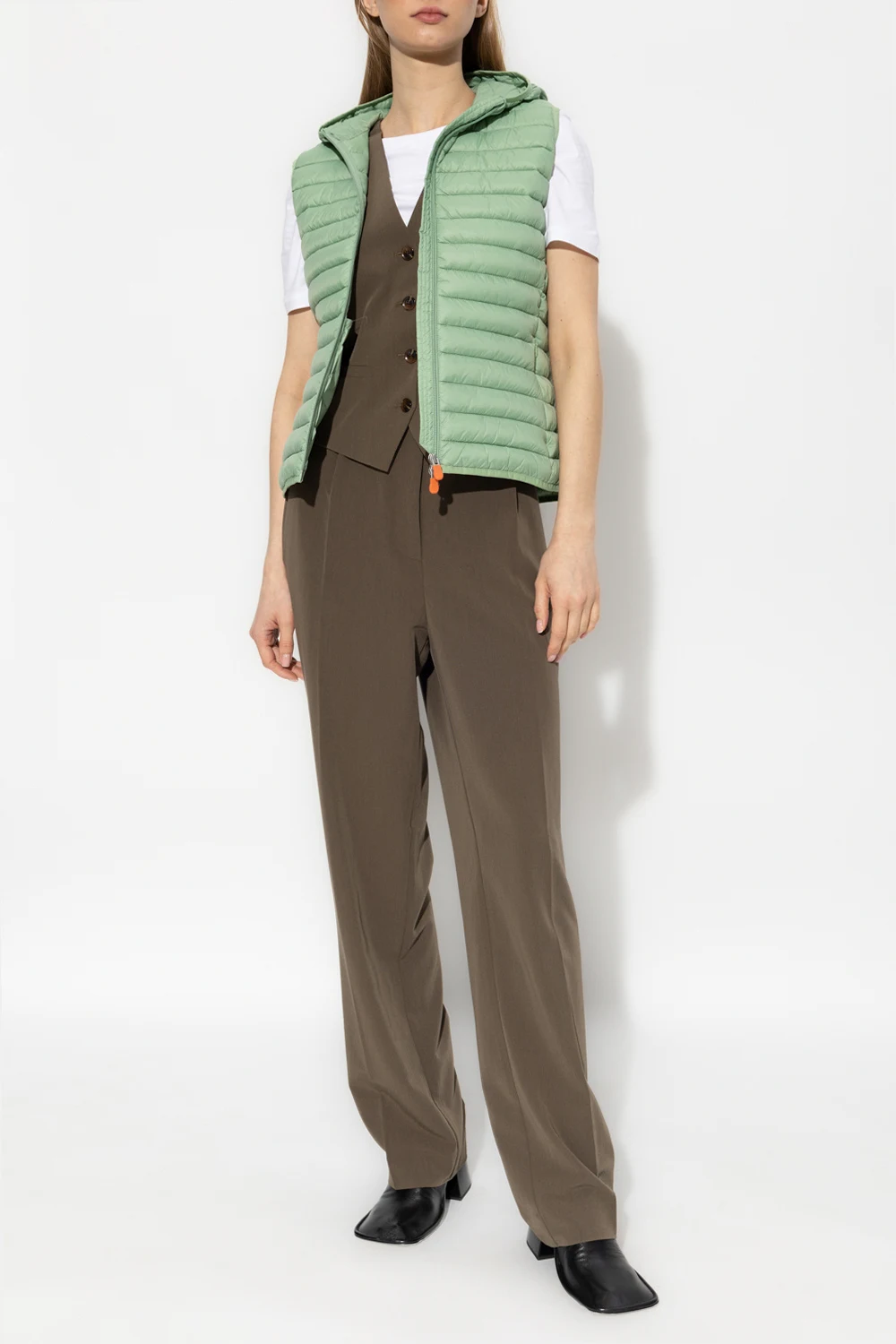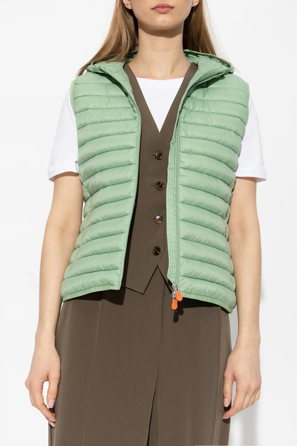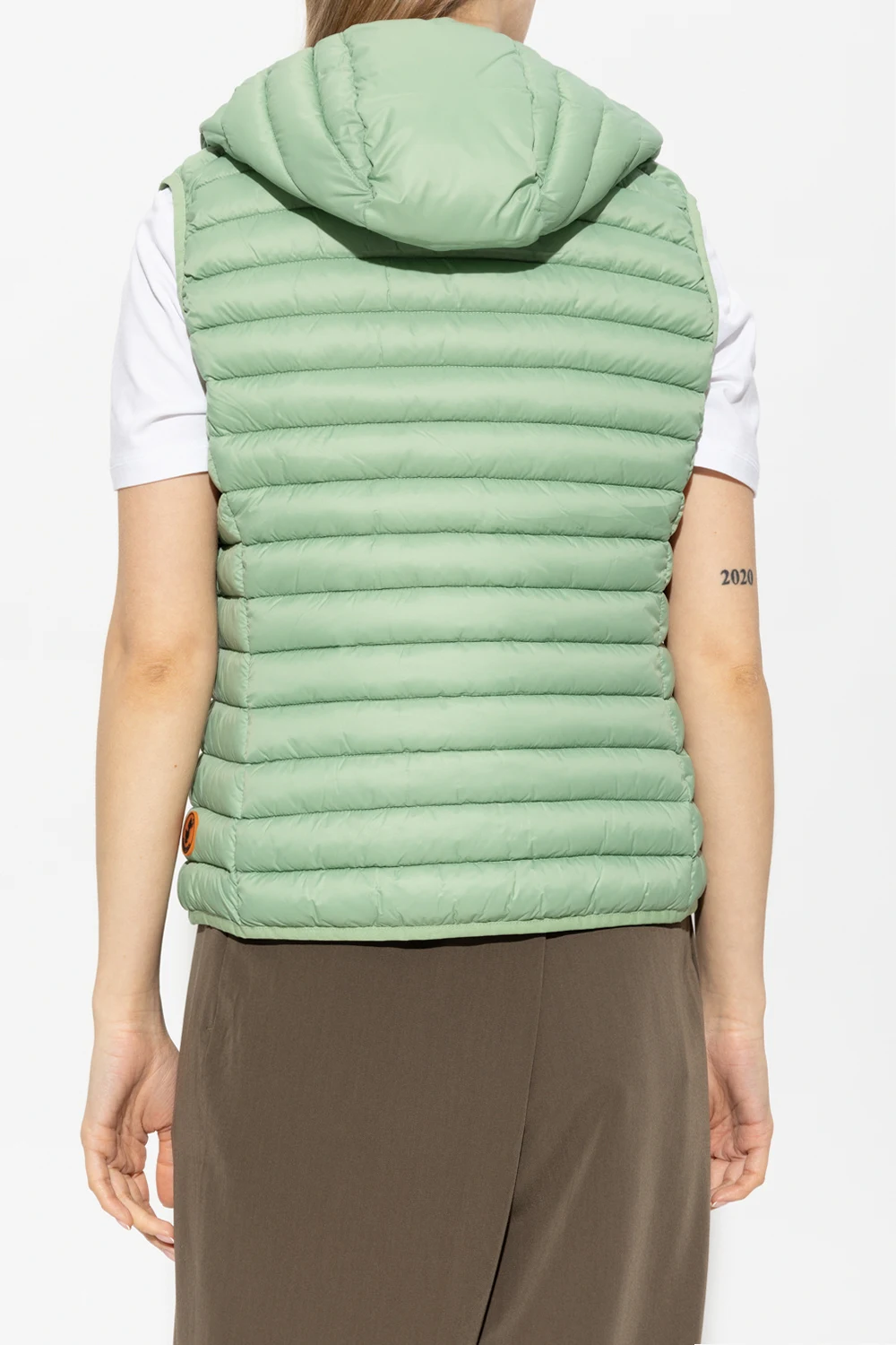 Green ‘Dia’ quilted vest with a hood from Save The Duck. Fastened with a two-way zipper, this style features two front zip pockets and a rubber logo patch on the side. It\'s made with high-density 100% nylon fabric which guarantees weightlessness and fluffiness. It is thin yet resistant, thanks to its features it guarantees water repellency and wind protection, it absorbs humidity and dries rapidly.