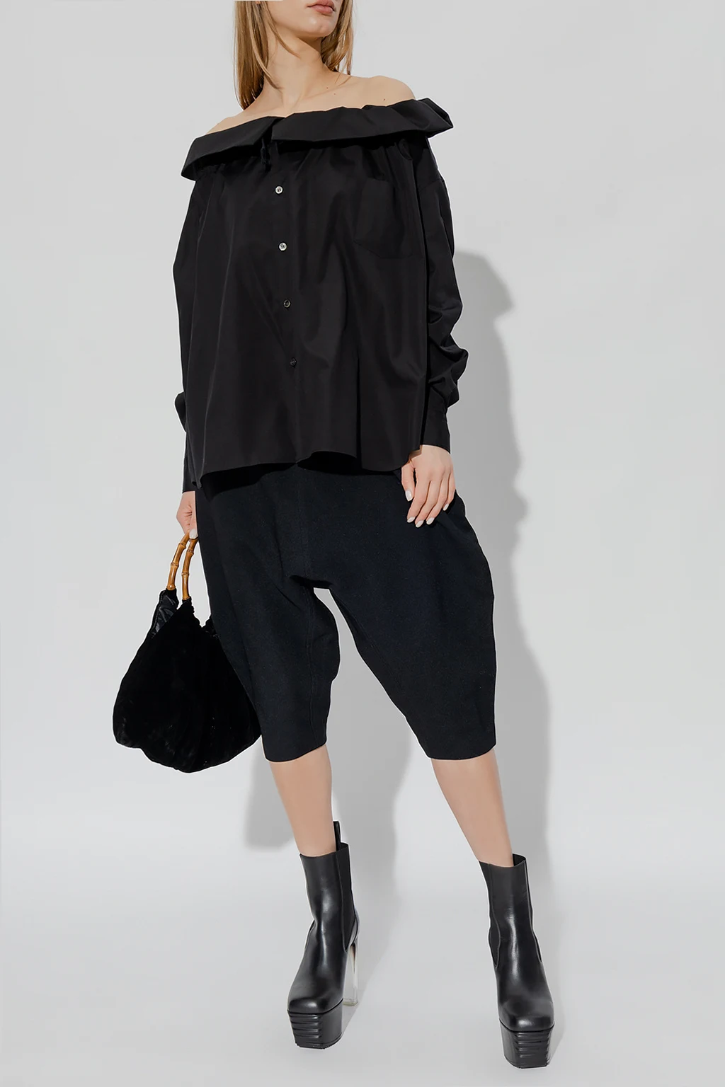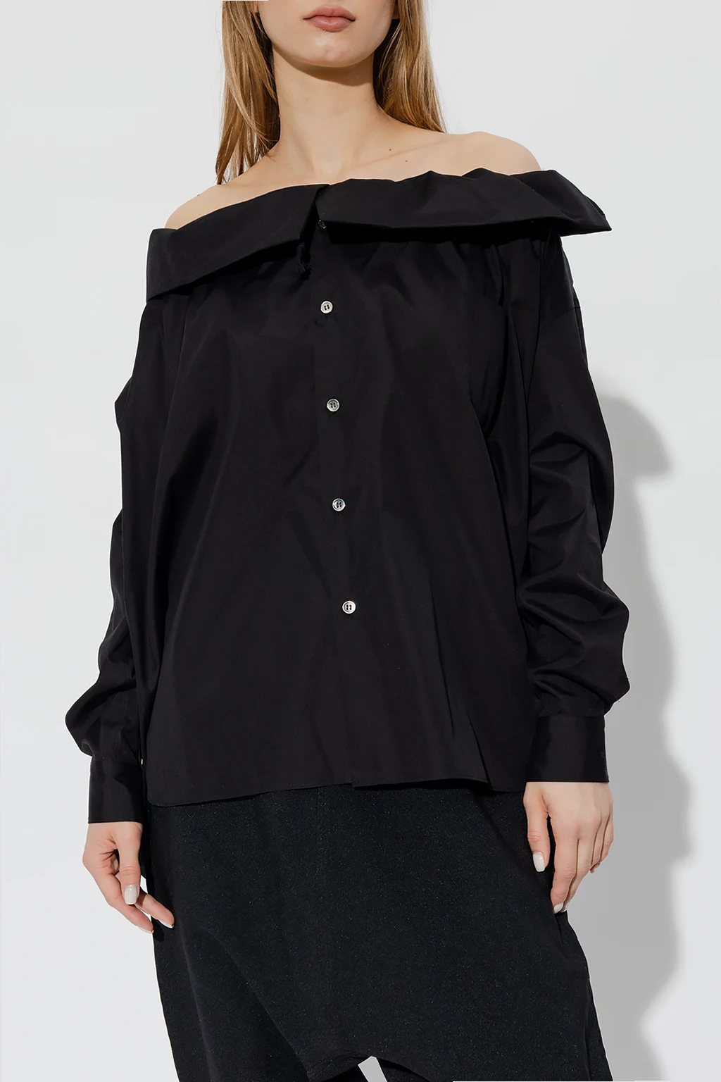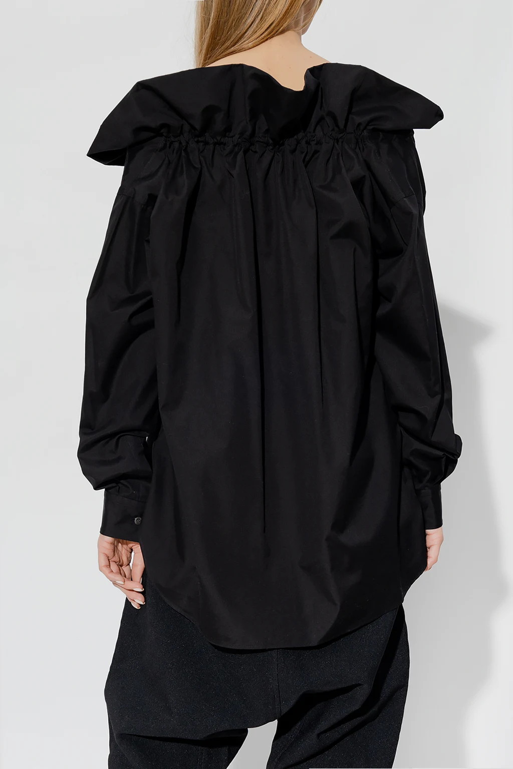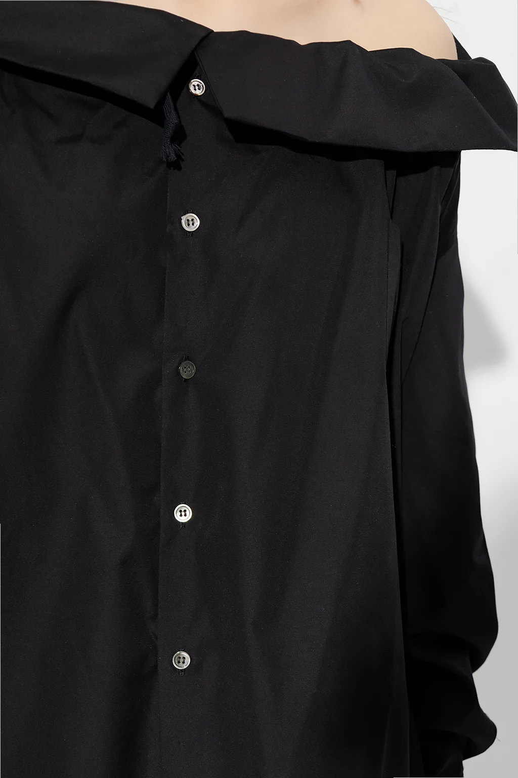 Black shirt from CDG by Comme des Garcons. Made of cotton, this long sleeve design features button fastenings and decorative trimming at the neckline.