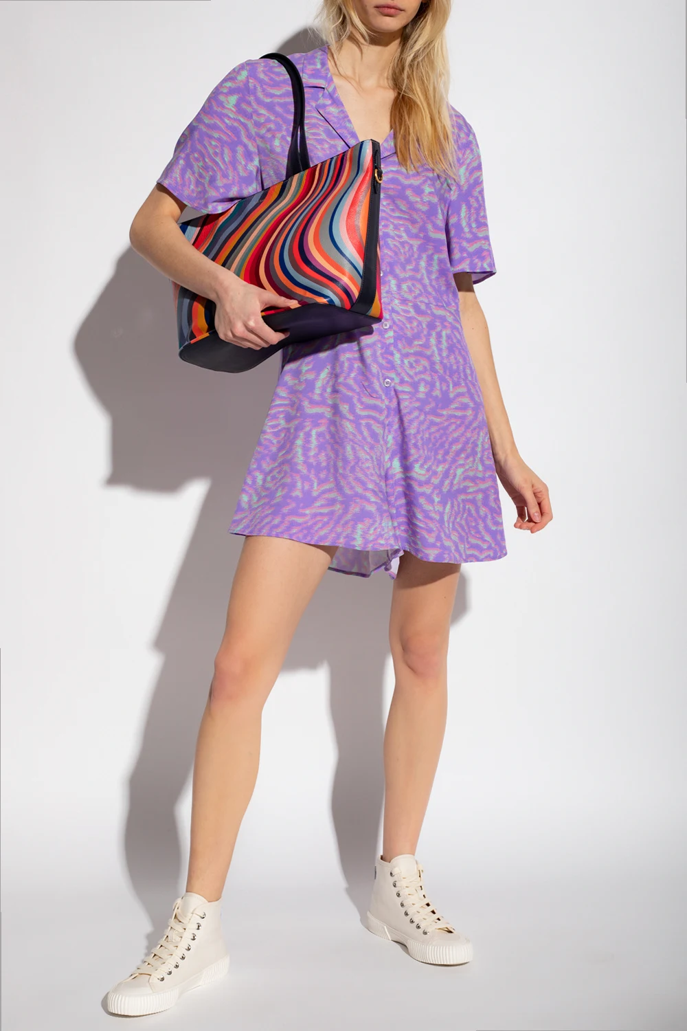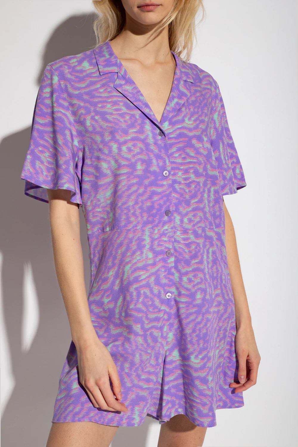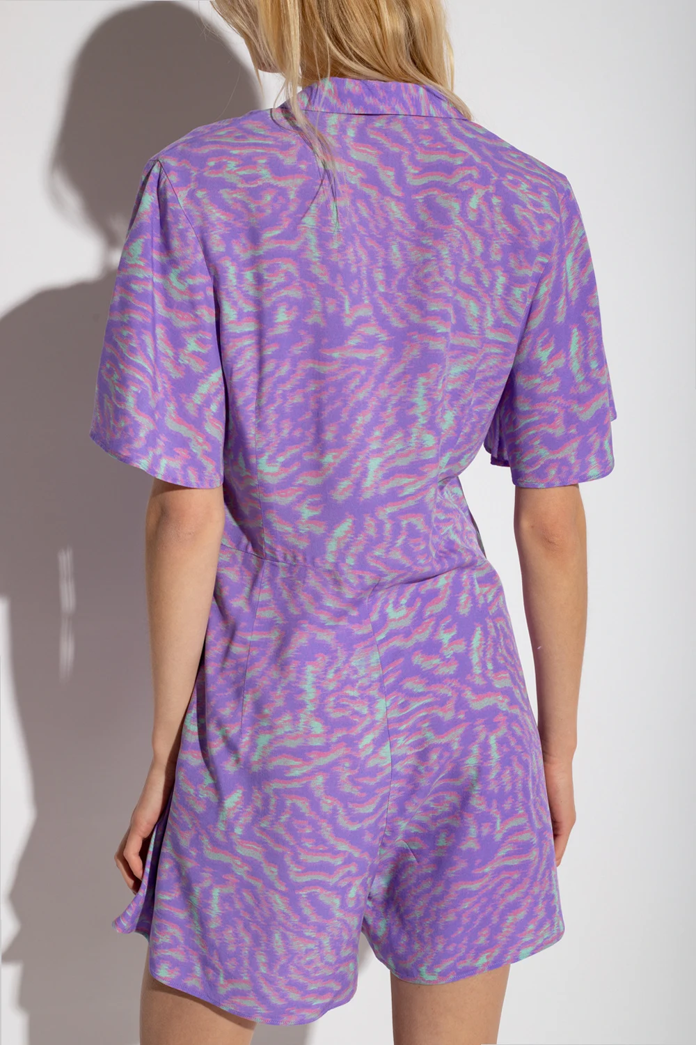 Purple, pink and green jumpsuit from PS Paul Smith. Illustrated with an all-over pattern, this style features button fastenings and short sleeves and short legs.