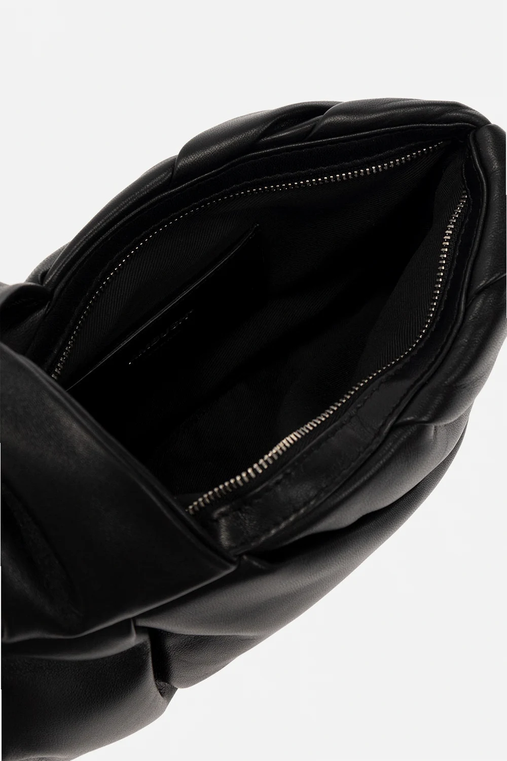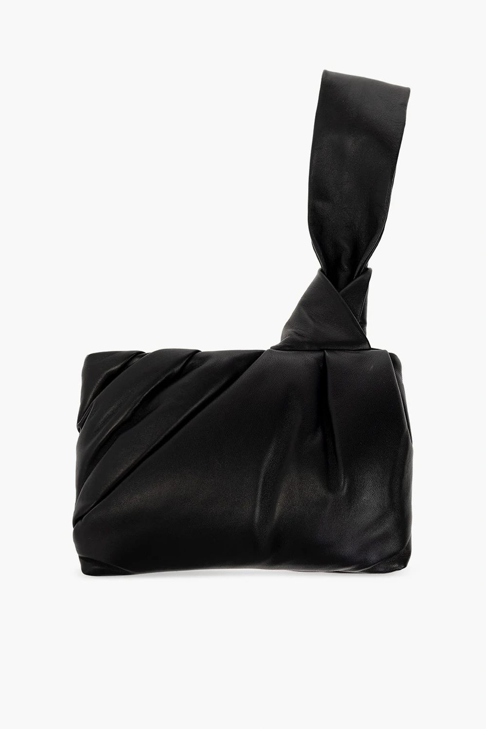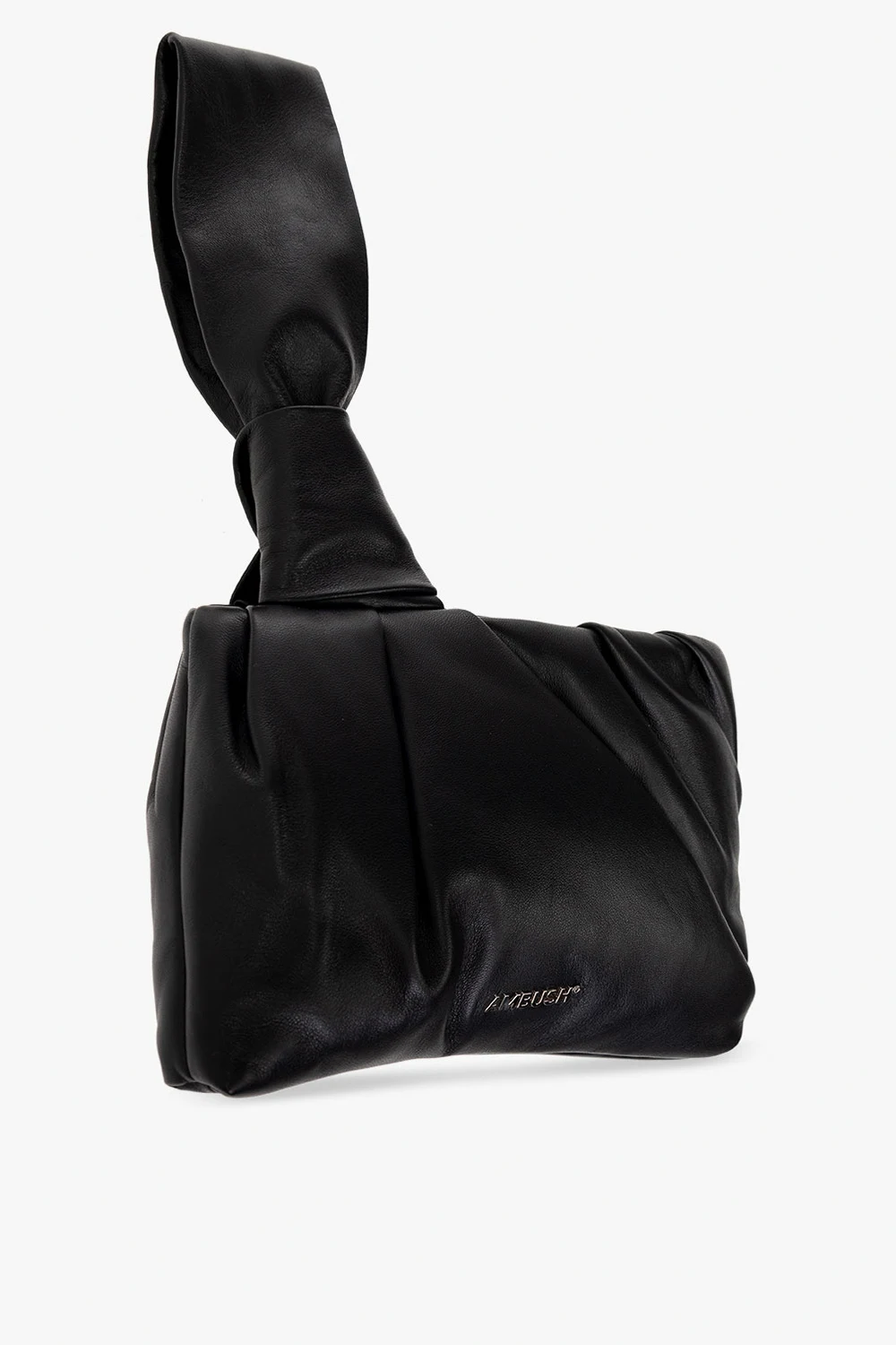 Black handbag from AMBUSH. Crafted from lamb leather, this design fastens with a zip and features a metal logo plaque on the front, a short wrist strap, silver-tone metal hardware and one internal compartment with a card slot.