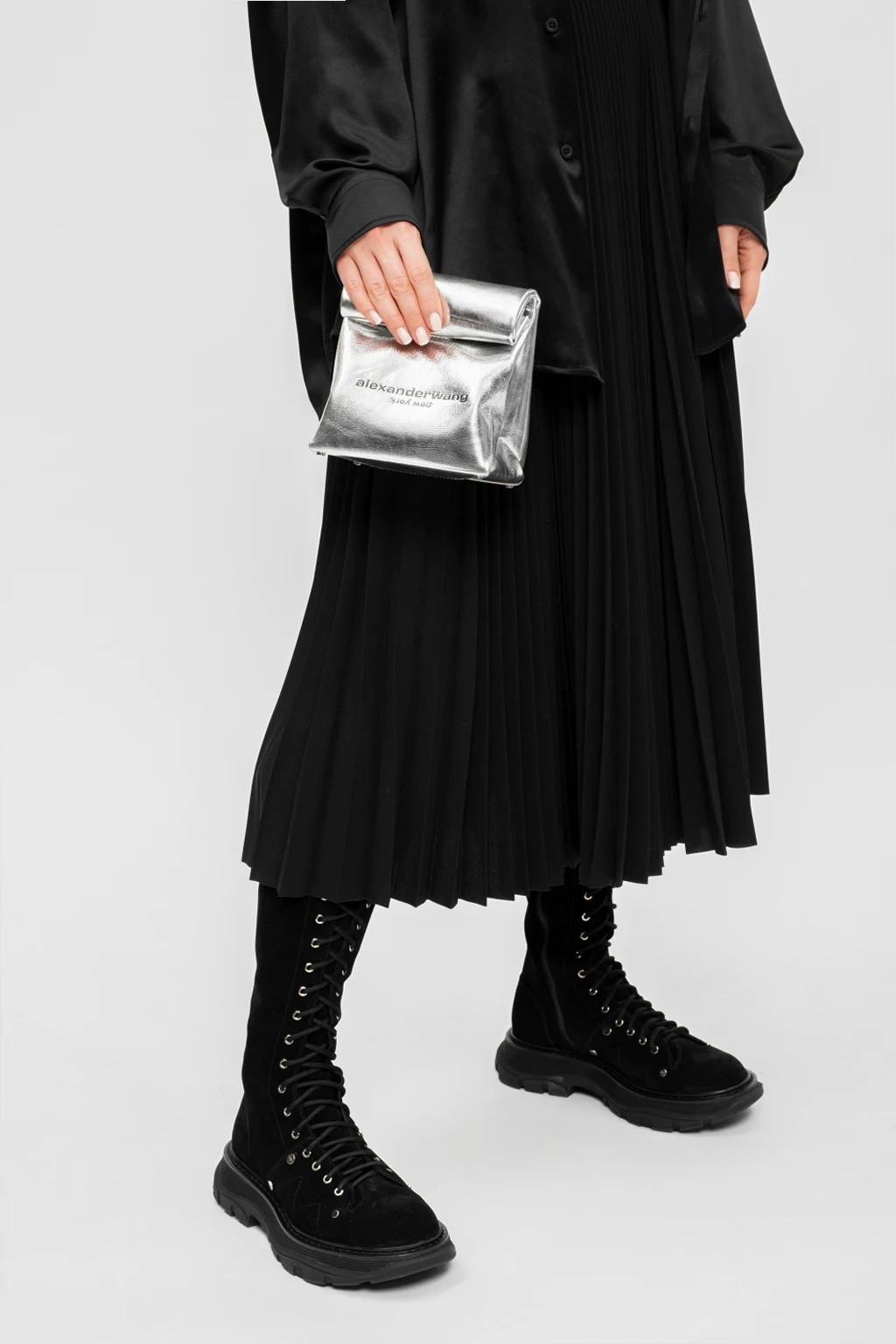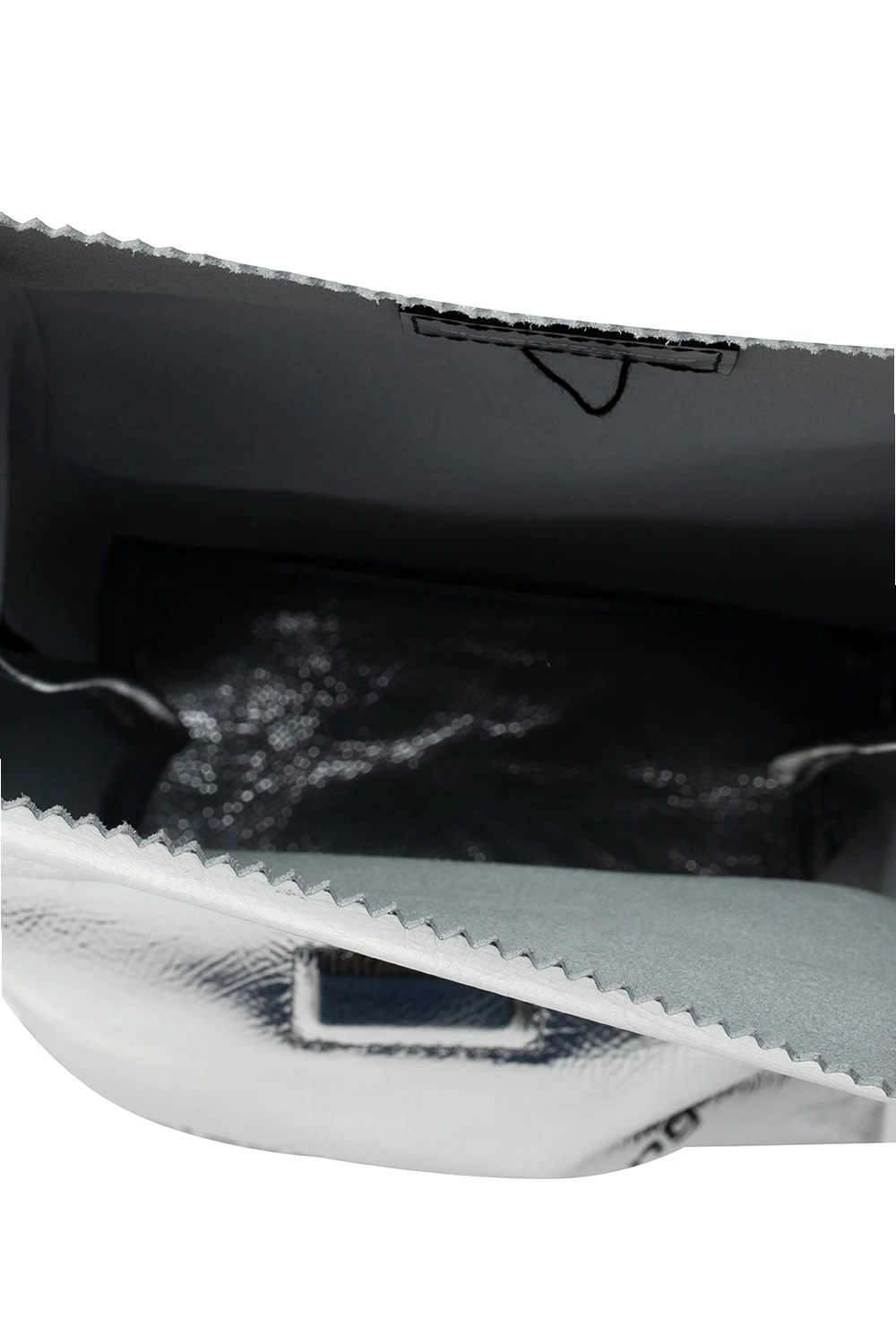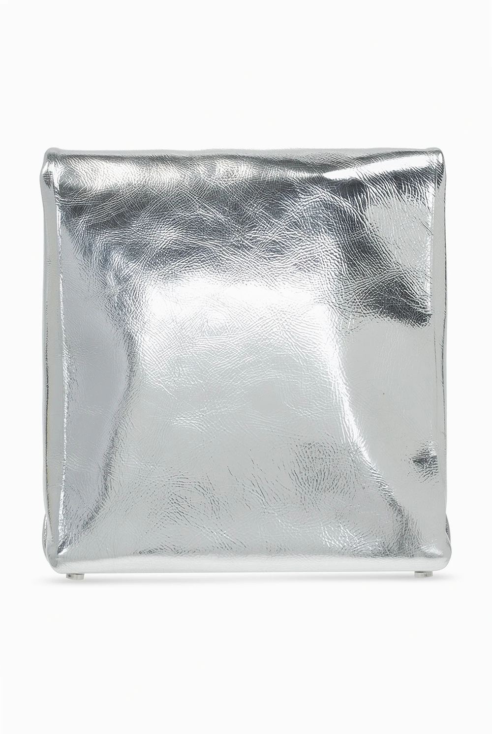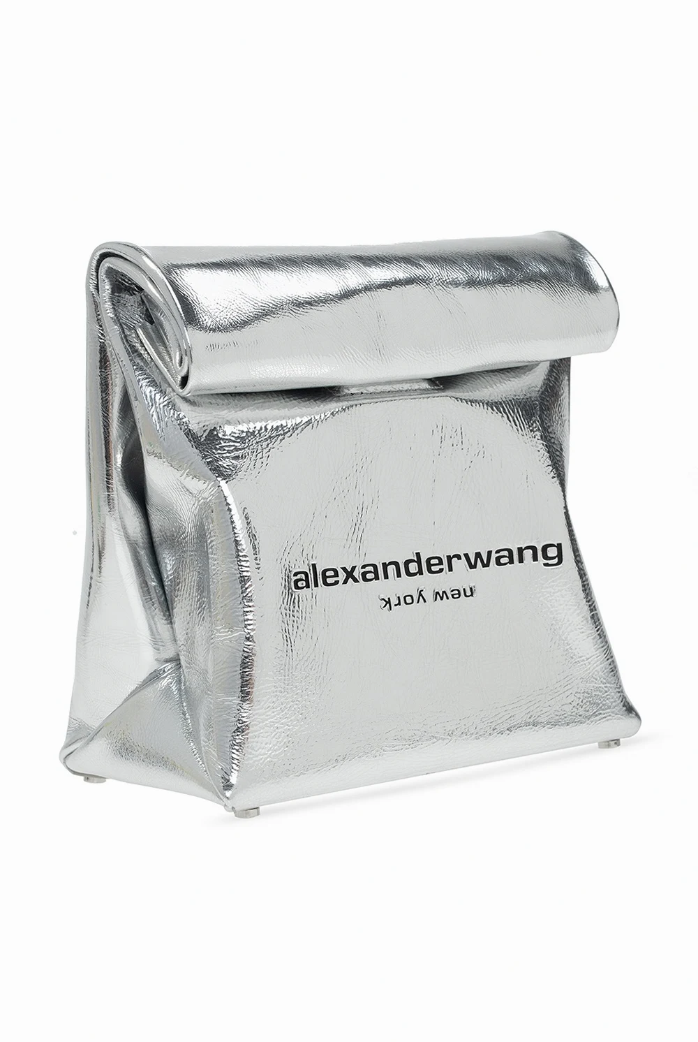 Silver-tone ‘Lunch’ hand bag from Alexander Wang. Crafted from patent leather with a texture throughout, this design fastens via a magnetic snap-buttons and boasts a black logo print for the brand recognition. Its interior includes one compartment.