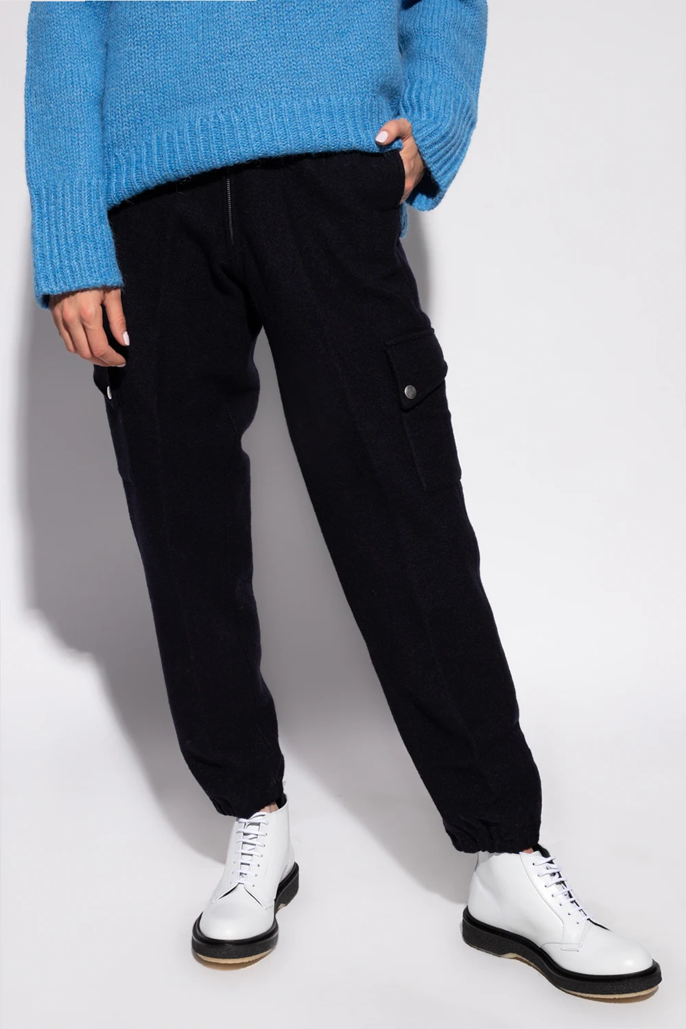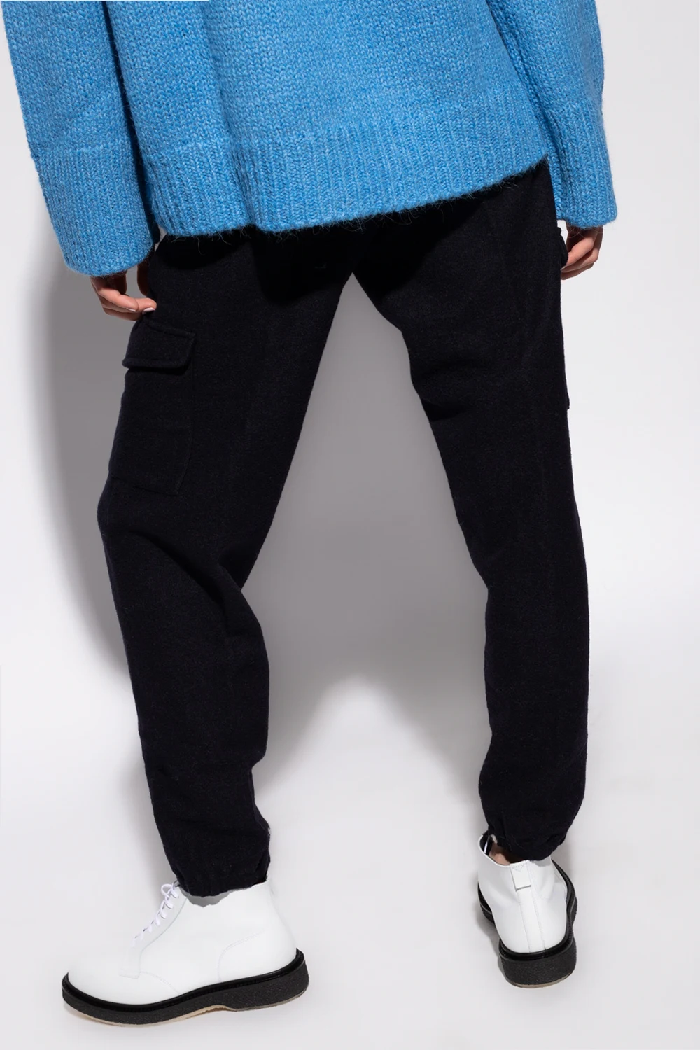 Black trousers from Jil Sander. Crafted from a wool blend with a high-waisted silhouette, this pair features a zip fly, elasticated cuffs and two slip pockets and two flapped pockets with snap closures on the front.