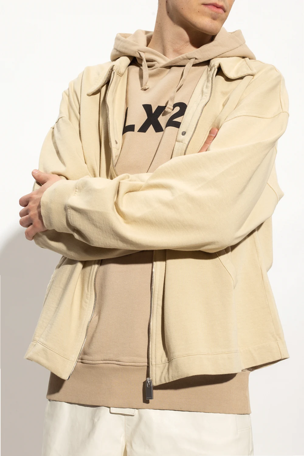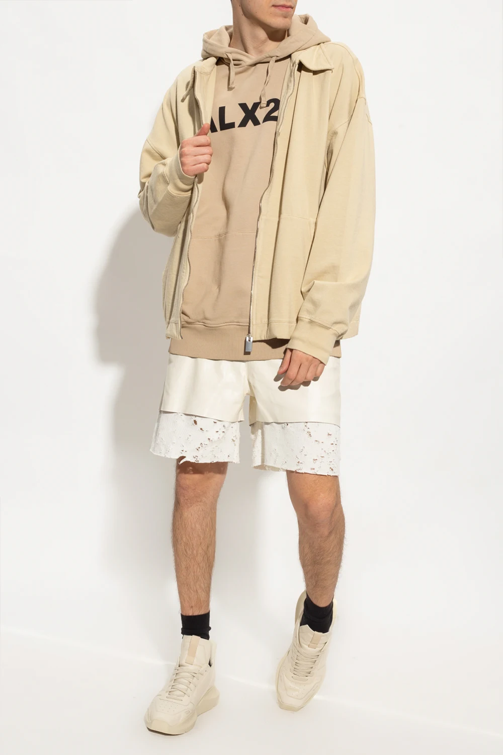 Beige sweatshirt with a collar from 1017 ALYX 9SM. Made of cotton, this long sleeve design features a zip fastening the label’s signature metal Lightercap appliqué in silver-tone, two slip pockets and ribbed trims at the hem and cuffs.
