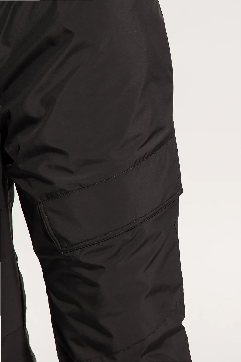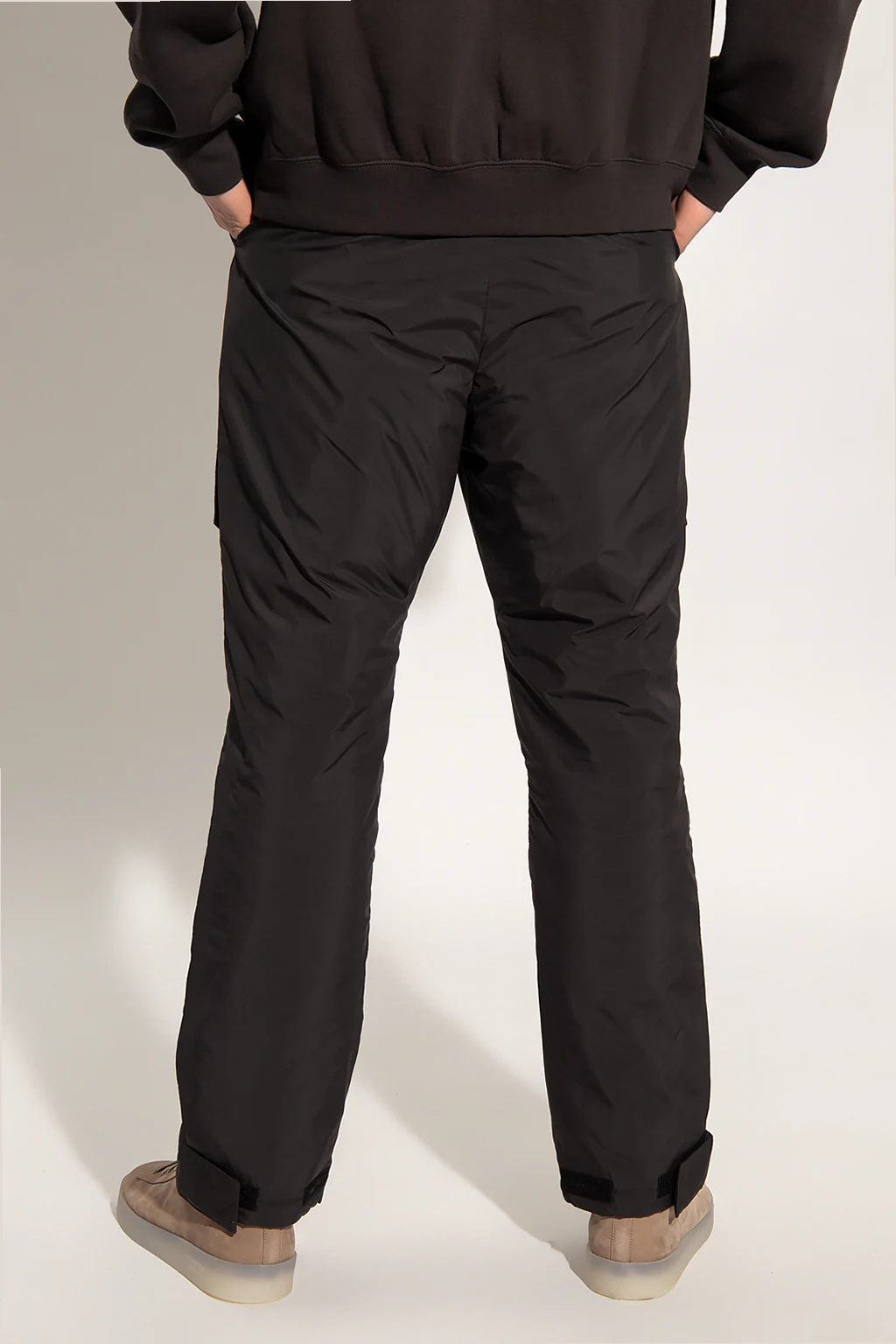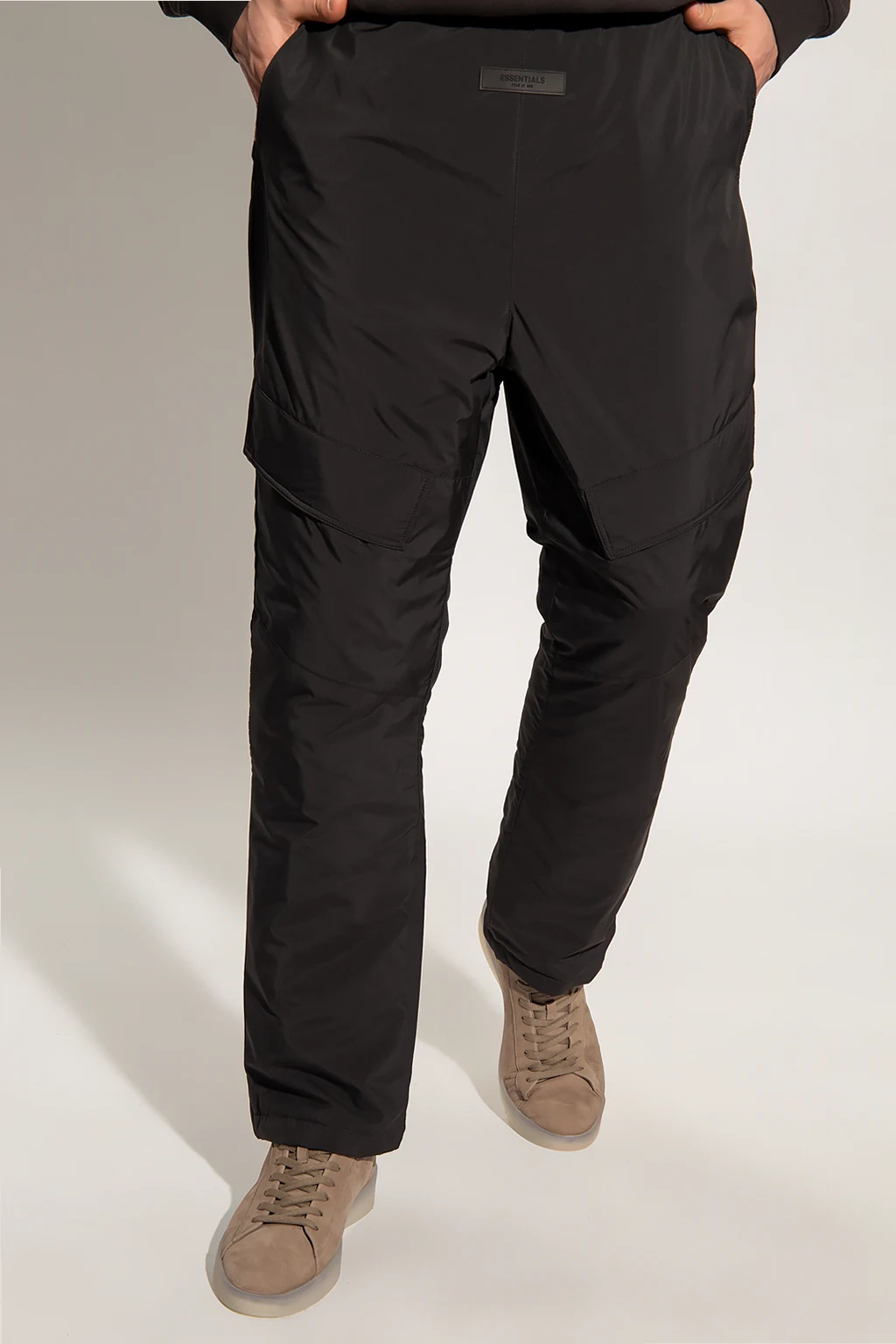 Black trousers from Fear Of God Essentials. Emblazoned with a logo patch, this pair features a branded waistband, two slip pockets, two flapped pockets and velcro closures on the cuffs.