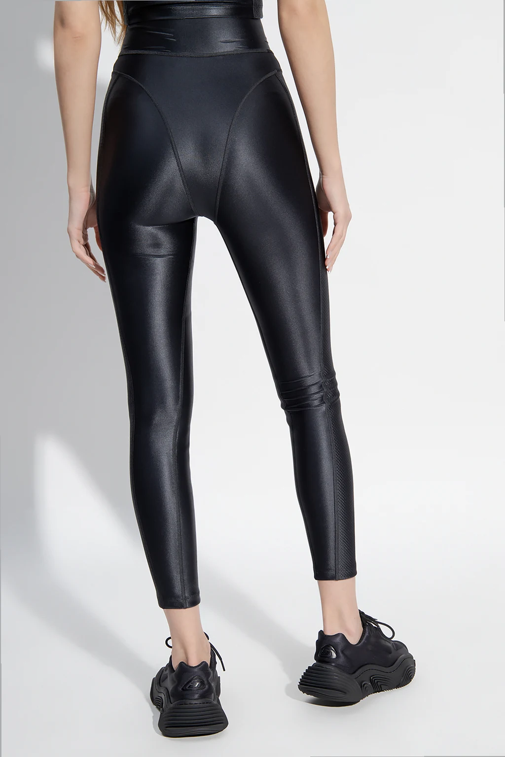 Black high-waisted leggings from Alexander Wang. This tapered leg pair features a white logo print and decorative texture.