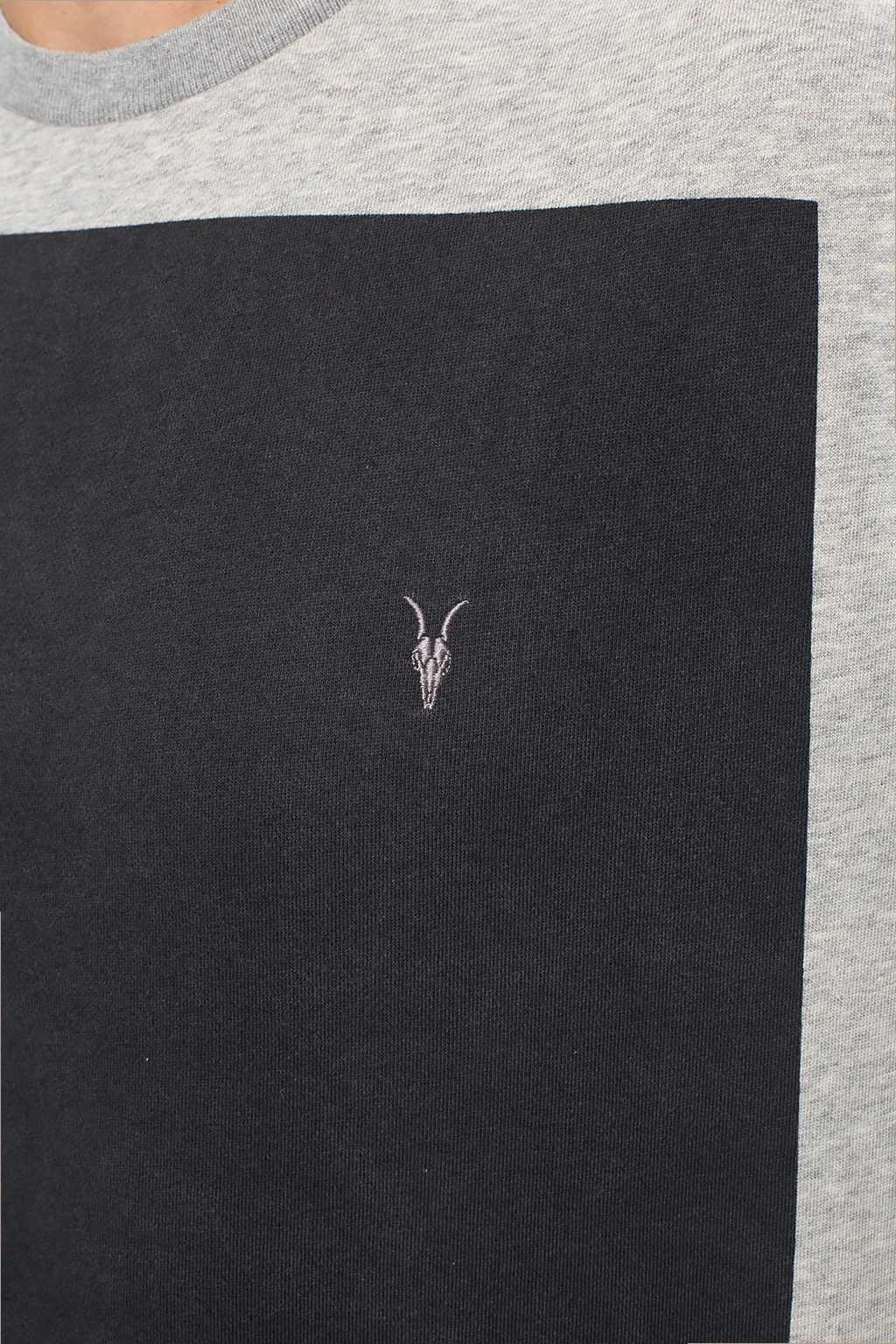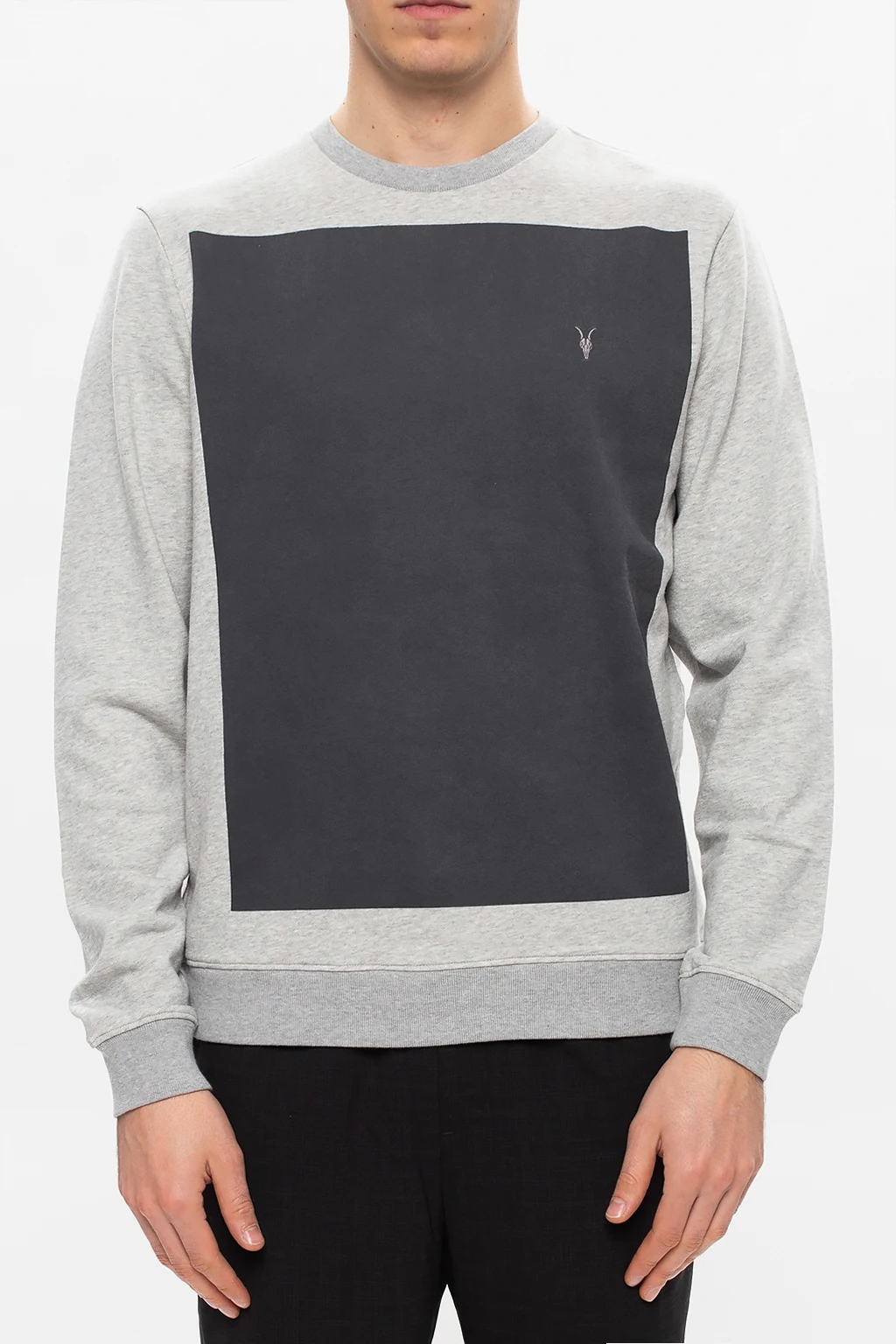 Grey \'Lobke\' crewneck sweatshirt from AllSaints. Embroidered with the brand\'s iconic Ramskull logo on the chest, this cotton-crafted style is complete with ribbed trims.