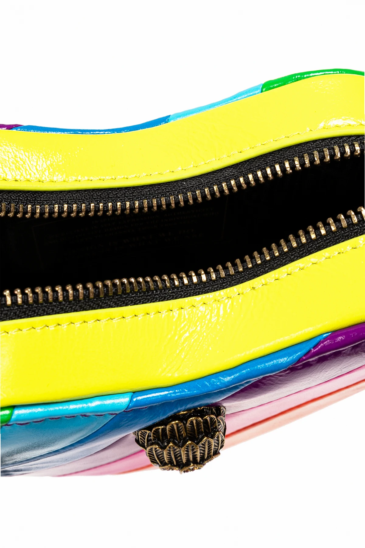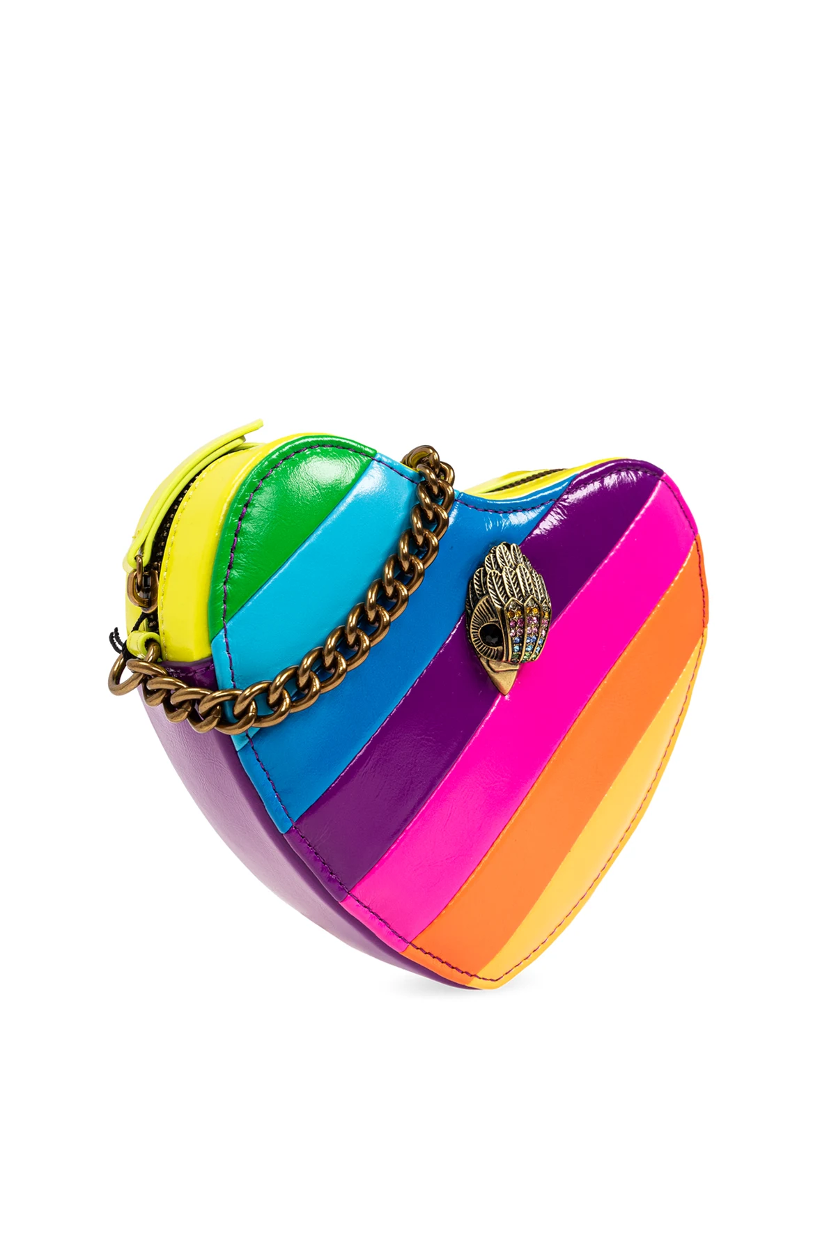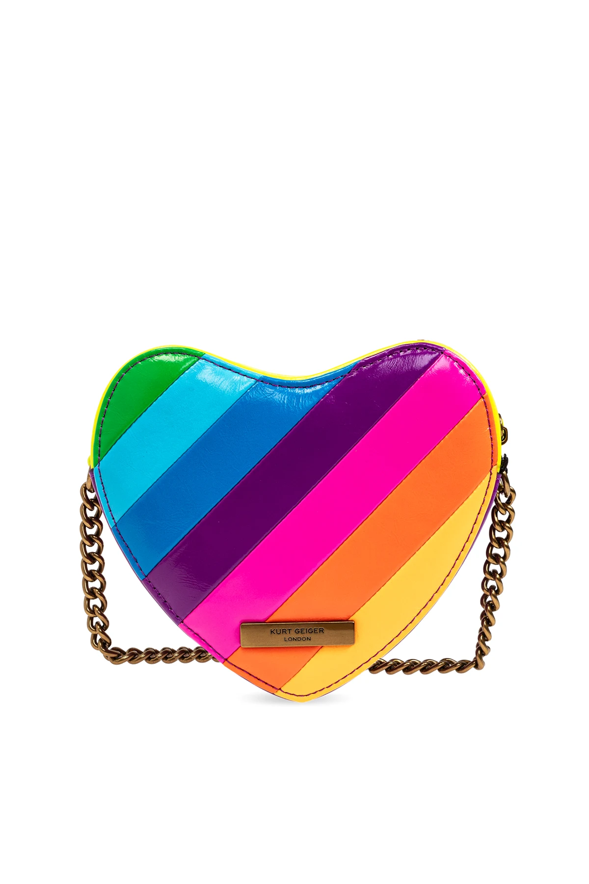 Introducing the Kensington Heart-Shaped Shoulder Bag from the illustrious designer Kurt Geiger. This exquisite piece is a testament to the brand\'s commitment to blending bold aesthetics with practical elegance. Crafted from luxurious, glossy leather, this bag features a unique heart shape adorned with vibrant horizontal stripes in shades of green, blue, purple, pink, orange, and yellow. The front proudly displays an ornate bird head embellishment encrusted with colorful crystals, adding a touch of opulence. The bag\'s opulent design is complemented by a gold-toned metal chain strap, ensuring both durability and style. A meticulously engraved metal plaque on the back showcases the designer\'s logo, while a black zippered closure with yellow accents secures your belongings with finesse. Inside, a spacious compartment lined with premium fabric offers ample room for your essentials, making it as functional as it is fashionable. Why Choose This Product? Striking Design: Eye-catching multicolor stripes and a heart shape make a bold fashion statement. Luxurious Materials: Made from high-quality leather and fabric for lasting elegance. Unique Embellishments: Features a crystal-adorned bird head and a gold-toned chain strap. Brand Prestige: Designed by the renowned Kurt Geiger, known for their innovative and vibrant style. Functional Elegance: Spacious interior with secure zip closure ensures practicality.