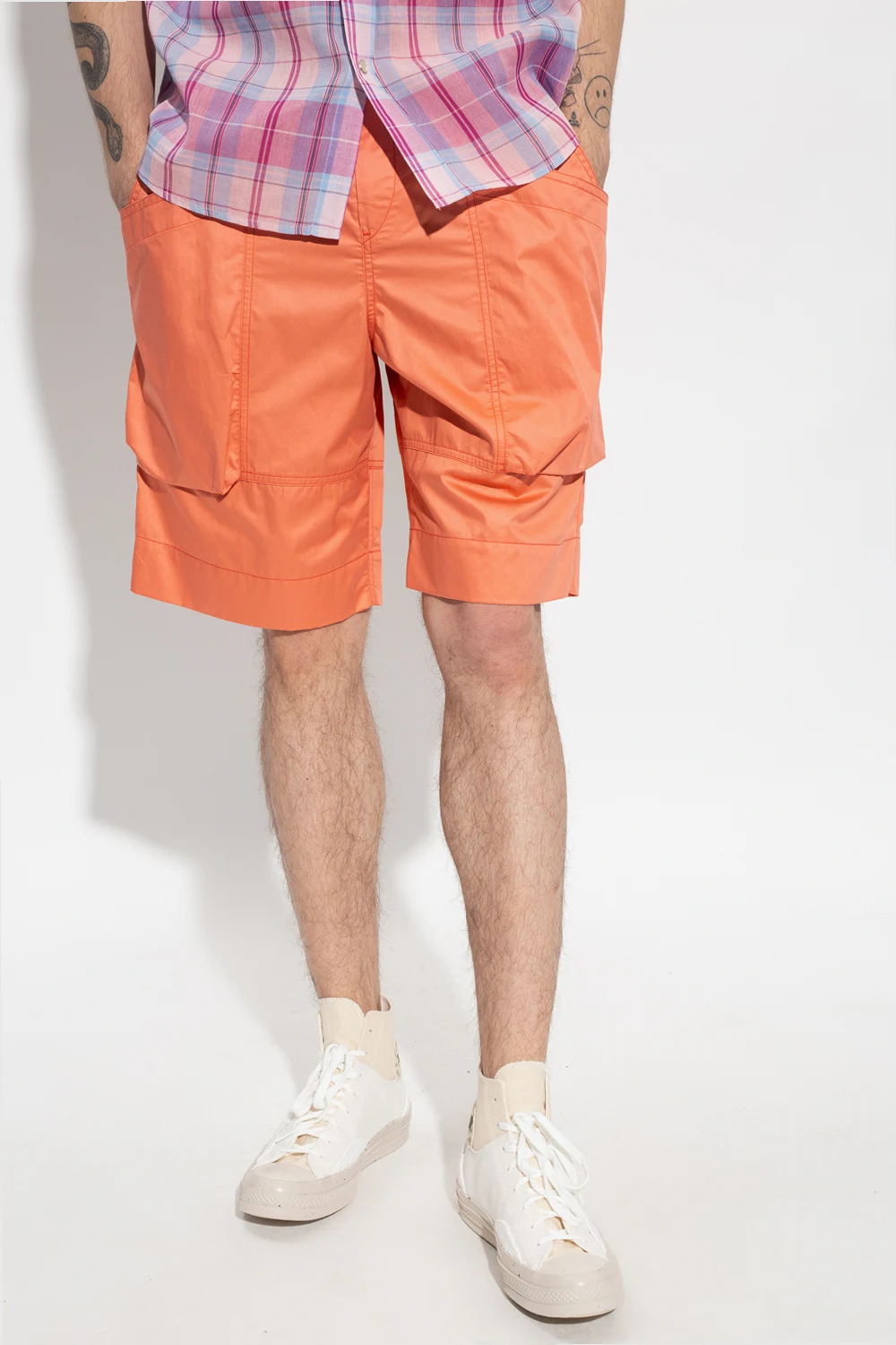 Orange ‘Frayis’ shorts from Isabel Marant. Made of cotton, this pair features a zip fly with a press stud, a buckled belt, four pockets on the front and two snap-fastened pockets at the back.