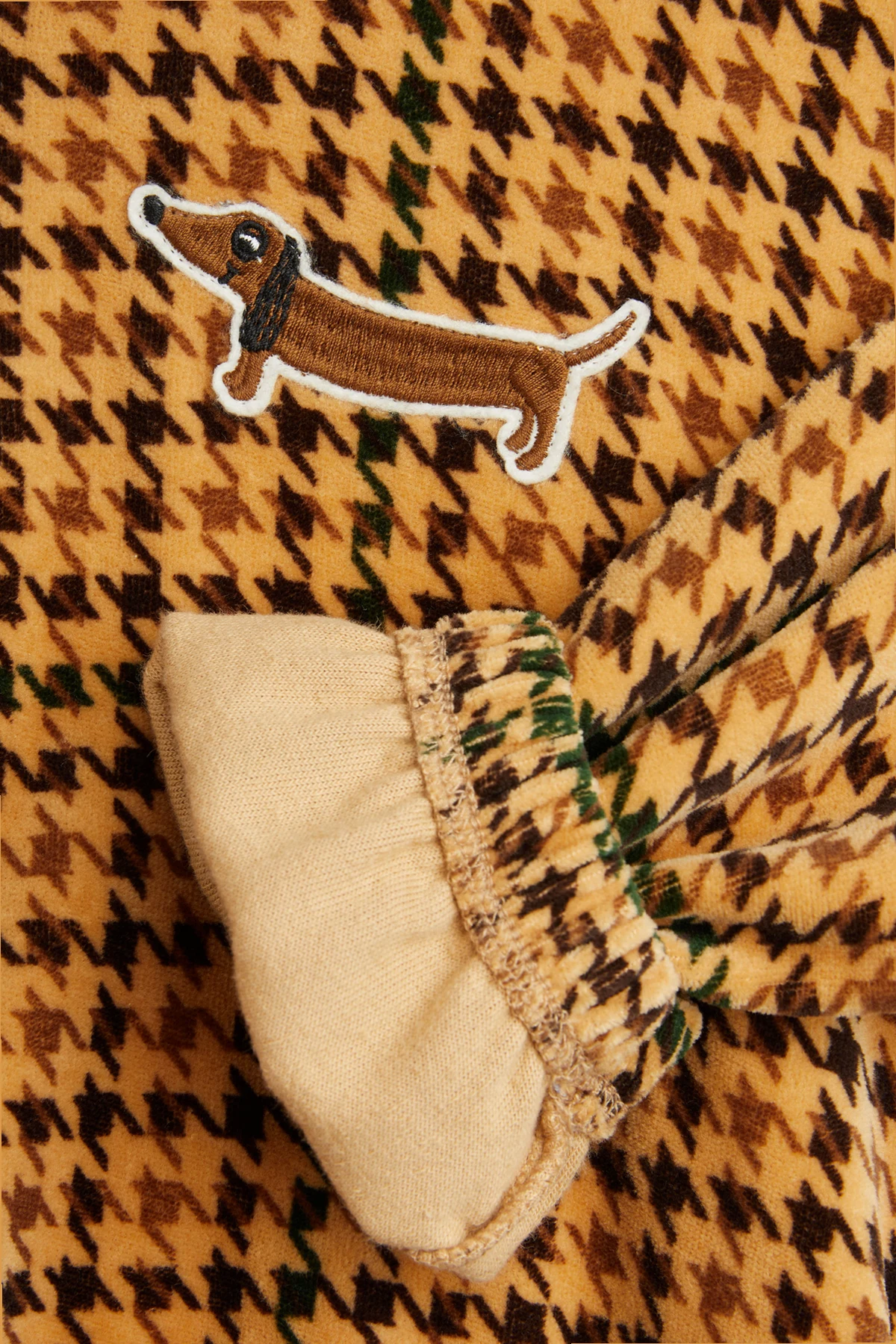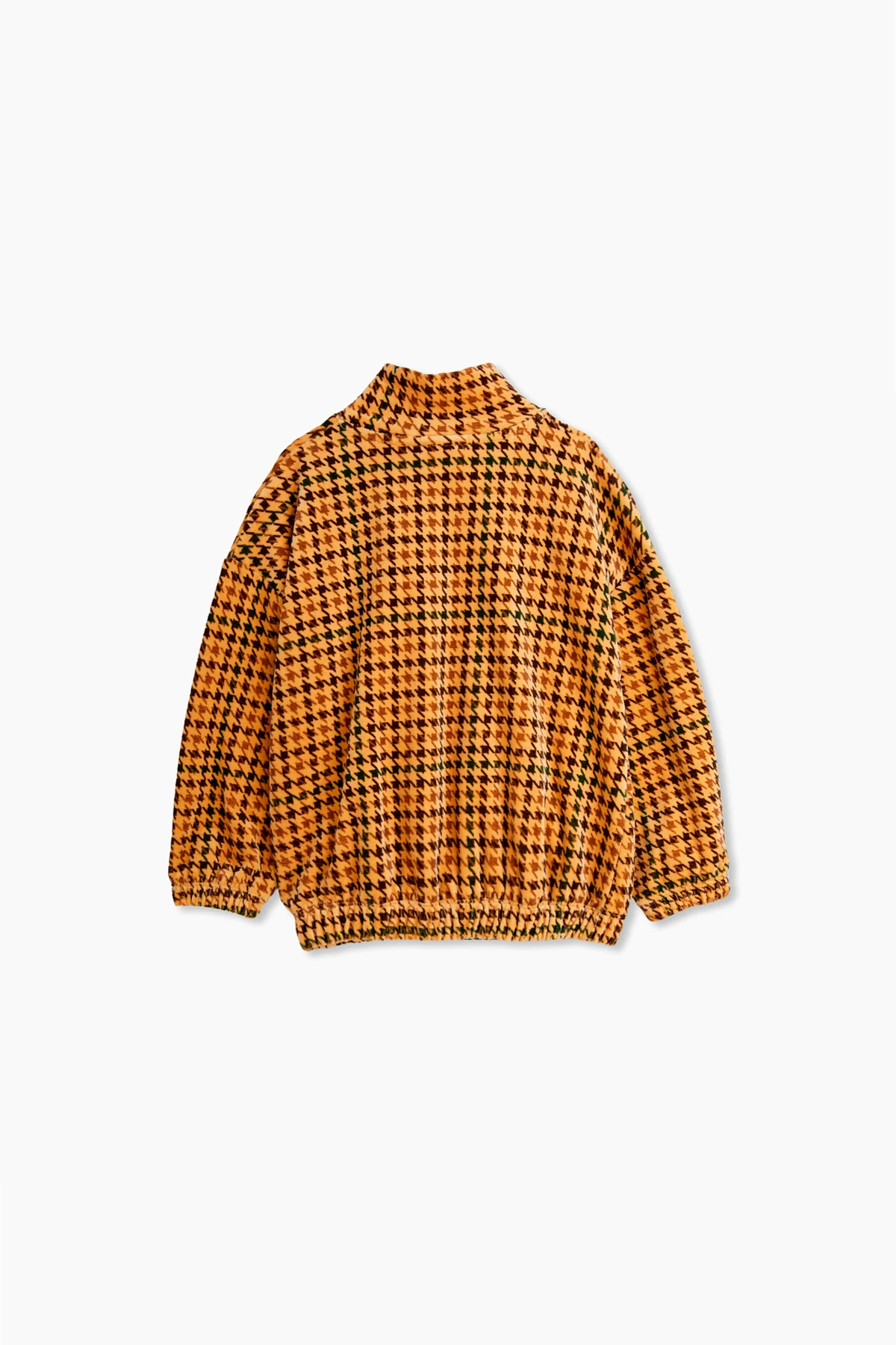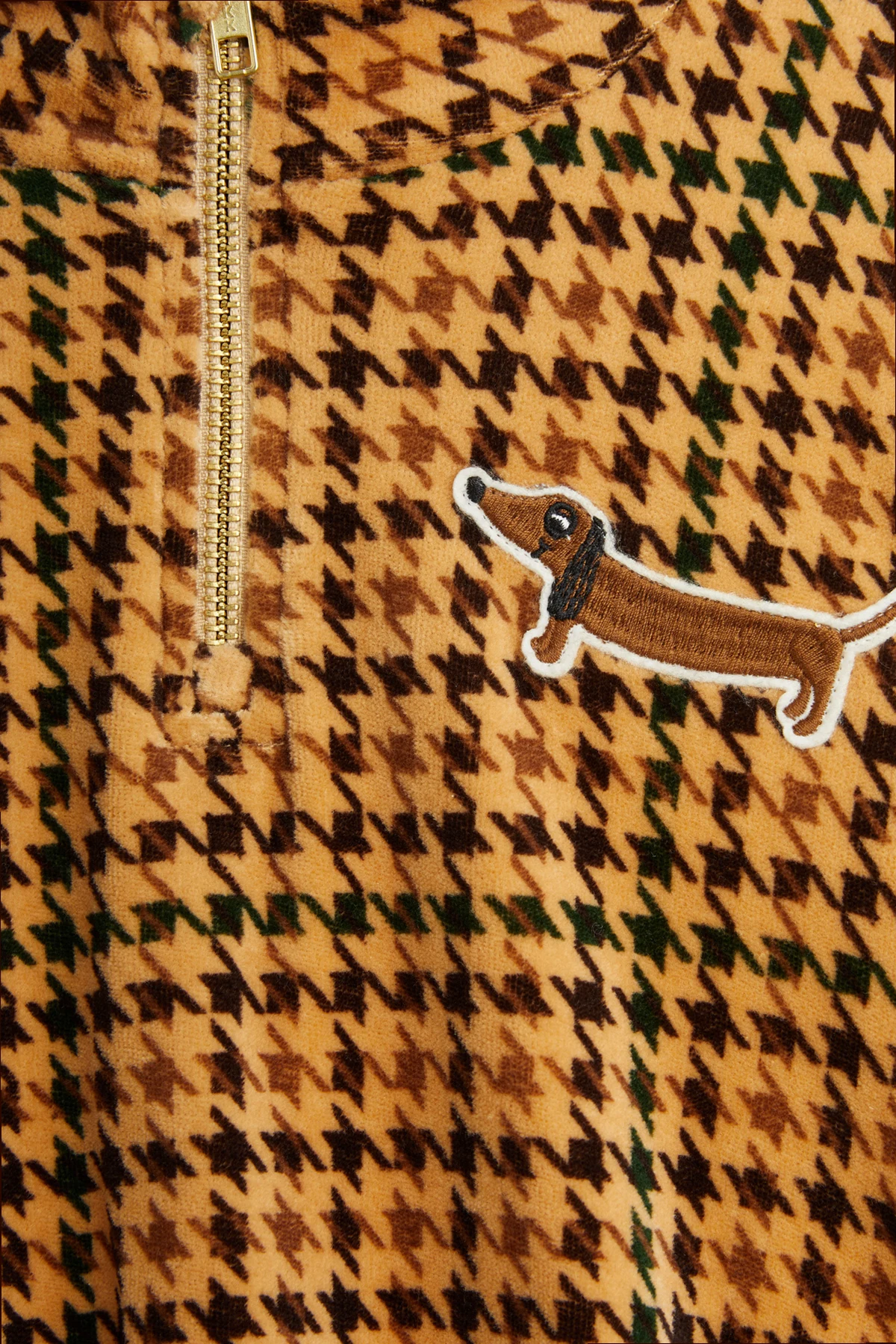 Introducing an exquisite addition to your child\'s wardrobe: the Mini Rodini Velvet Sweater. This exclusive piece, tailored for girls aged 4 to 14, showcases a sophisticated multicolored houndstooth pattern in shades of brown, black, and green. Crafted from the finest velvet, this sweater offers unparalleled softness and comfort, making it perfect for any occasion. The embroidered dachshund motif on the front left side adds a playful yet distinguished touch. The sweater features a loose fit with elastic cuffs and hem for enhanced fit and comfort. A short zipper at the collar allows for adjustable neck opening, complemented by a stylish stand-up collar for added elegance and warmth. Why Choose This Product? Exquisite velvet material for ultimate comfort and softness. Elegant houndstooth pattern in sophisticated colors. Unique embroidered dachshund detail. Loose fit with elastic finishes for better fit. Adjustable neckline with short zipper. Designed by the renowned Scandinavian brand Mini Rodini. Part of an exclusive, high-quality collection.