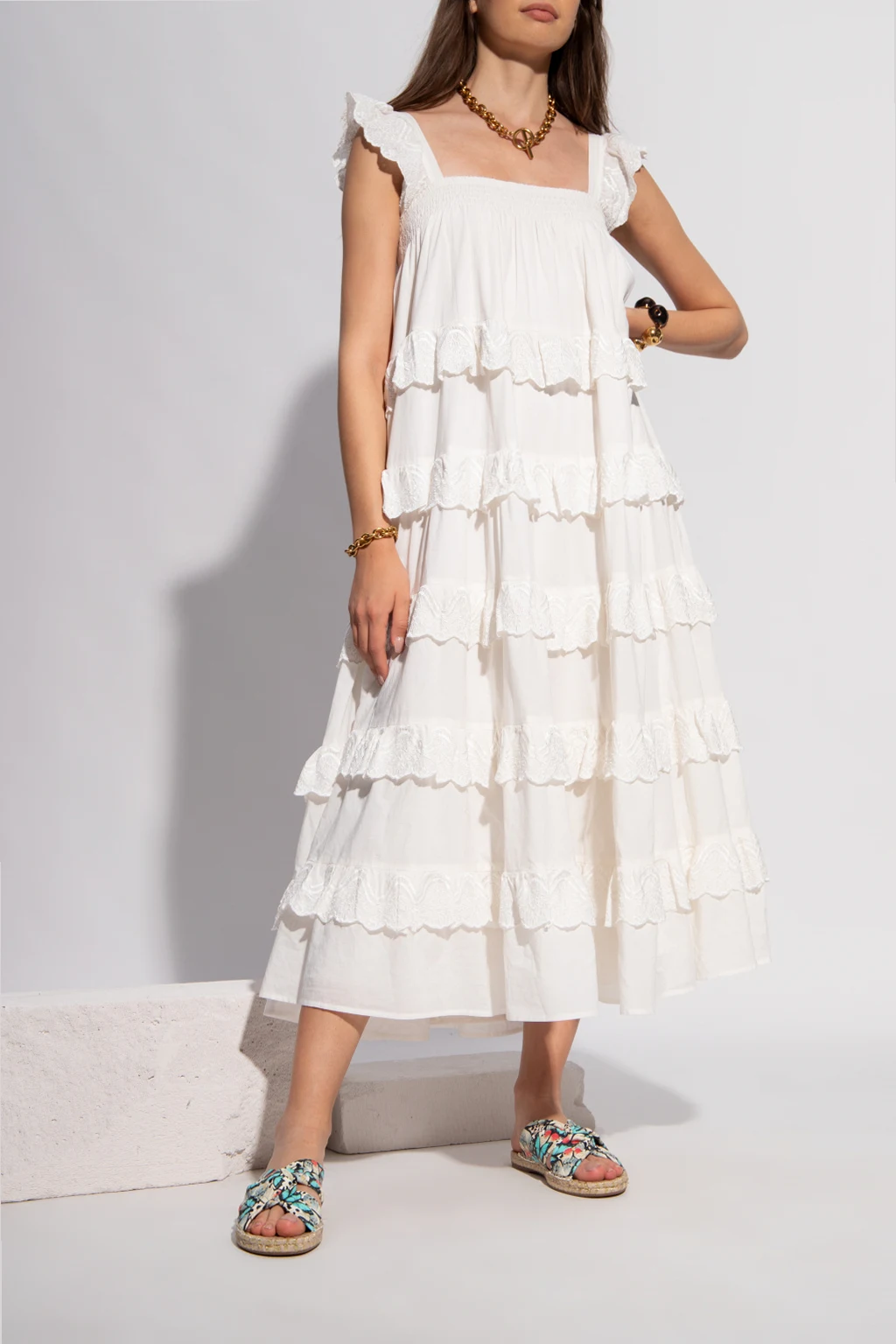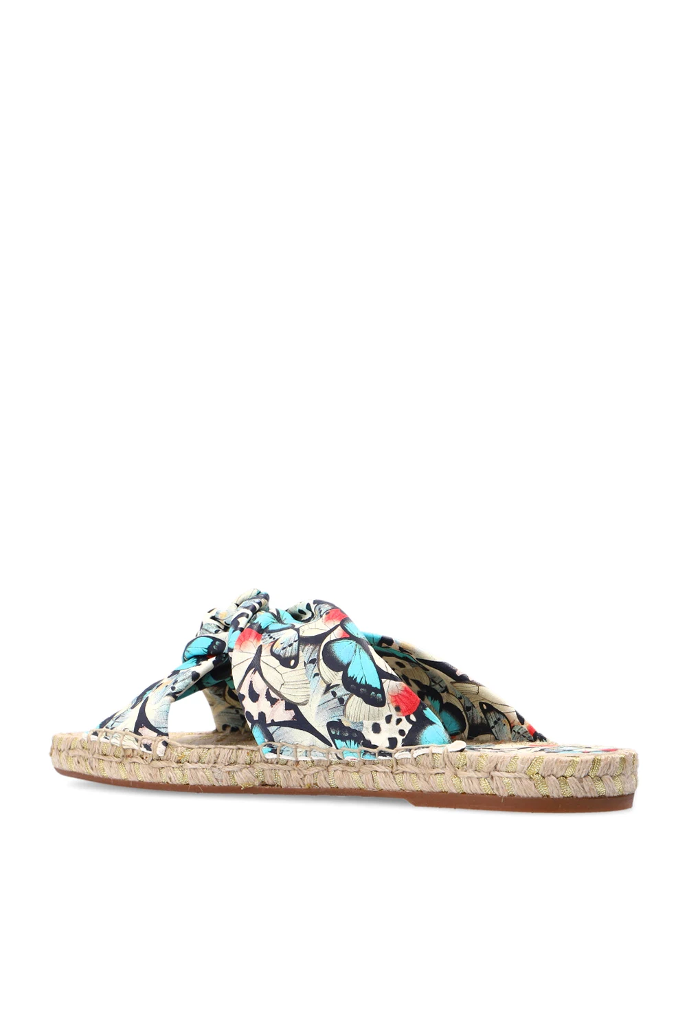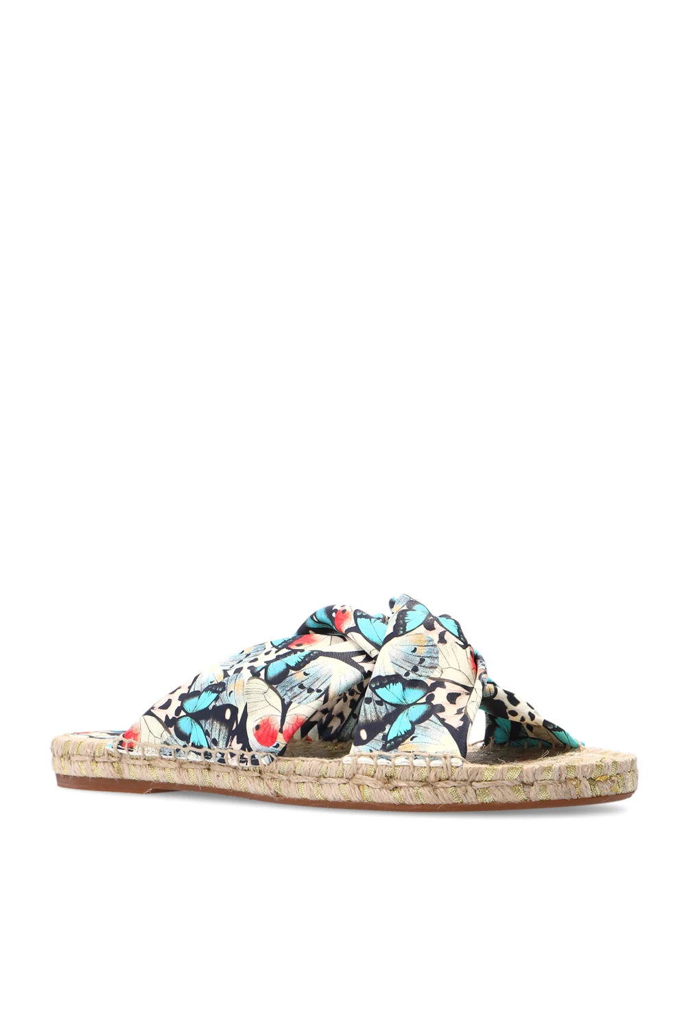 Multicoloured ‘Florita’ slides from Sophia Webster. Crafted from leather, they sit on a natural jute sole with a thin layer of beige caoutchouc and showcase an animal pattern.