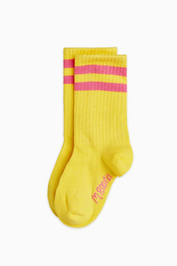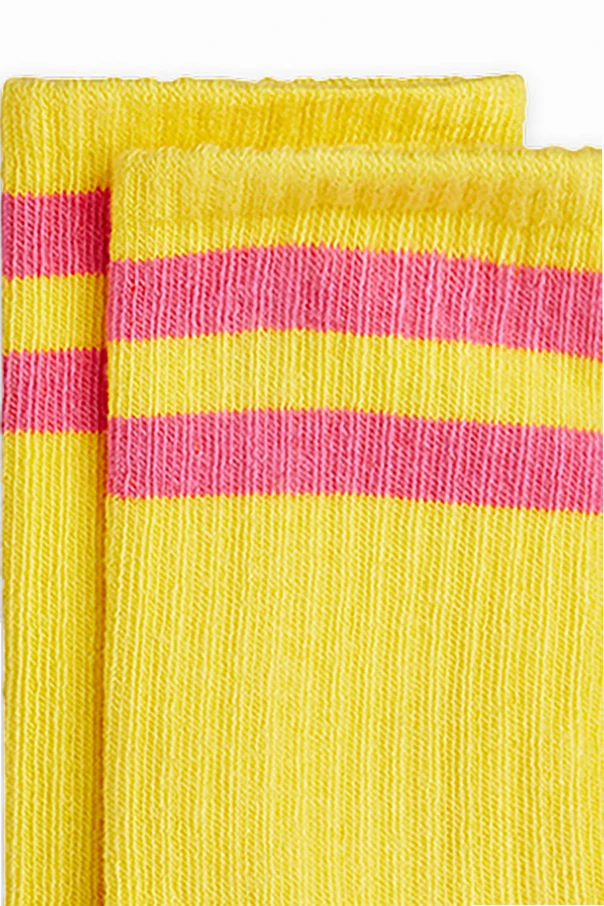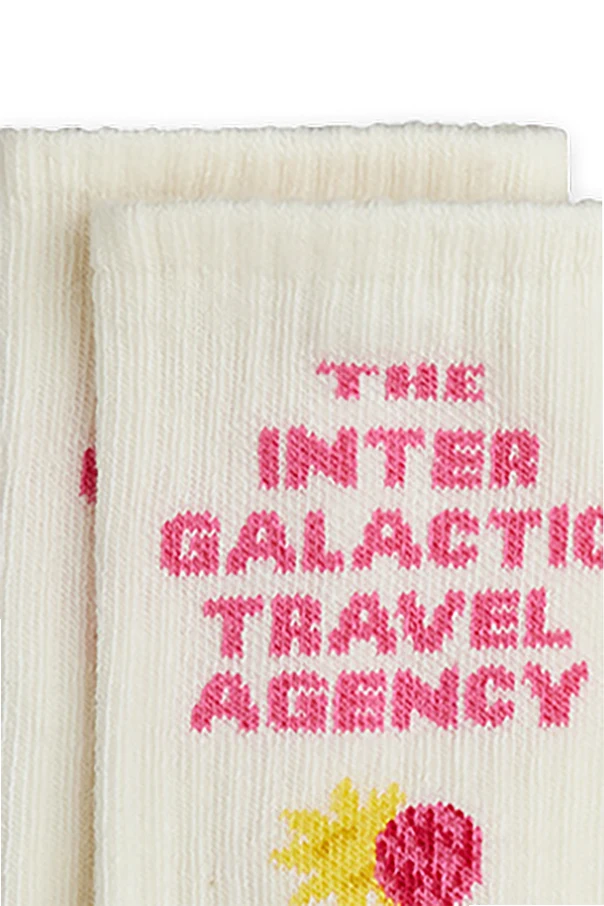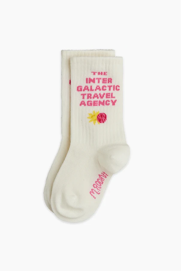 Two sophisticated motifs elevate this collection: radiant yellow socks adorned with delicate pink horizontal stripes, and a refined white (ecru) pair, emblazoned with "THE INTER GALACTIC TRAVEL AGENCY" and adorned with pink and yellow illustrations. Signature branding in distinctive pink font graces the soles, reflecting Mini Rodini's playful yet distinguished identity.
