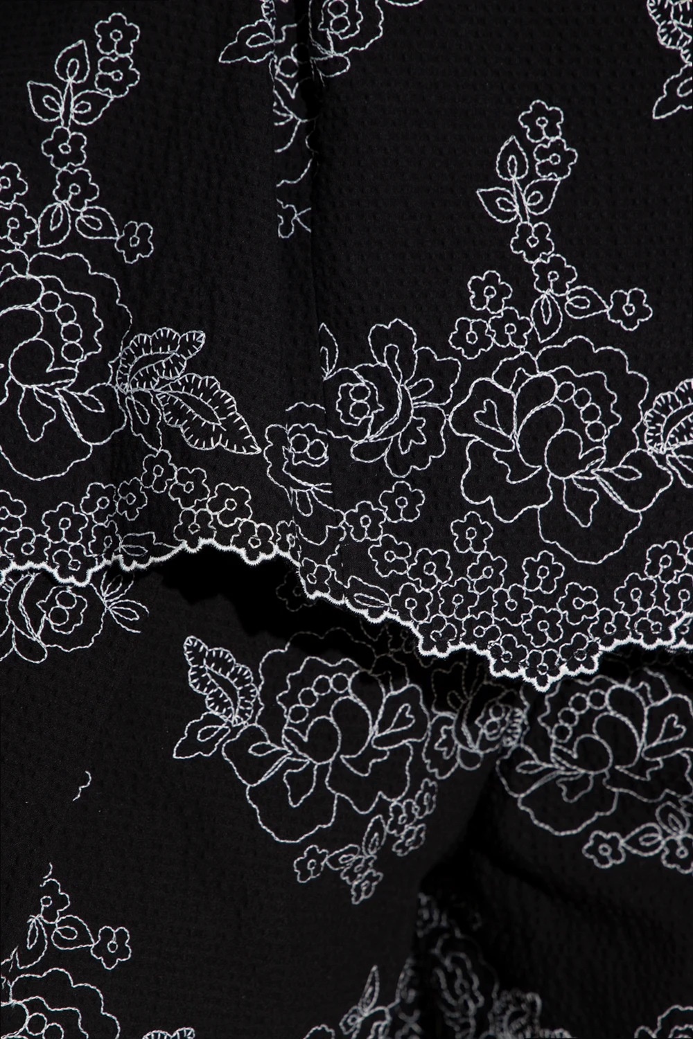 Black ‘Violeta’ shorts from Erdem. Crafted from seersucker cotton with white floral embroidery, this pair features a high-rise waist, a zip fly with a button and hook, two front slip pockets, two back button pockets and decorative scalloped hems.