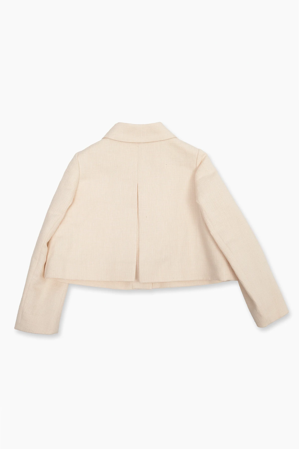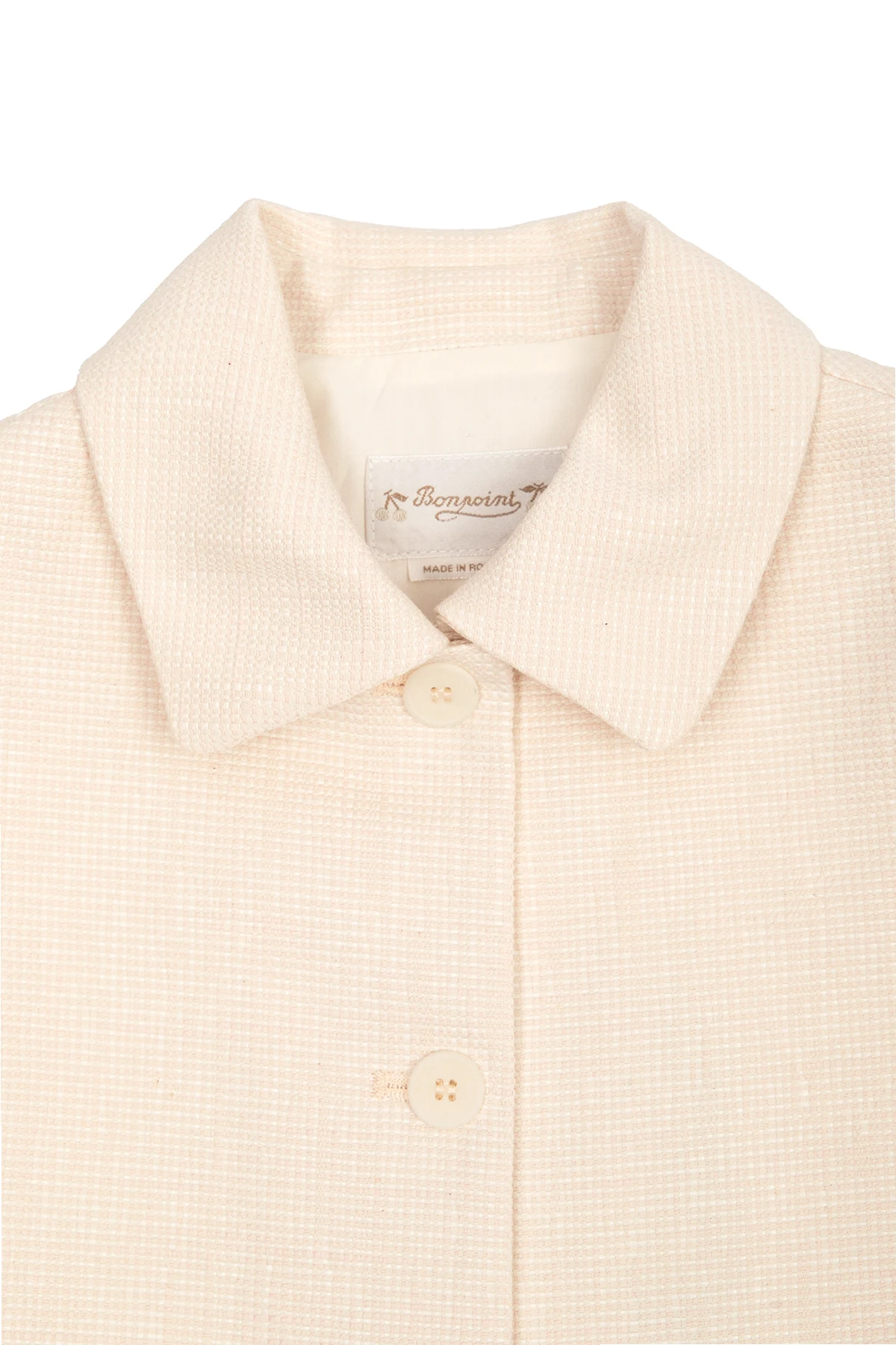 Cream ‘Fancy’ short coat from Bonpoint. Made of a cotton and linen blend, this style features a collared neckline, button fastenings, long sleeves and a decorative pleat on the back.