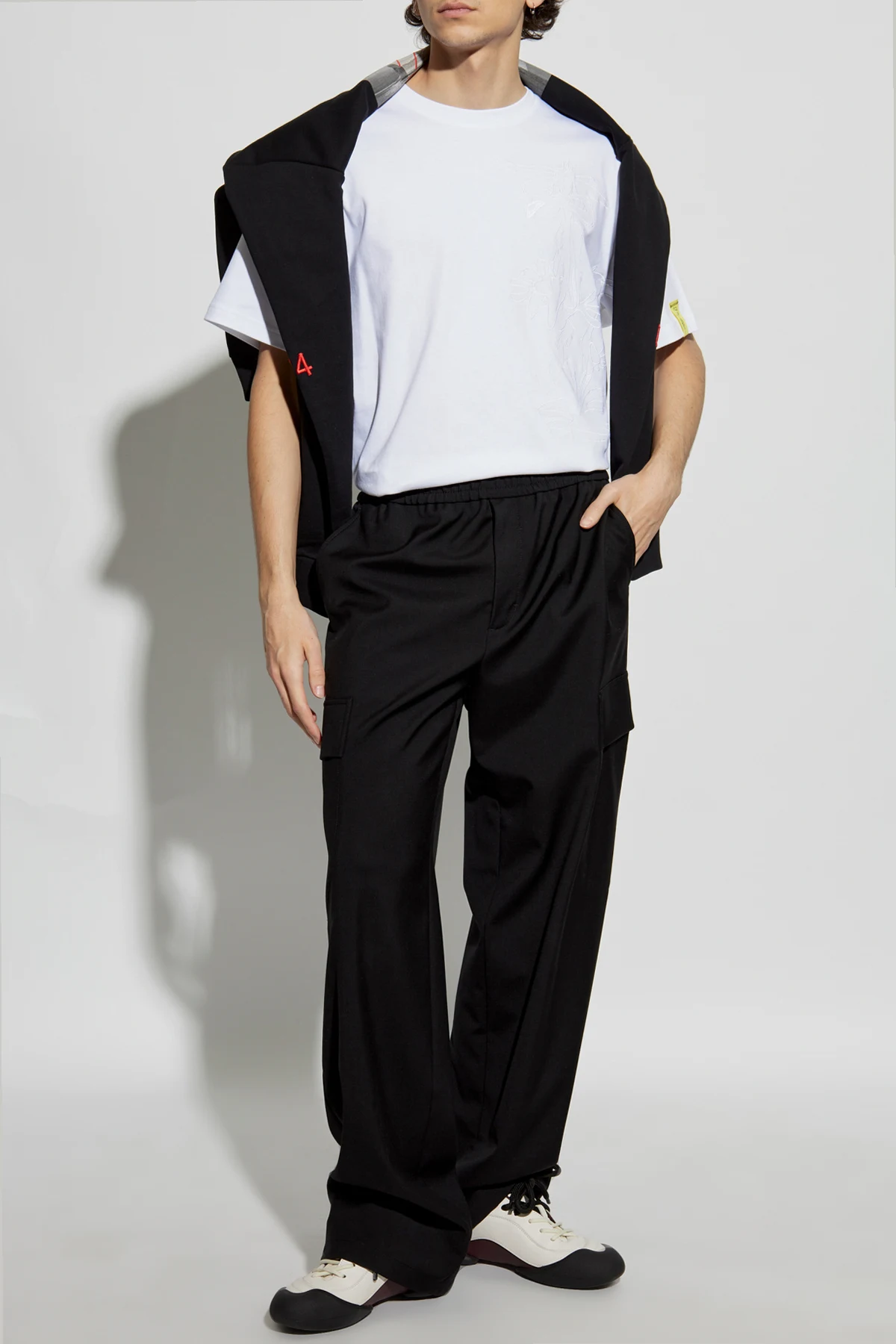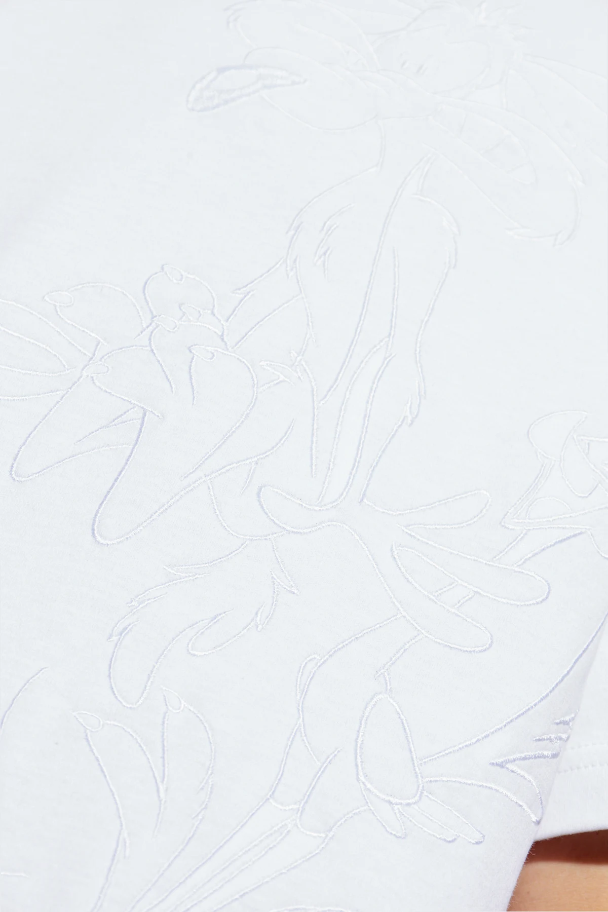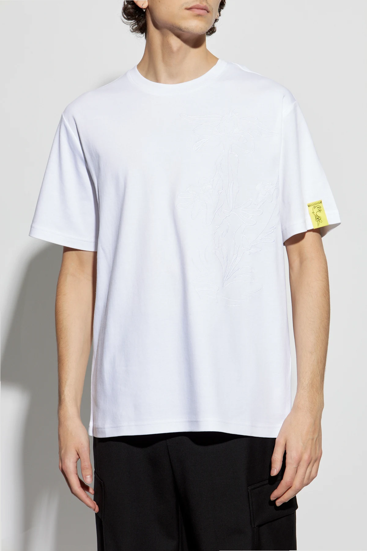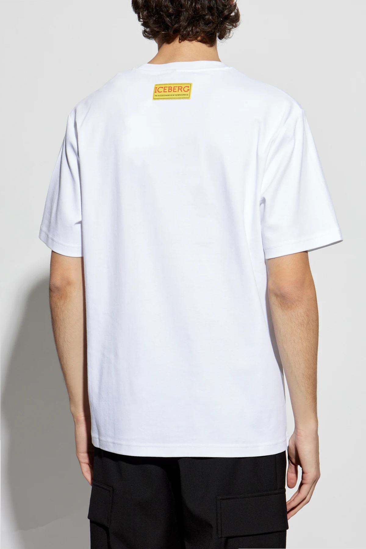 Embrace the whimsical elegance of the Iceberg x Looney Tunes t-shirt, a sublime fusion of high fashion and playful artistry. Crafted from premium cotton, this white short-sleeve garment exudes comfort and sophistication. Its classic silhouette is accentuated by a round neckline and a distinctive yellow patch on the left sleeve, emblazoned with the collection\'s logo. Adding a touch of intrigue, a subtle embossed pattern on the front showcases beloved Looney Tunes characters, while the back features a yellow Iceberg logo beneath the collar, epitomizing the brand\'s flair for pop culture infusion. Since its inception in 1974, Iceberg has been synonymous with avant-garde designs, drawing inspiration from the socio-cultural revolutions of the 60s. This t-shirt captures that spirit, offering a harmonious blend of elegance and nostalgic charm. Why Choose This Product? Timeless, classic design with a playful twist. High-quality cotton for unparalleled comfort. Unique embossed pattern featuring Looney Tunes characters. Iconic branding with yellow logos for a signature touch.